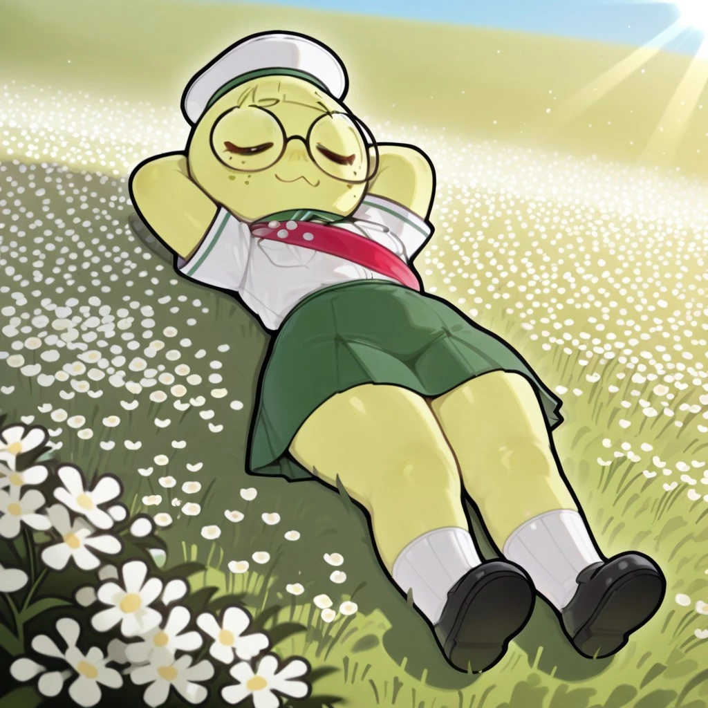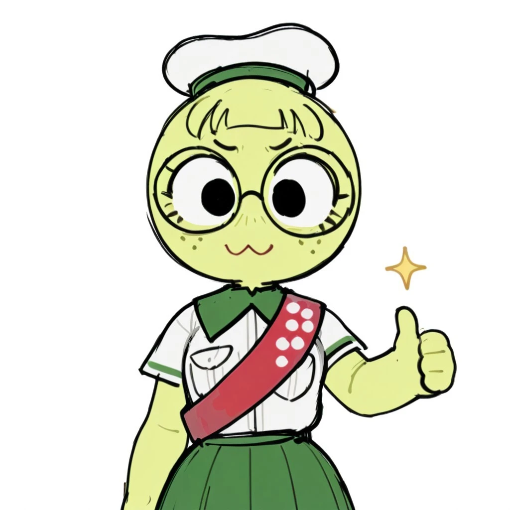 sailor hat,white headwear,glasses,lensless glasses,white shirt,short sleeves,breast pocket,shoulder sash,green skirt,white socks,shoes,black footwear,