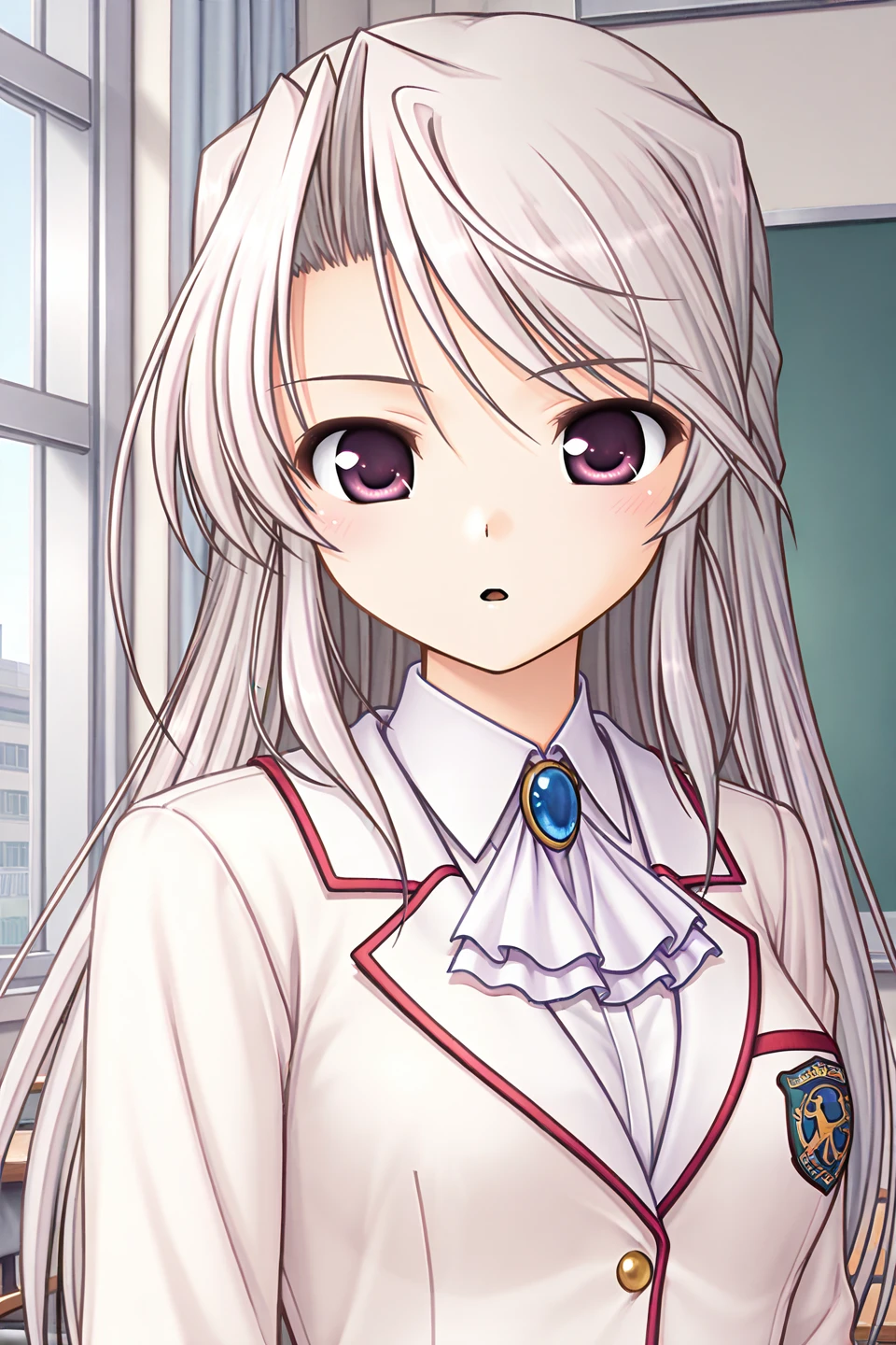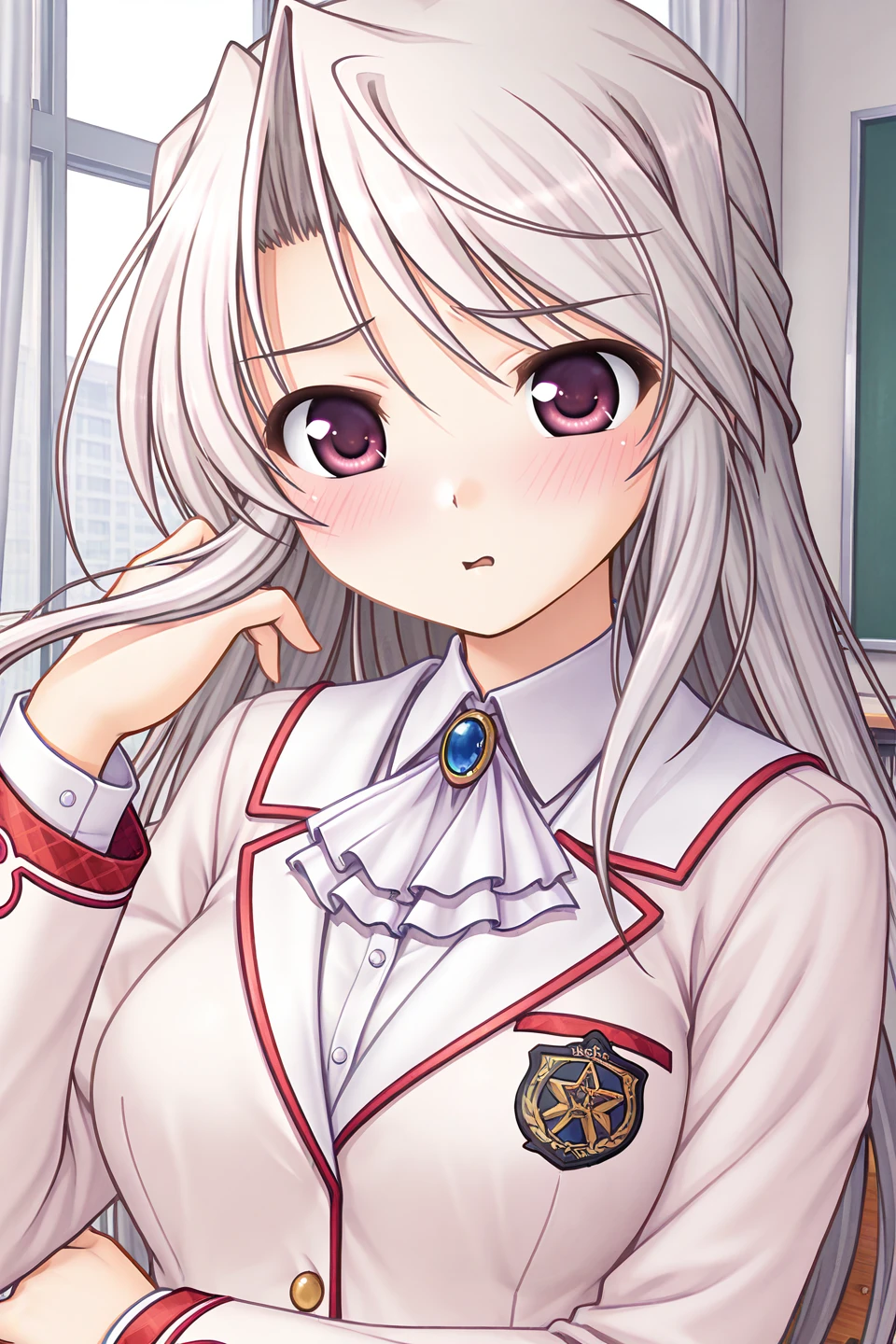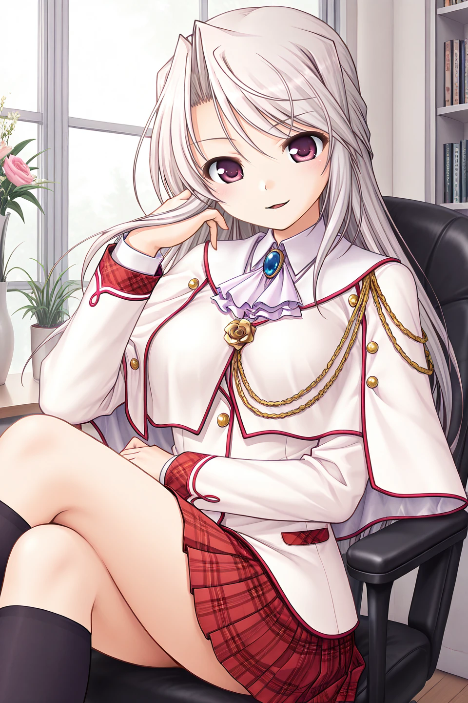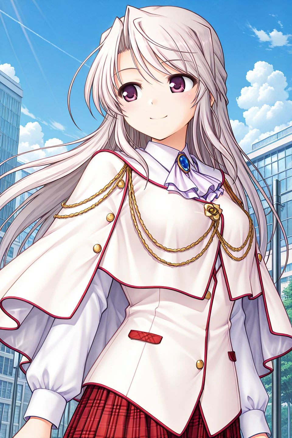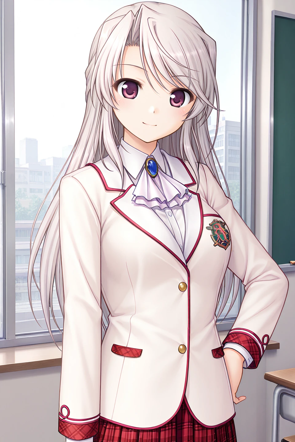school uniform,winter uniform,blazer,pink jacket,pocket,brooch,blue gemstone,light purple ascot,emblem,long sleeves,white shirt,collared shirt,buttons,red skirt,miniskirt,pleated skirt,plaid skirt,