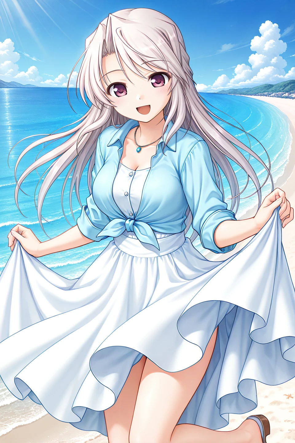 casual,blouse,blue dress shirt,tied shirt,front-tie top,collared shirt,ring necklace,collarbone,cleavage,long sleeves,sleeves past elbows,sleeves rolled up,sundress,white dress,buttons,sleeveless dress,long dress,flare skirt,