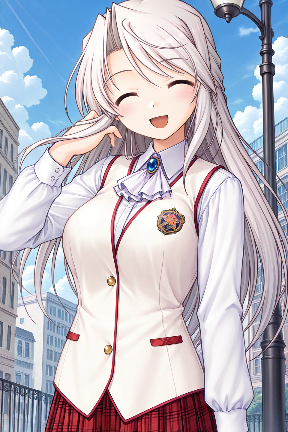 summer uniform,school uniform,brooch,blue gemstone,light purple ascot,pink vest,white dress shirt,collared shirt,buttons,long sleeves,red skirt,plaid skirt,pleated skirt,miniskirt,