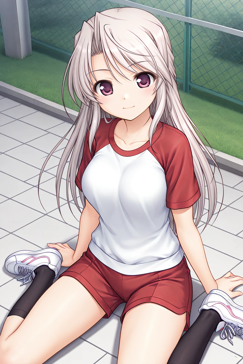 gym uniform,sportswear,t-shirt,collarbone,white shirt,raglan sleeves,red sleeves,short sleeves,red shorts,short shorts,bare legs,kneehighs,black socks,sneakers,