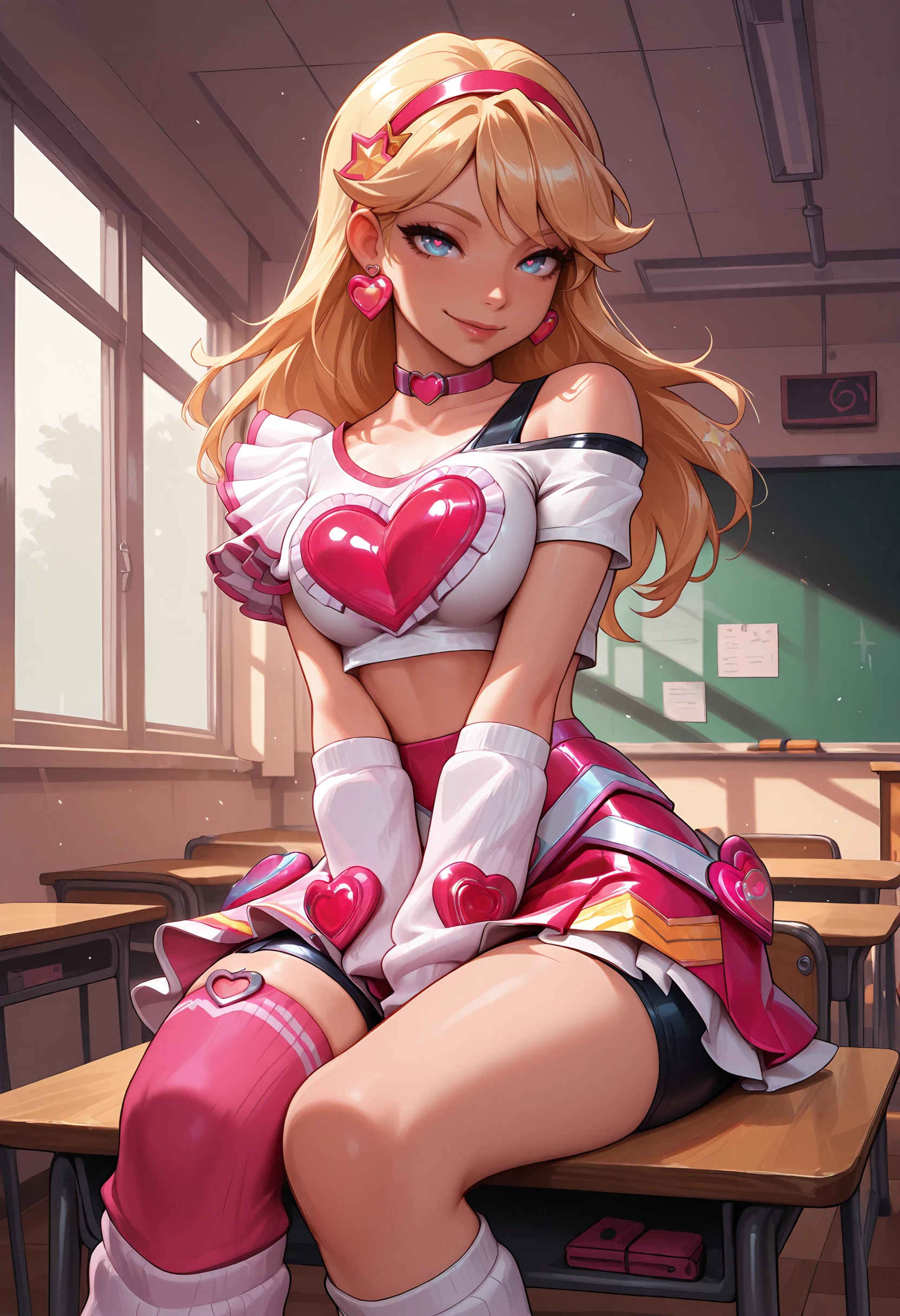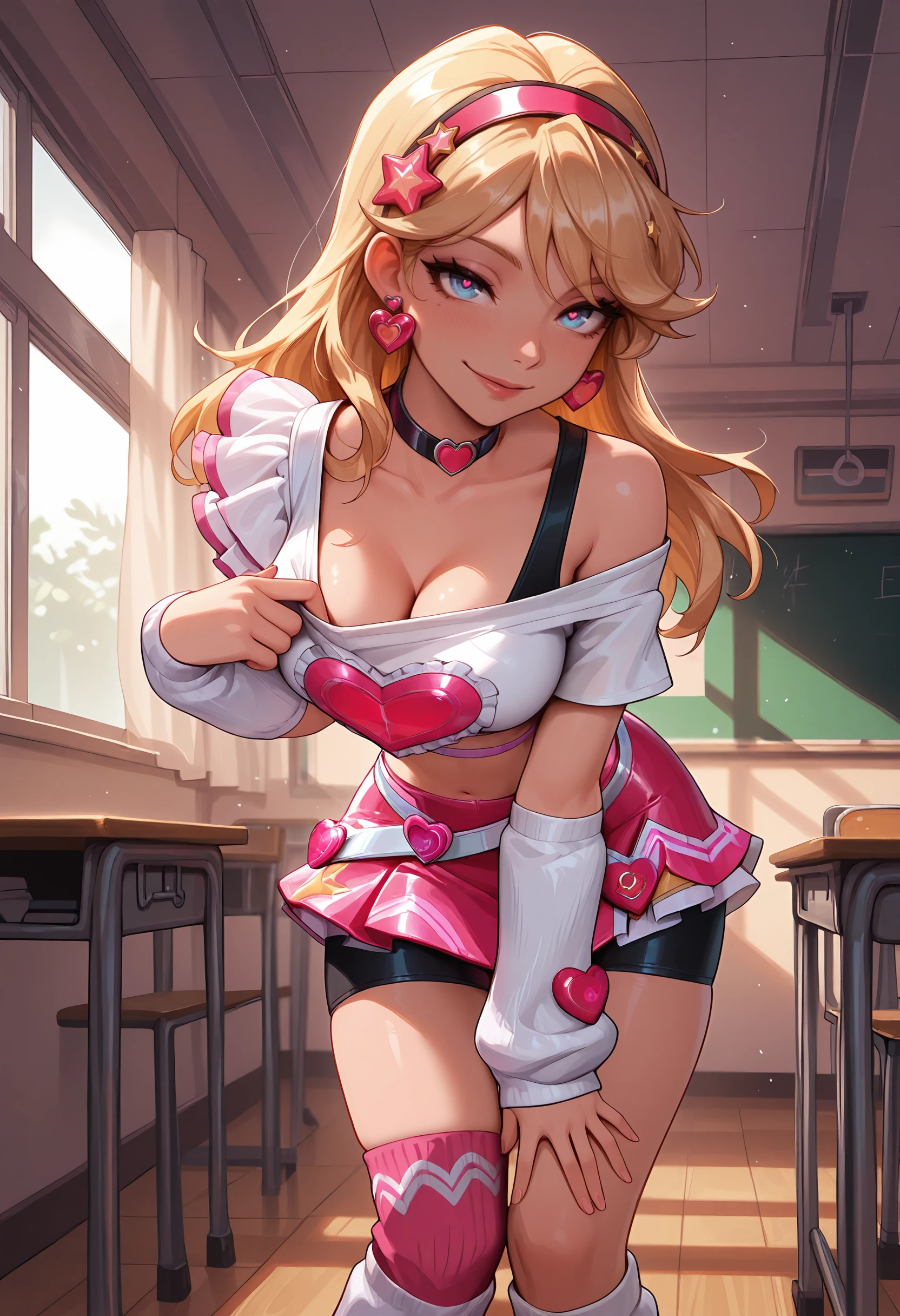sluxil, medium breasts, long hair, blonde hair, skirt, hairband, blue eyes, jewelry, detached sleeves, heart, heart choker, crop top, midriff, single off shoulder, arm warmers, leg warmers, single thighhigh, asymmetrical legwear, bike shorts under skirt, heart earrings, star hair ornament, magical girl,I use V12 WAI-NSFW-illustrious-SDXL checkpoint for my images.
