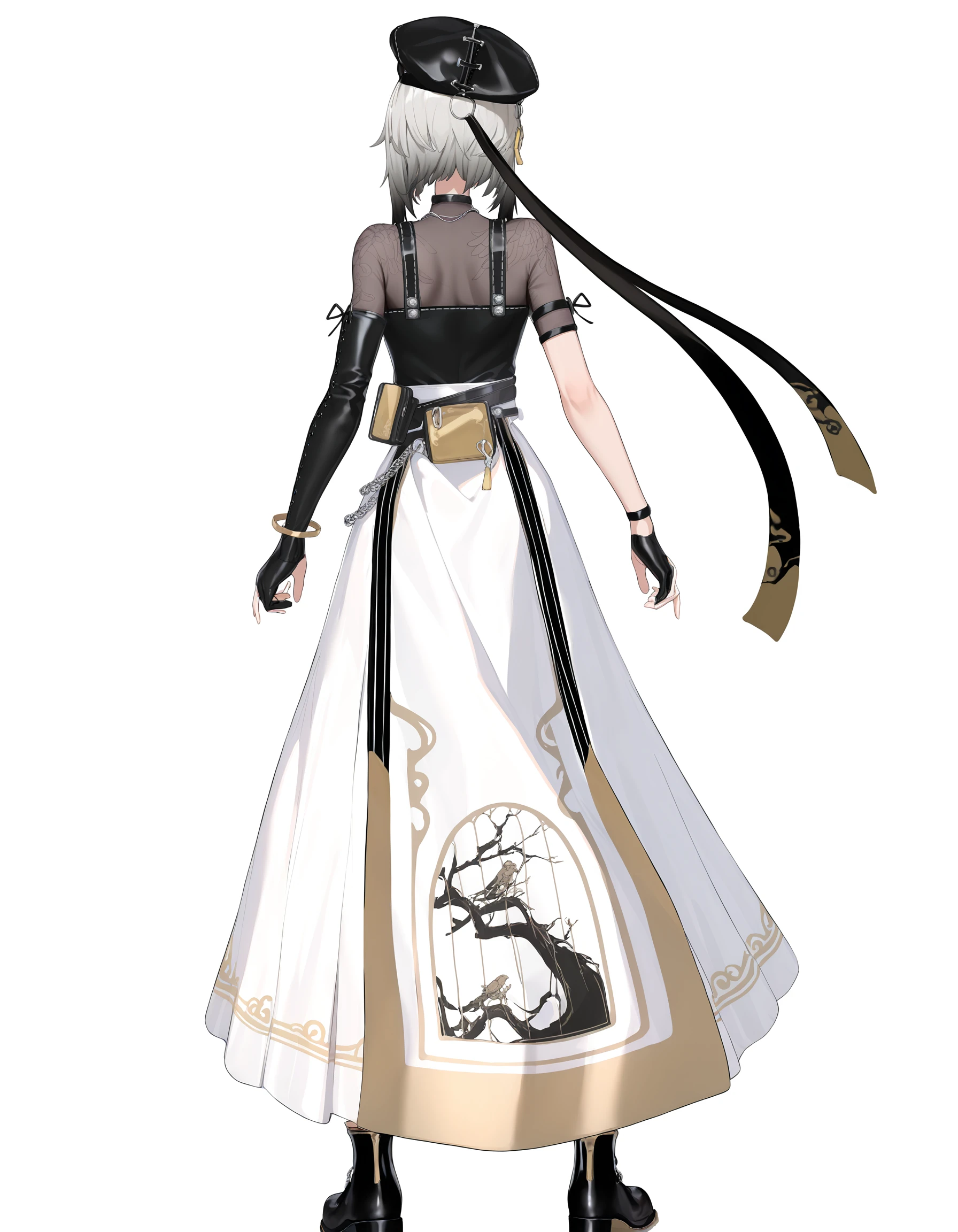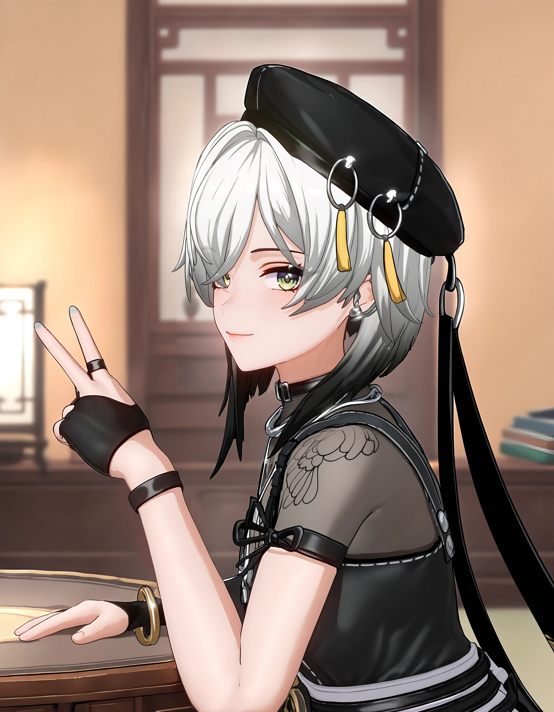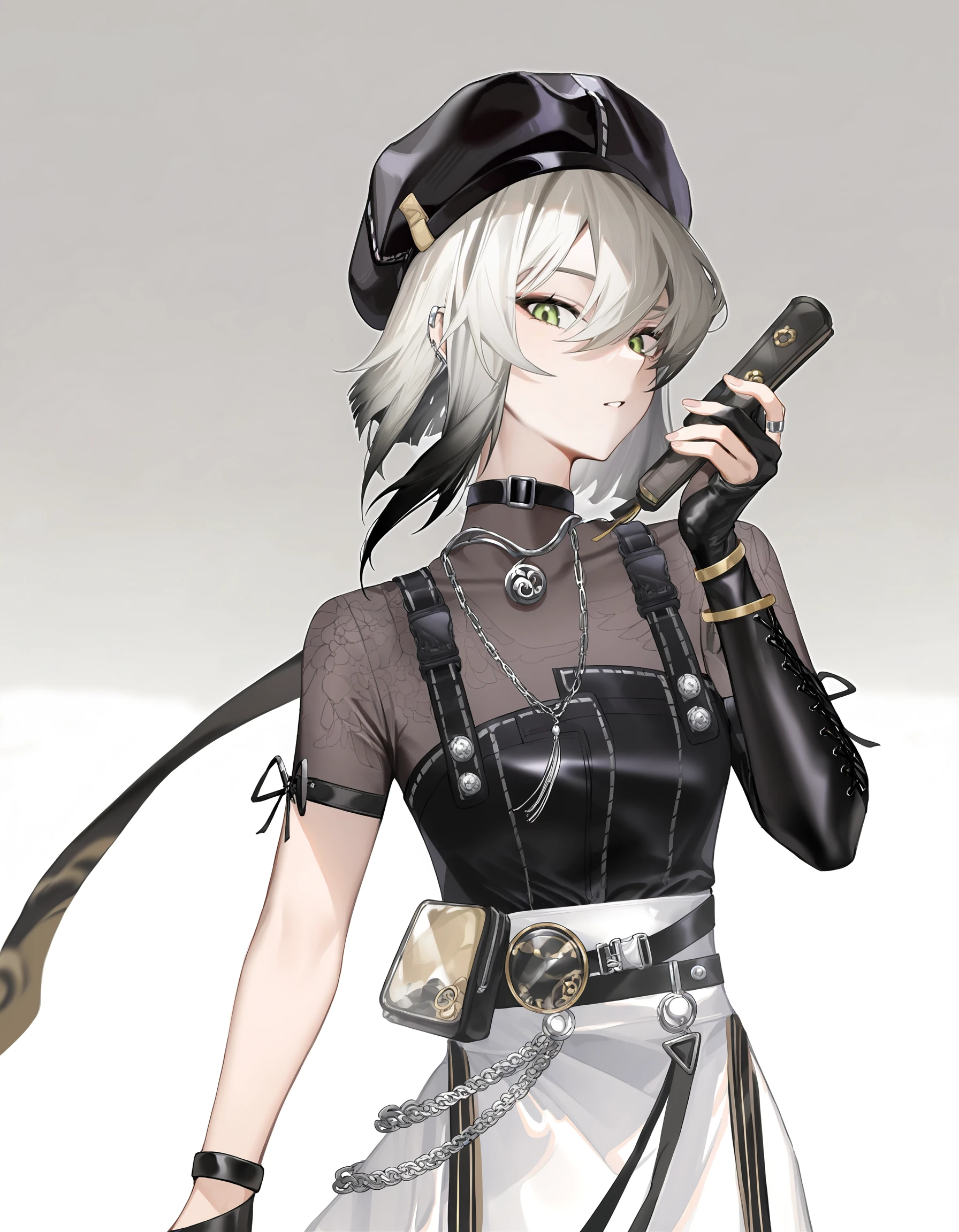 yubing,1girl,solo,green eyes,hat,multicolored hair,black hair,hair between eyes,white hair,short hair,jewelry,black headwear,choker,chain,see-through,short sleeves,skirt,