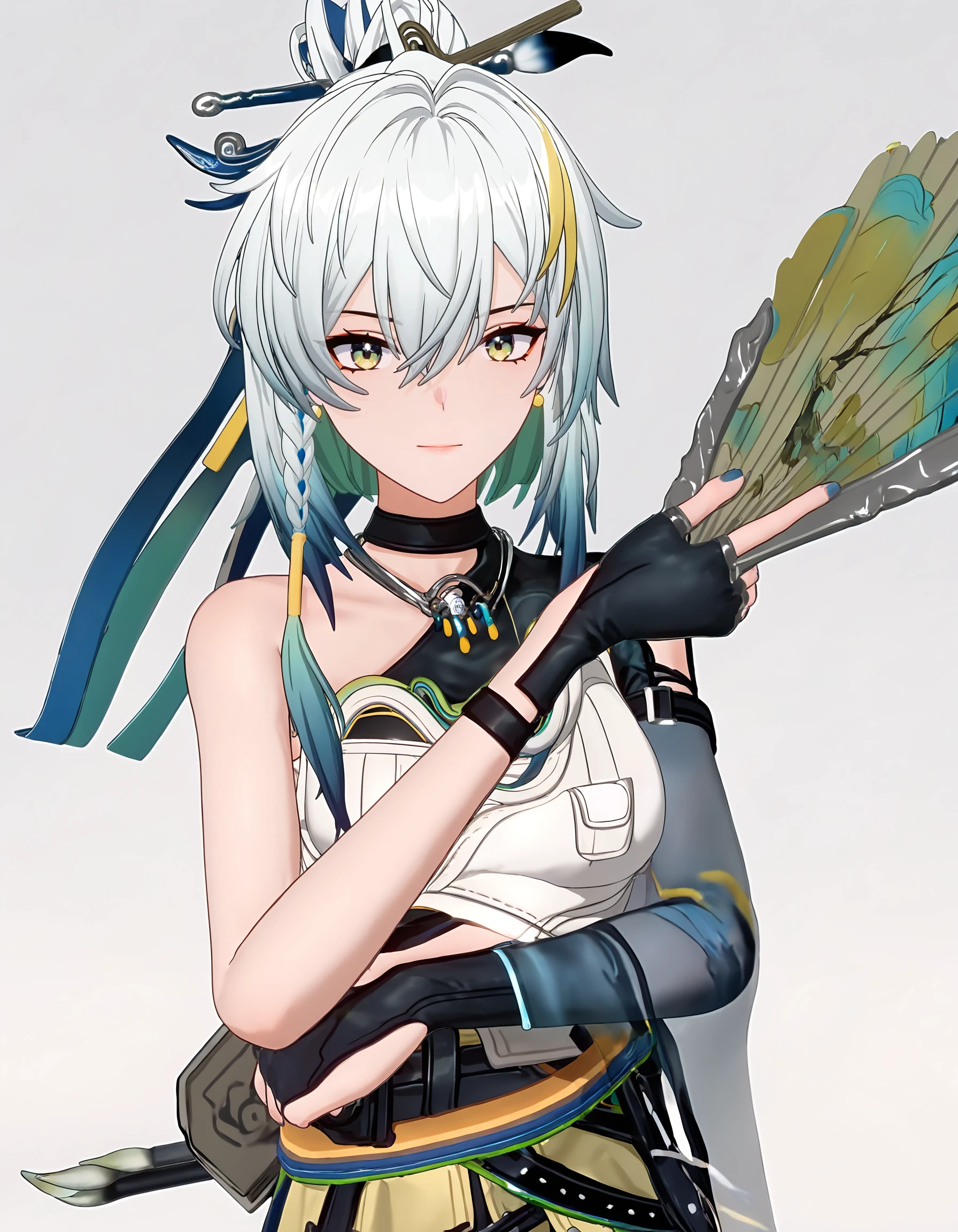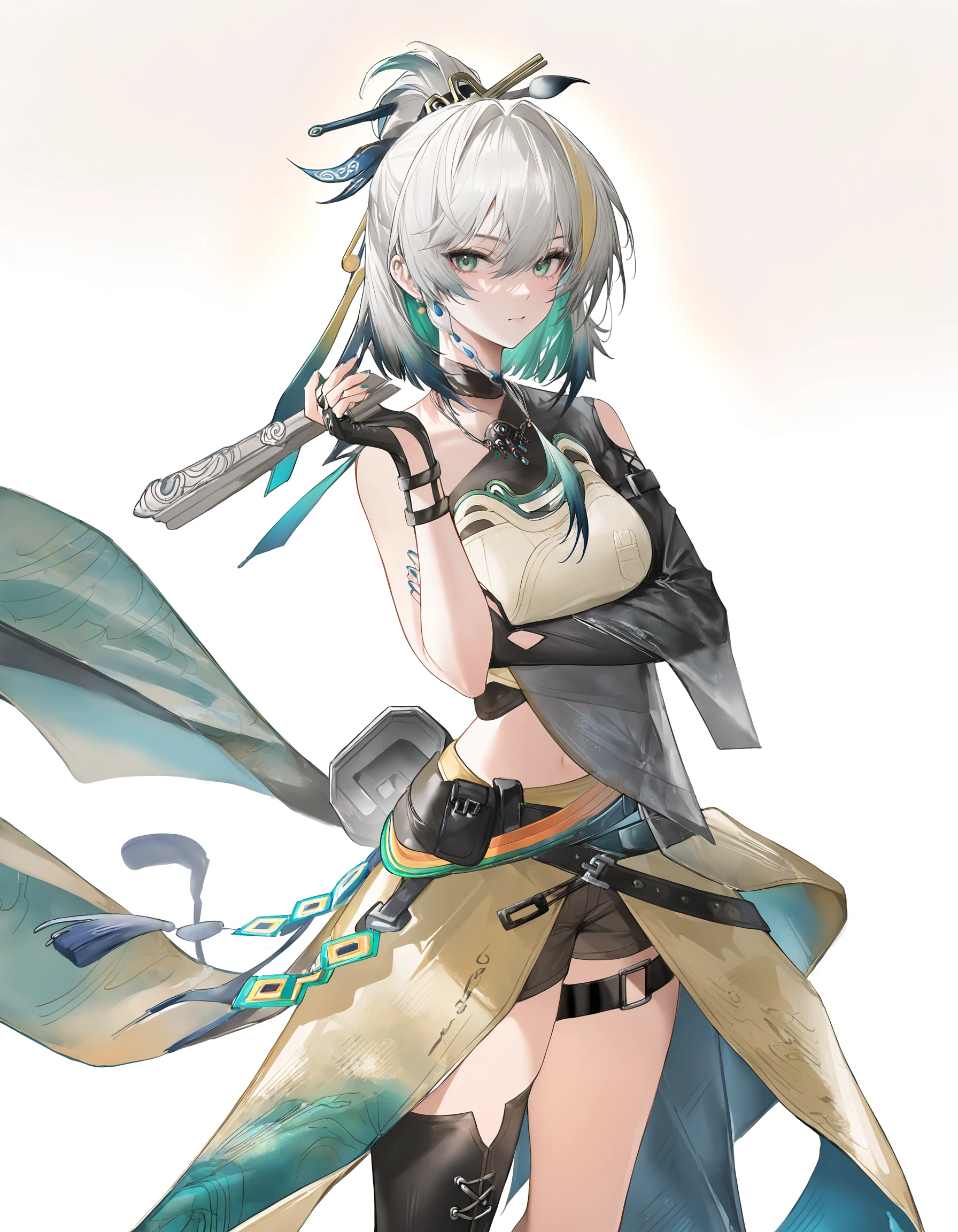 yubing2,1girl,solo,multicolored hair,hair ornament,earrings,hair between eyes,bangs,green eyes,jewelry,fingerless gloves,black gloves,midriff,nail polish,black nails,white shirt,bare shoulders,gloves,