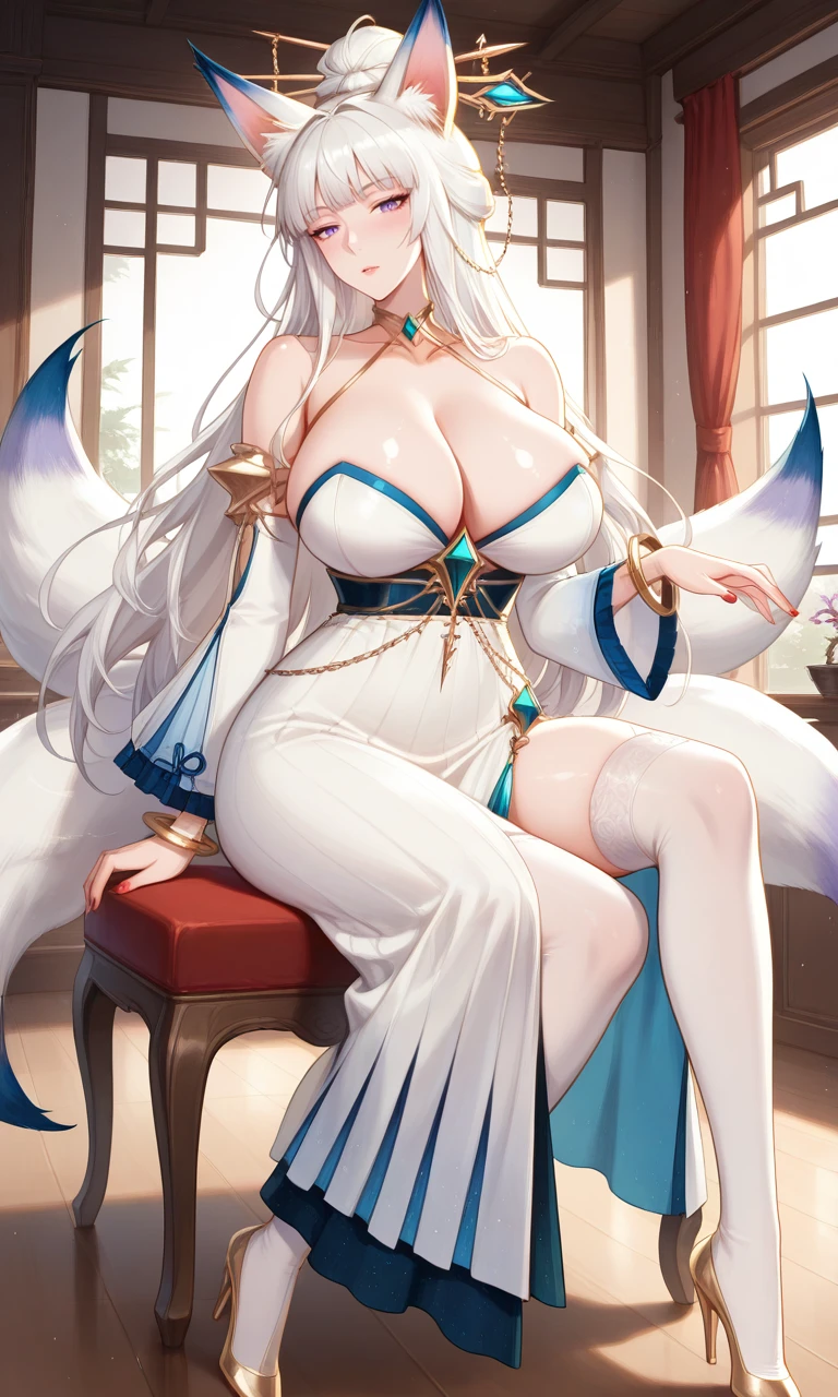 Yuri(sk), Mild Violet eyes, white hair, long hair, Bun hair, bangs, ahoge, hair stick, fox ears, three tails, fox tail, red nail, cleavage, white dress, side slit, white sleeve protector, gold accessories, blue decorations, white stocking, gold high heels,