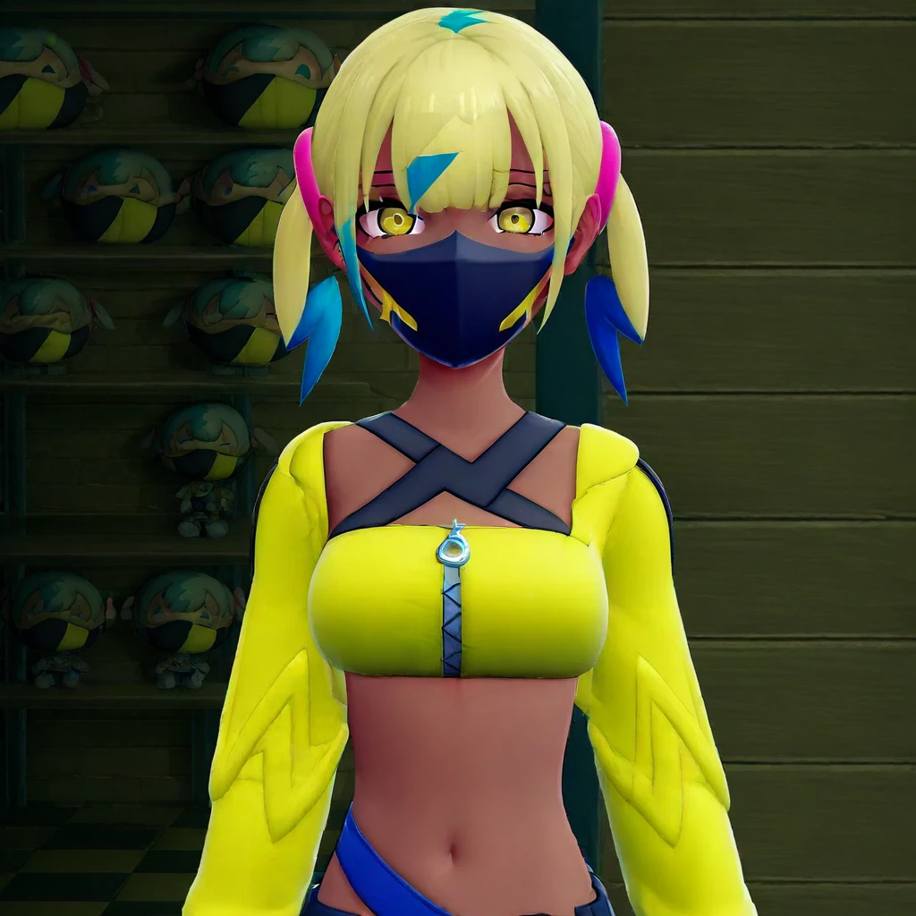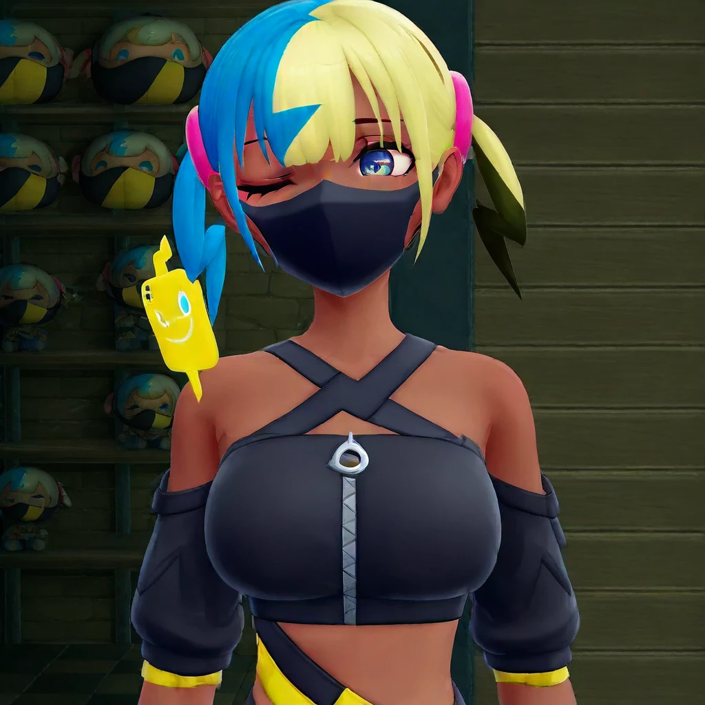 canari, /(pokemon/), official style, dark skin, multicolored hair, two-tone hair, blue hair, blonde hair, twintails, blue eyes, hair ornament, mask, yellow jacket, hooded jacket, open jacket, long sleeves, sleeves past wrists, crop top, midriff, zipper, nail polish, pants, pouch, belt,canari, dark-skinned female, multicolored hair, two-tone hair, blonde hair, blue hair, twintails, blue eyes, hair ornament, mouth mask, yellow jacket, hooded jacket, open jacket, long sleeves, sleeves past wrists, yellow bandeau, crop top, midriff, zipper, nail polish, yellow nails, blue nails, pants, pouch, belt, white footwear