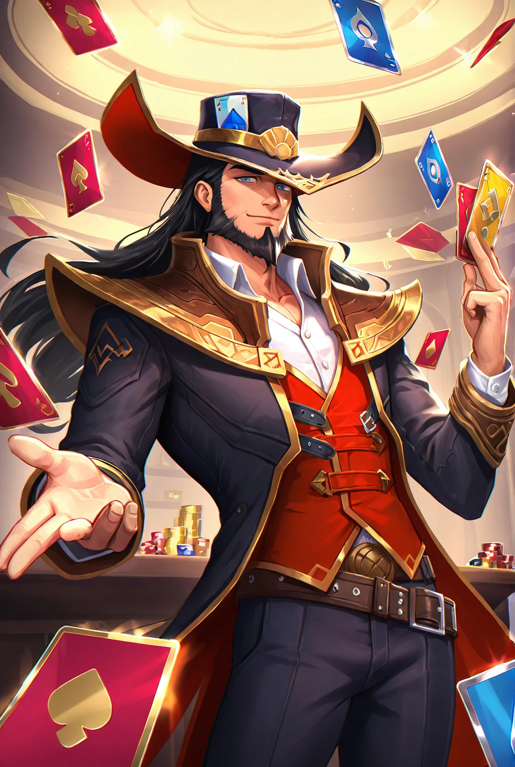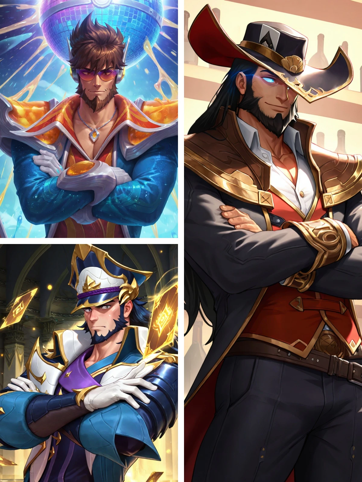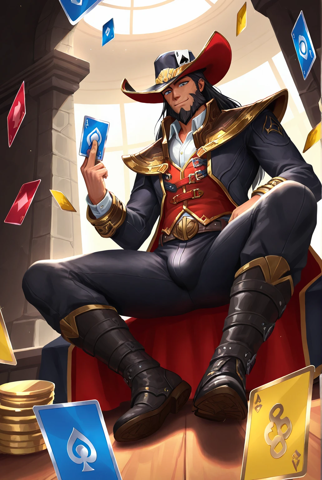 space groove twisted fate, brown hair,facial hair,tinted eyewear,armor,sunglasses,beard,white gloves,spiked hair,pants,necklace,long sleeves