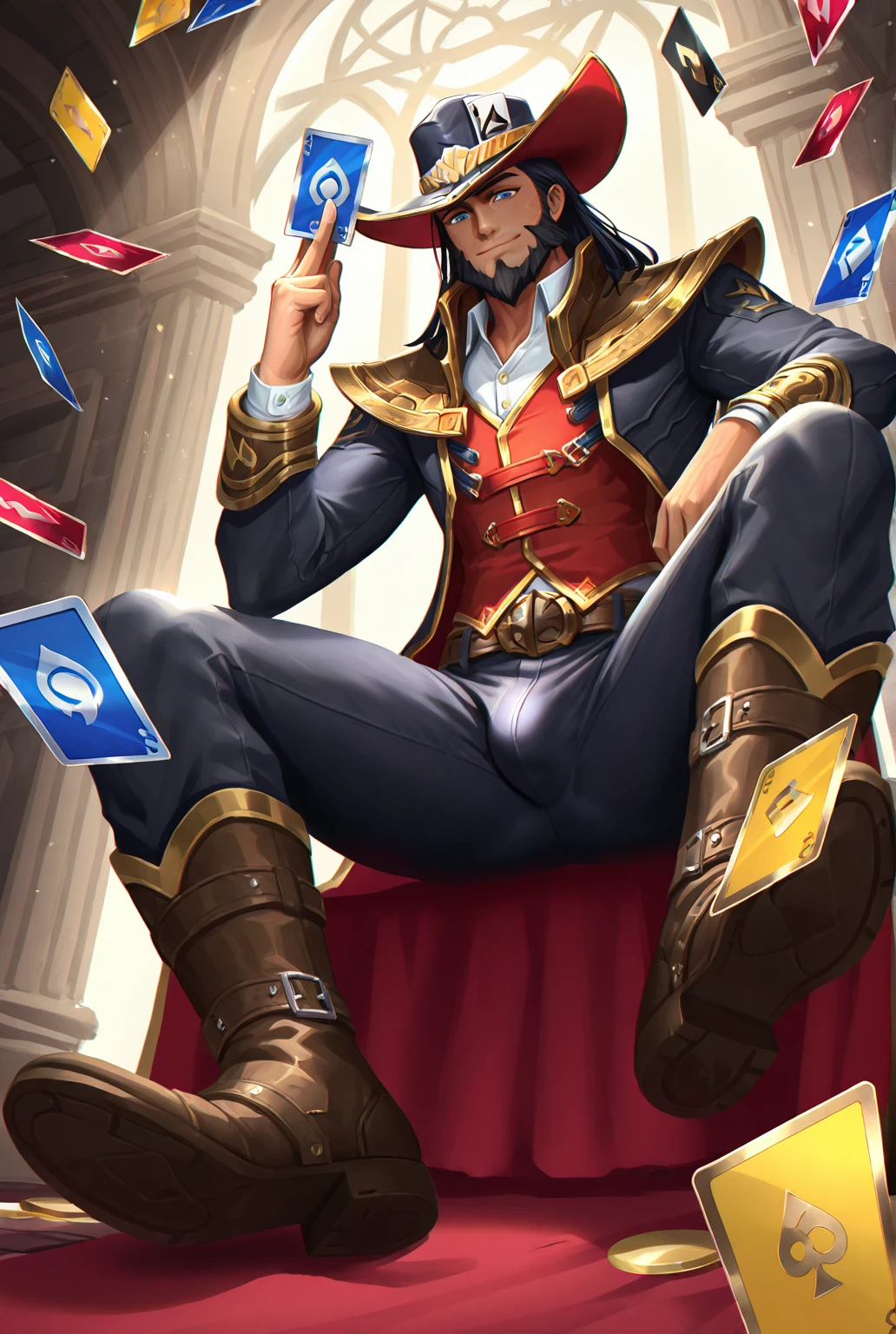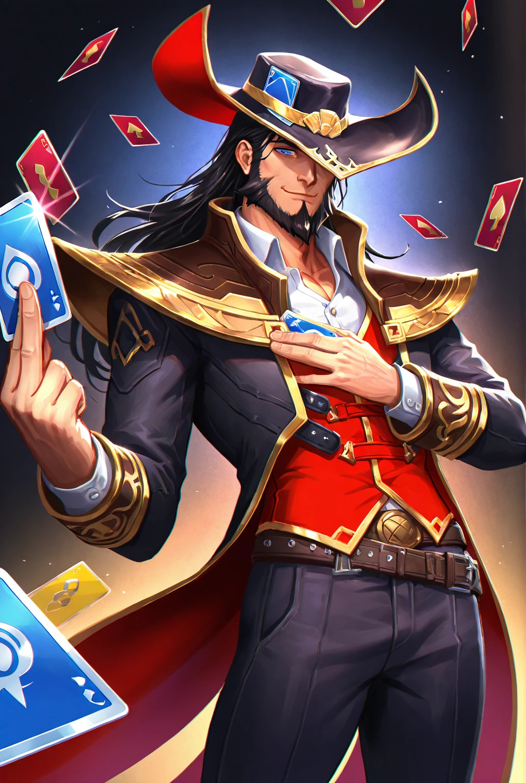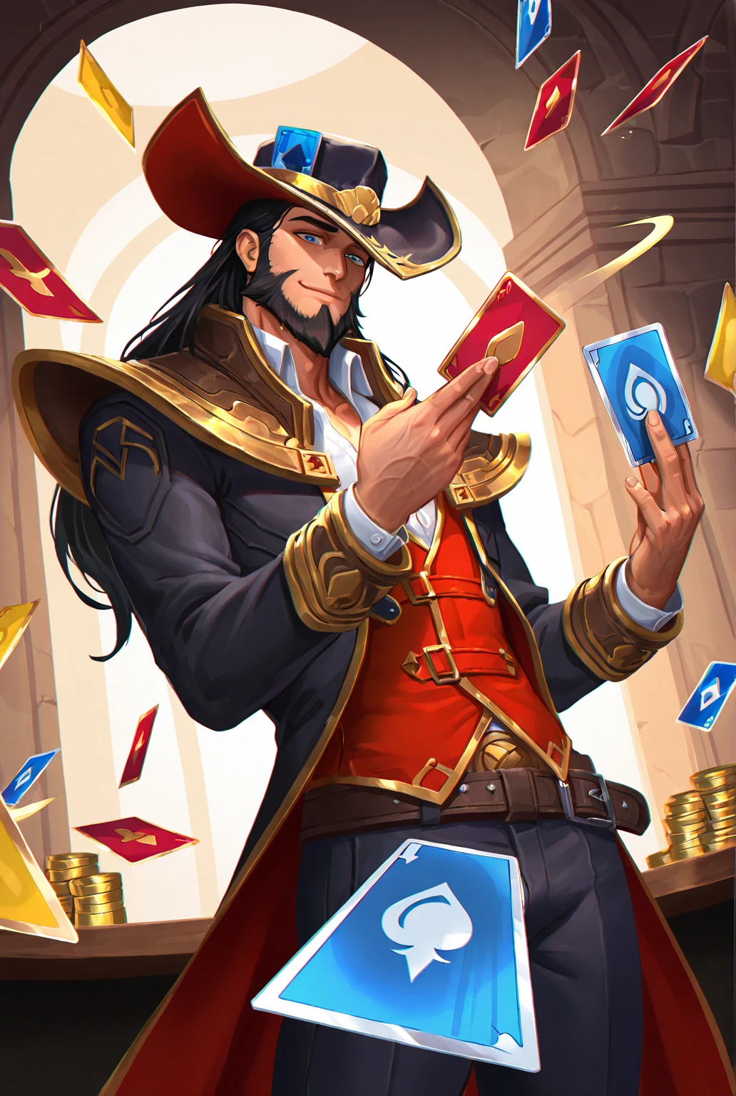 space groove twisted fate, brown hair,facial hair,tinted eyewear,armor,sunglasses,beard,white gloves,spiked hair,pants,necklace,long sleeves