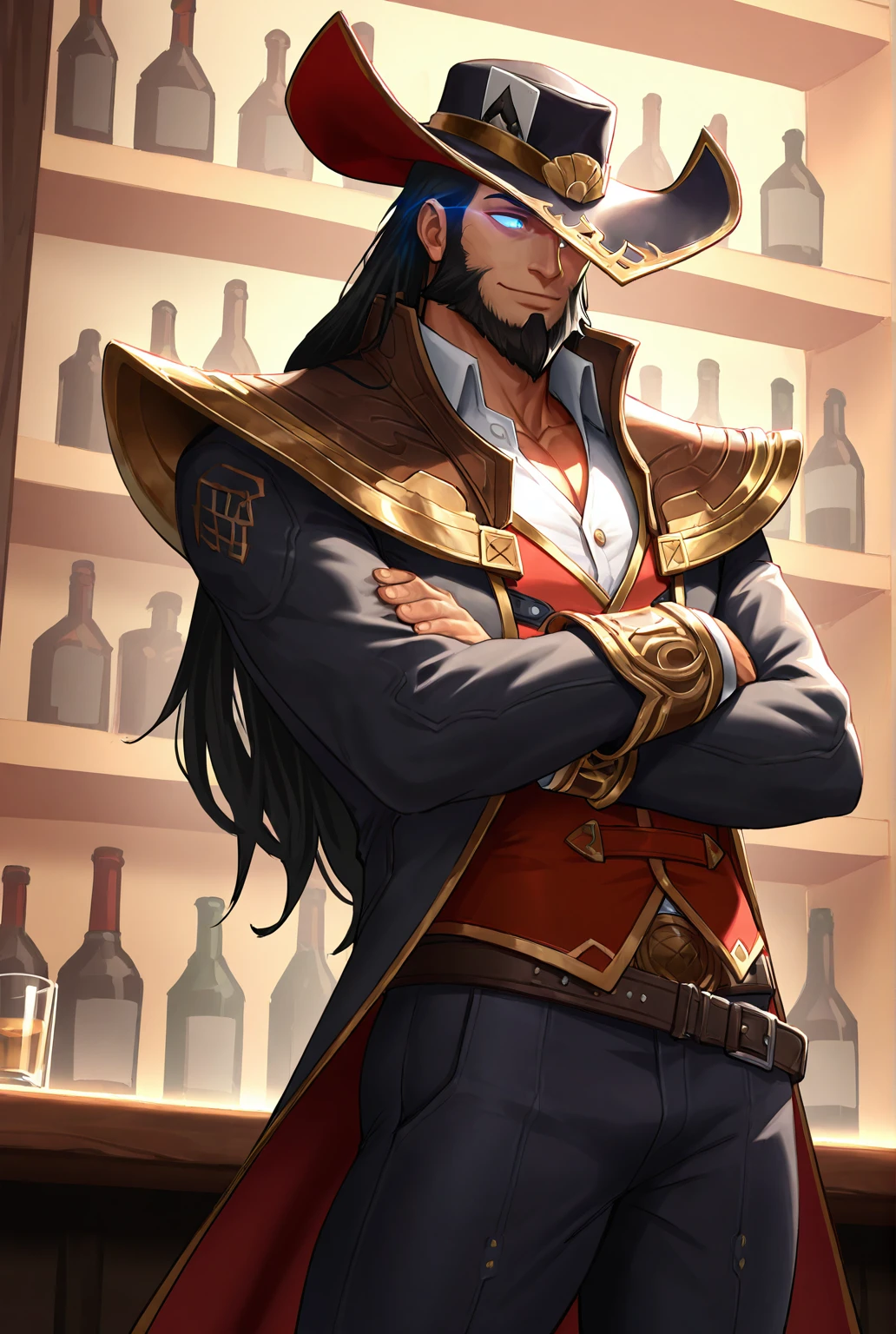 twisted f4te, hat,facial hair,beard,black hair,long hair,belt,coat,red vest,pants,blue eyes, boots