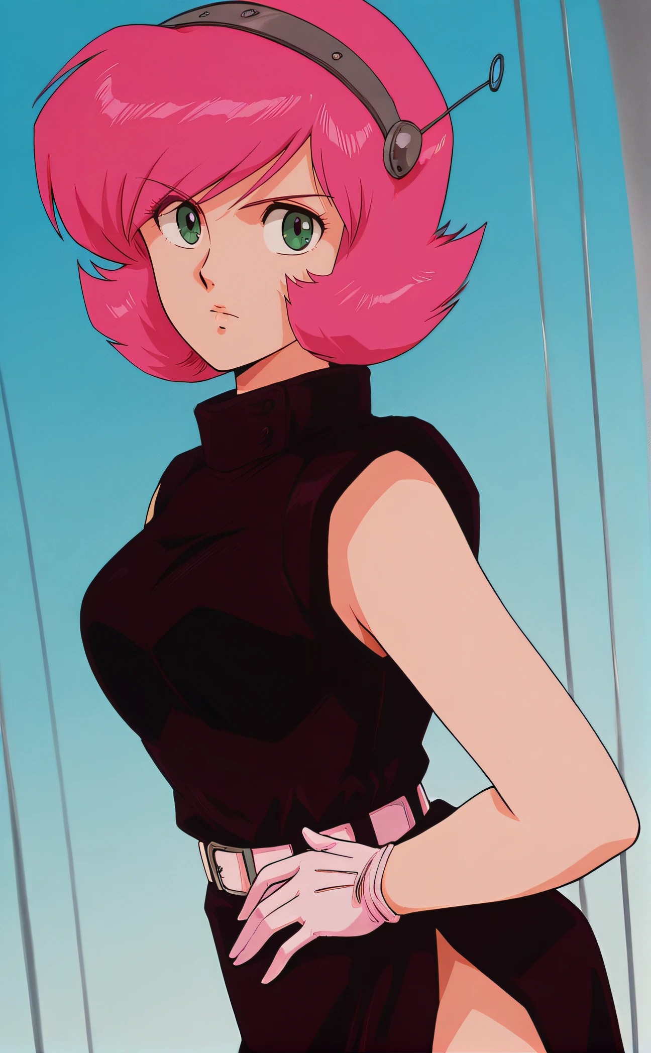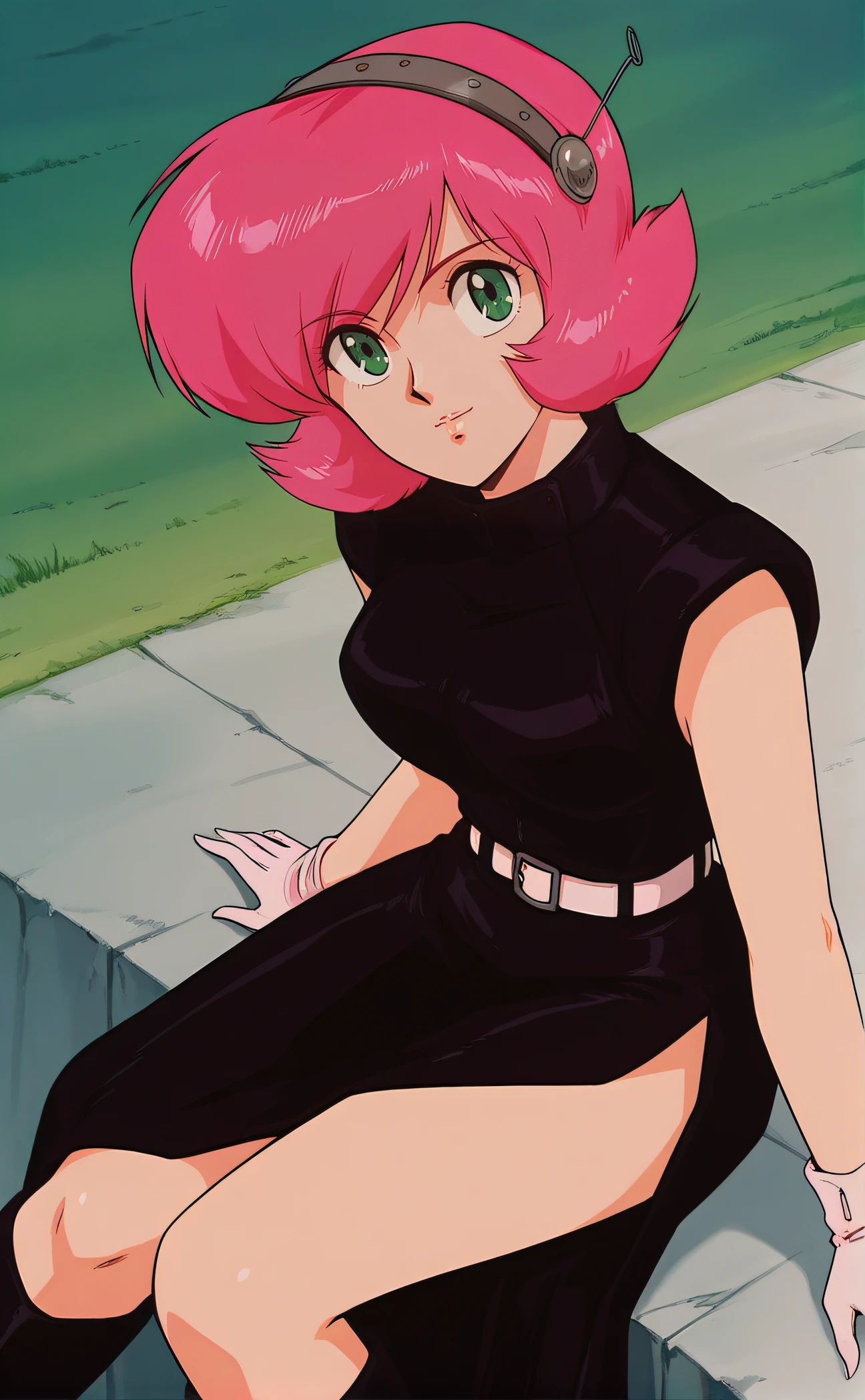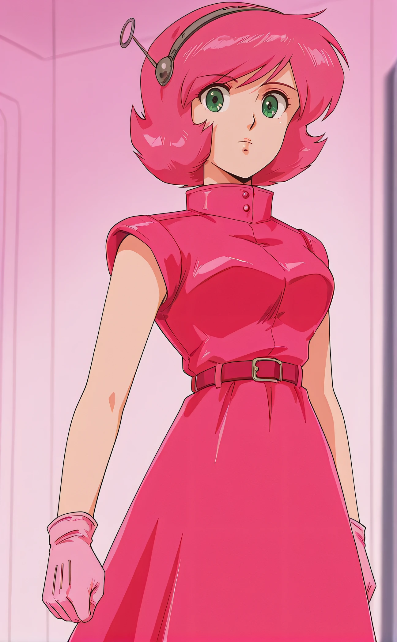 maria, 1980s (style), retro style, pink hair, green eyes, short hair, hairband