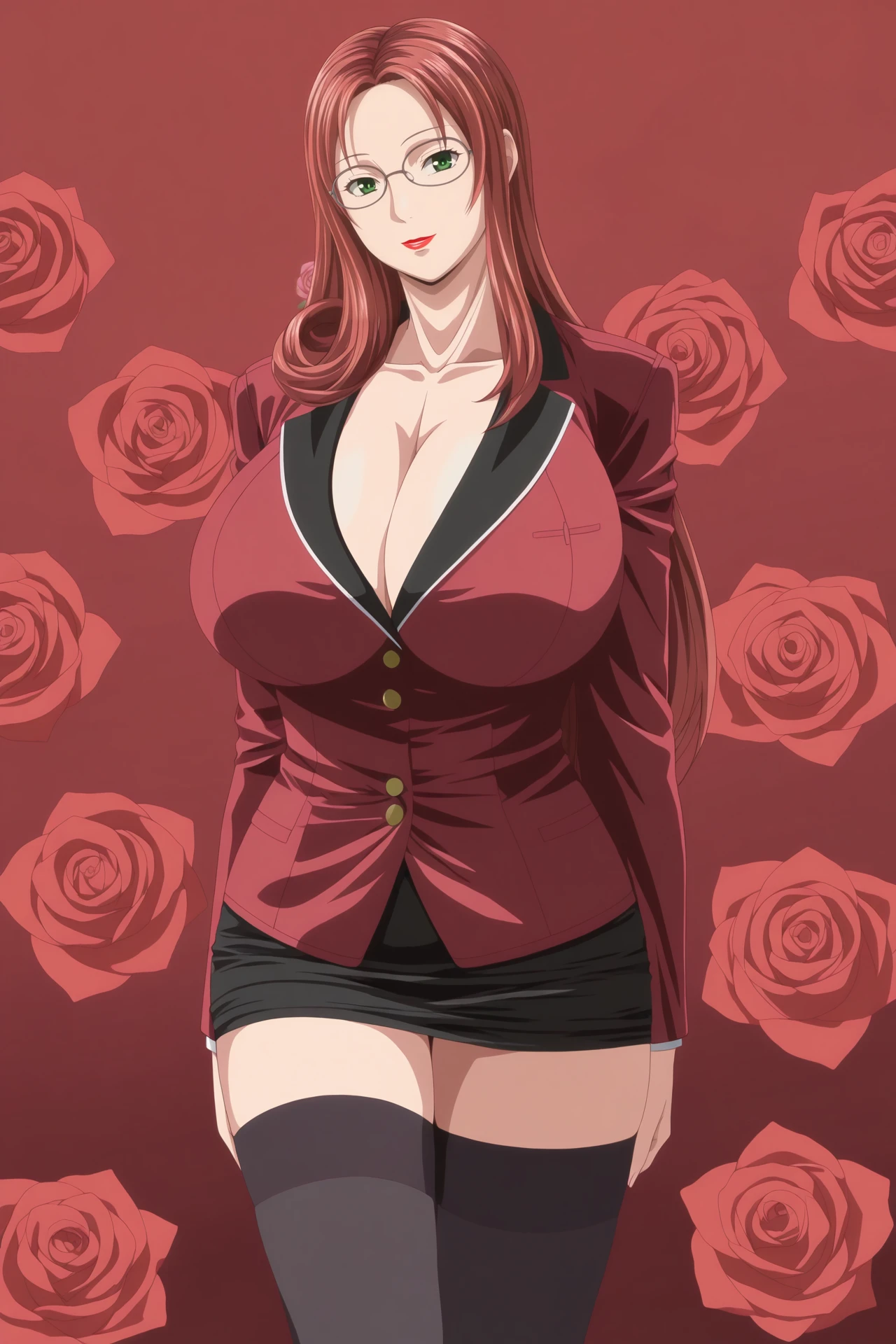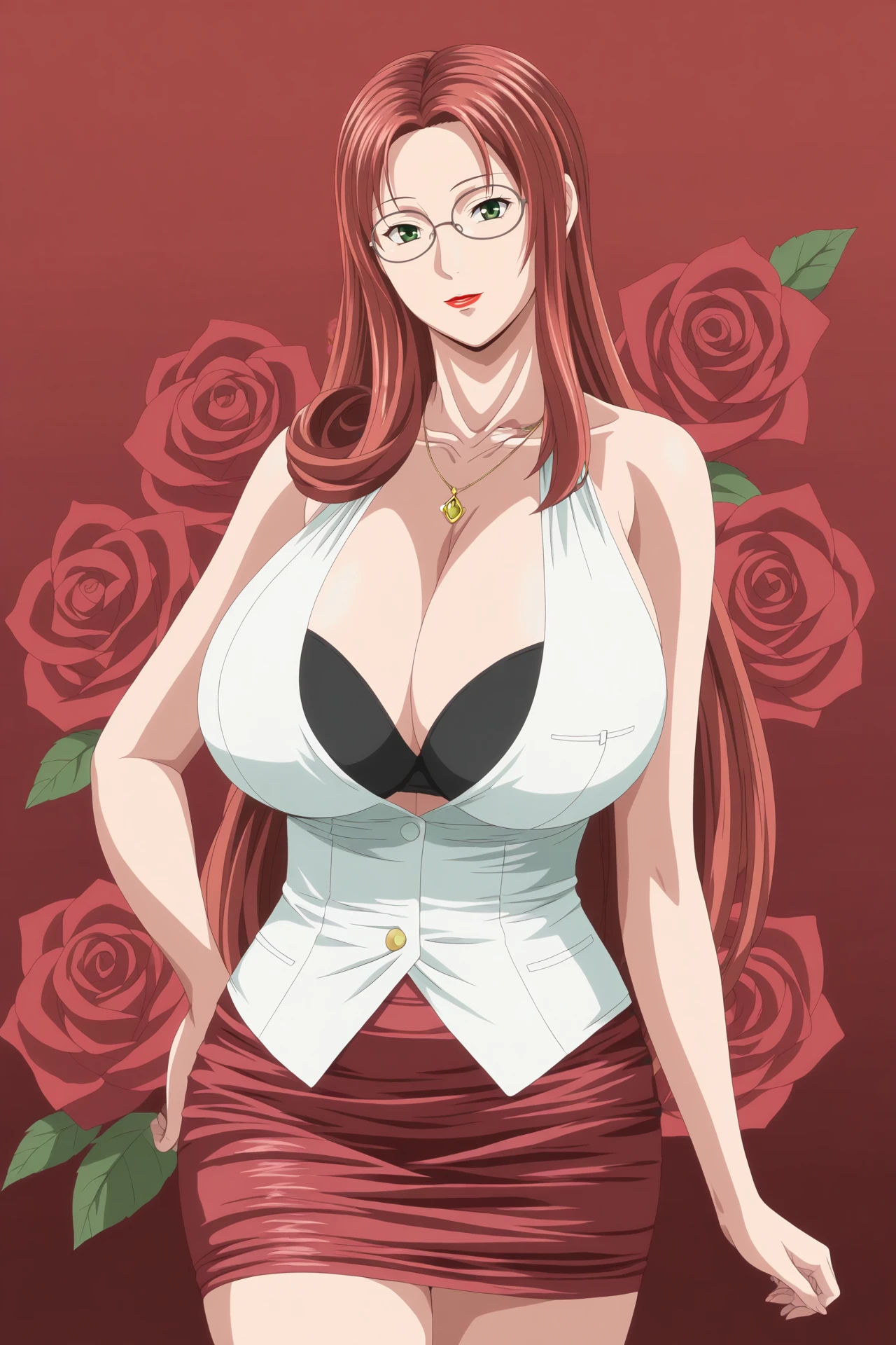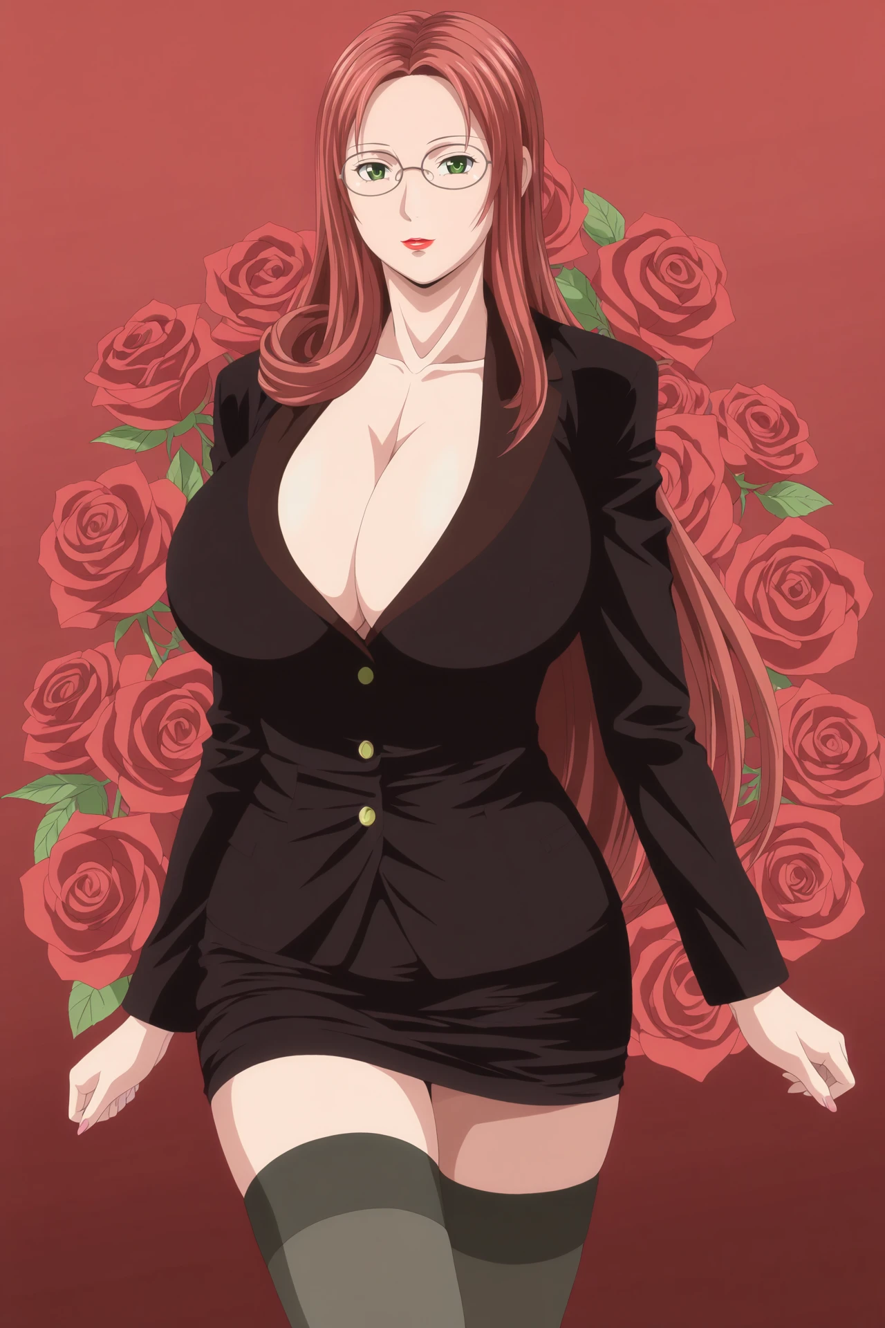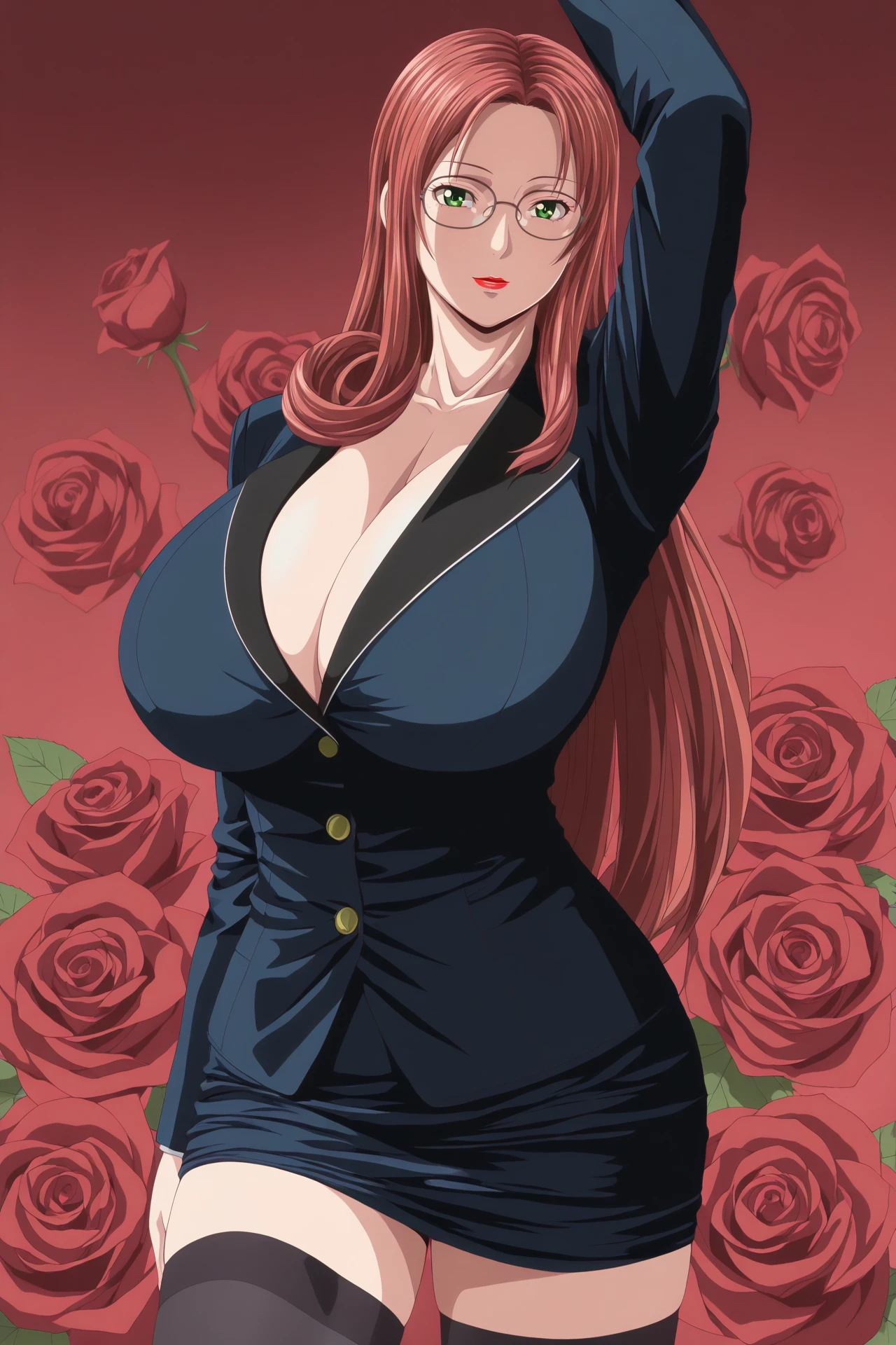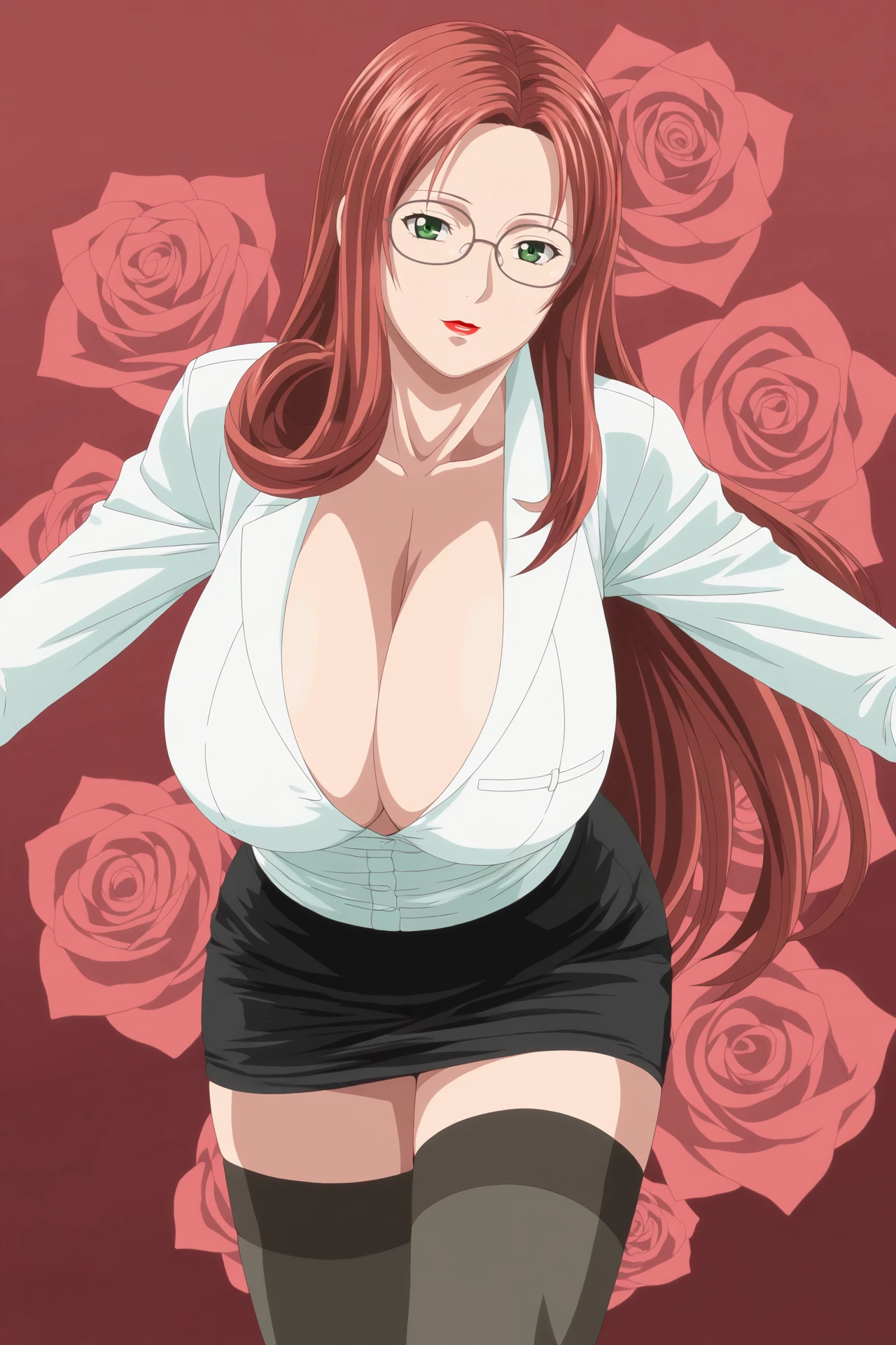 sayaka,1girl,solo,mature female,red hair,long hair,green eyes,glasses,huge breasts,lipstick,