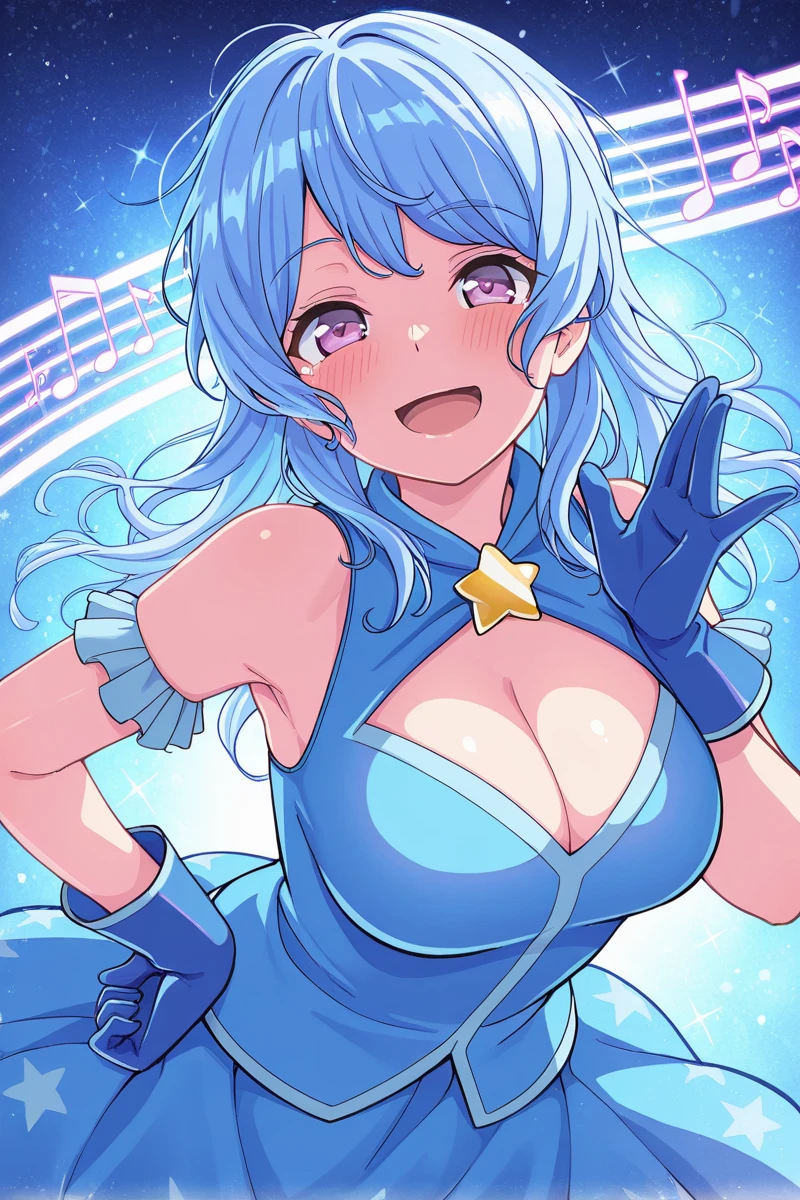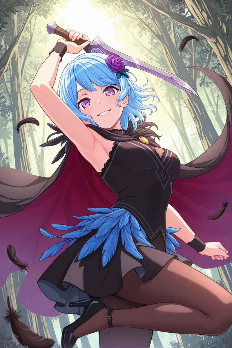 matsubarakanon, 1girl, solo, one side up, blue hair, smile, long hair, ribbon, purple eyes, looking at viewer, bangs, dress, flower, school uniform, hair ornament, hanasakigawa school uniform, neck ribbon, long sleeves, buttons, light blue hair, sailor dress, red ribbon, brown dress, hair flowerDescription