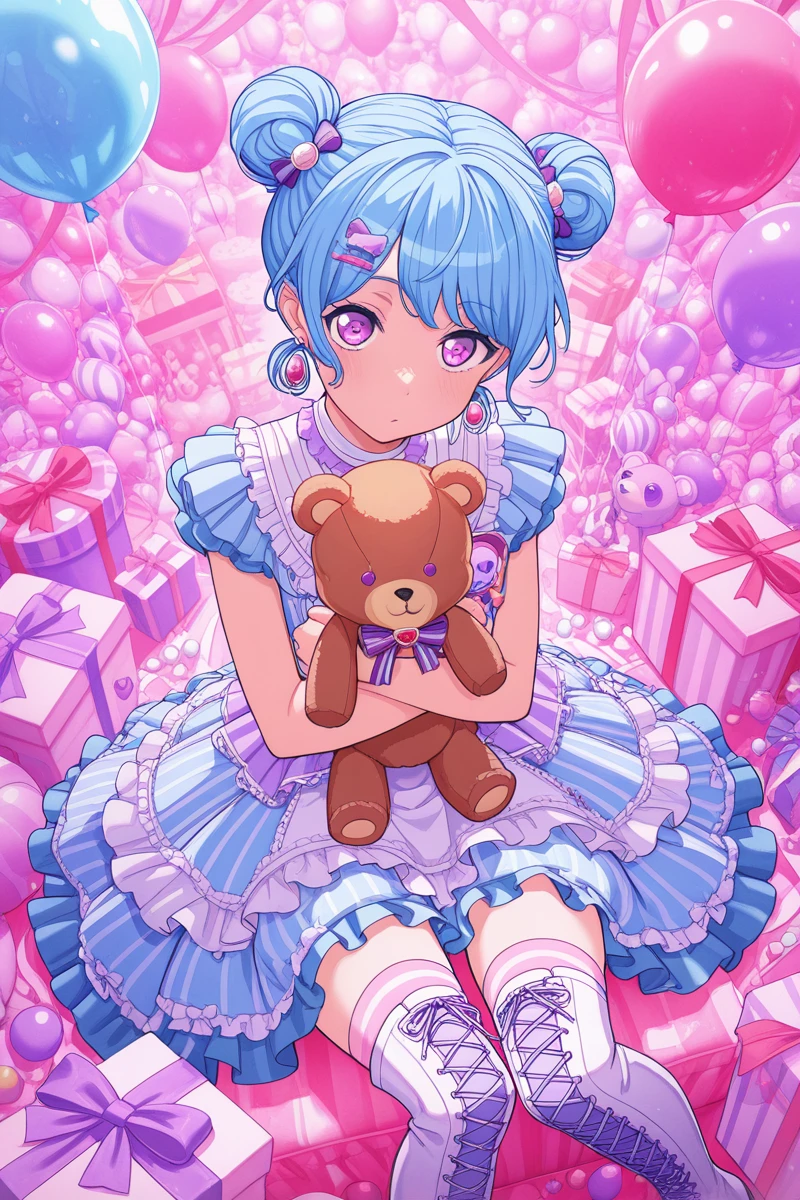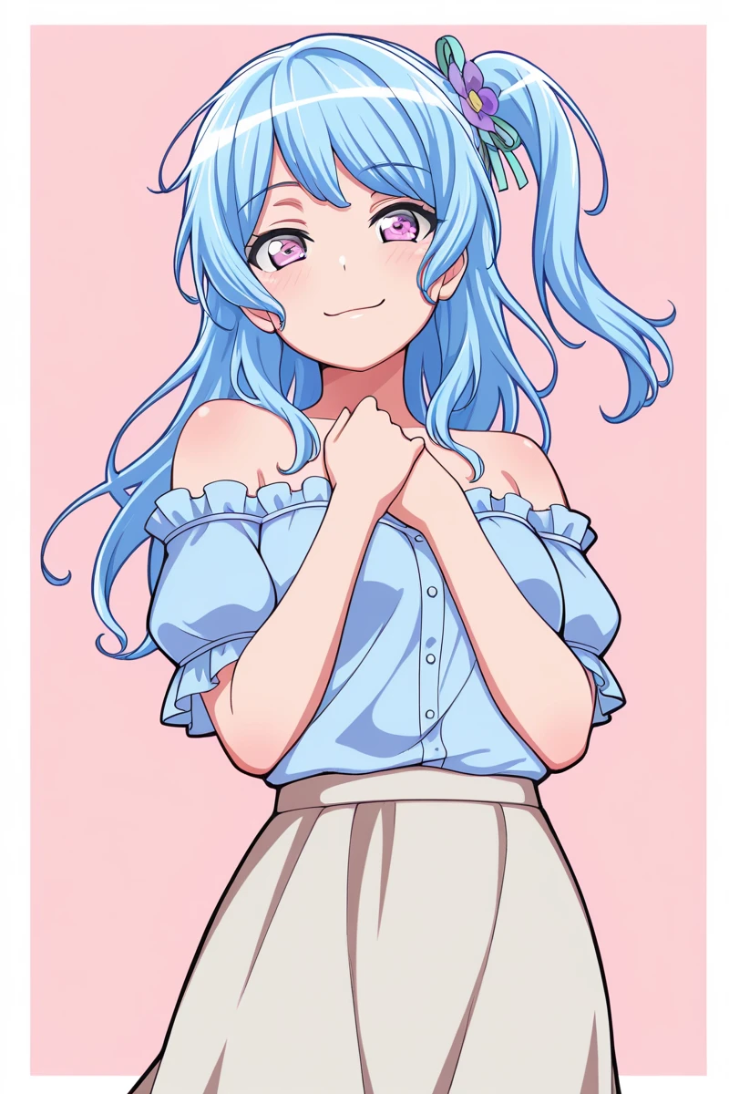 matsubarakanon, 1girl, solo, one side up, blue hair, long hair, skirt, bangs, shirt, hair ornament, frilled sleeves, short sleeves, flower, off-shoulder shirt, ribbon, looking at viewer, purple eyes, hair flower, frilled shirt, frills, hair ribbon, blue shirt, off shoulder, cslskSchool uniform Kanon:
