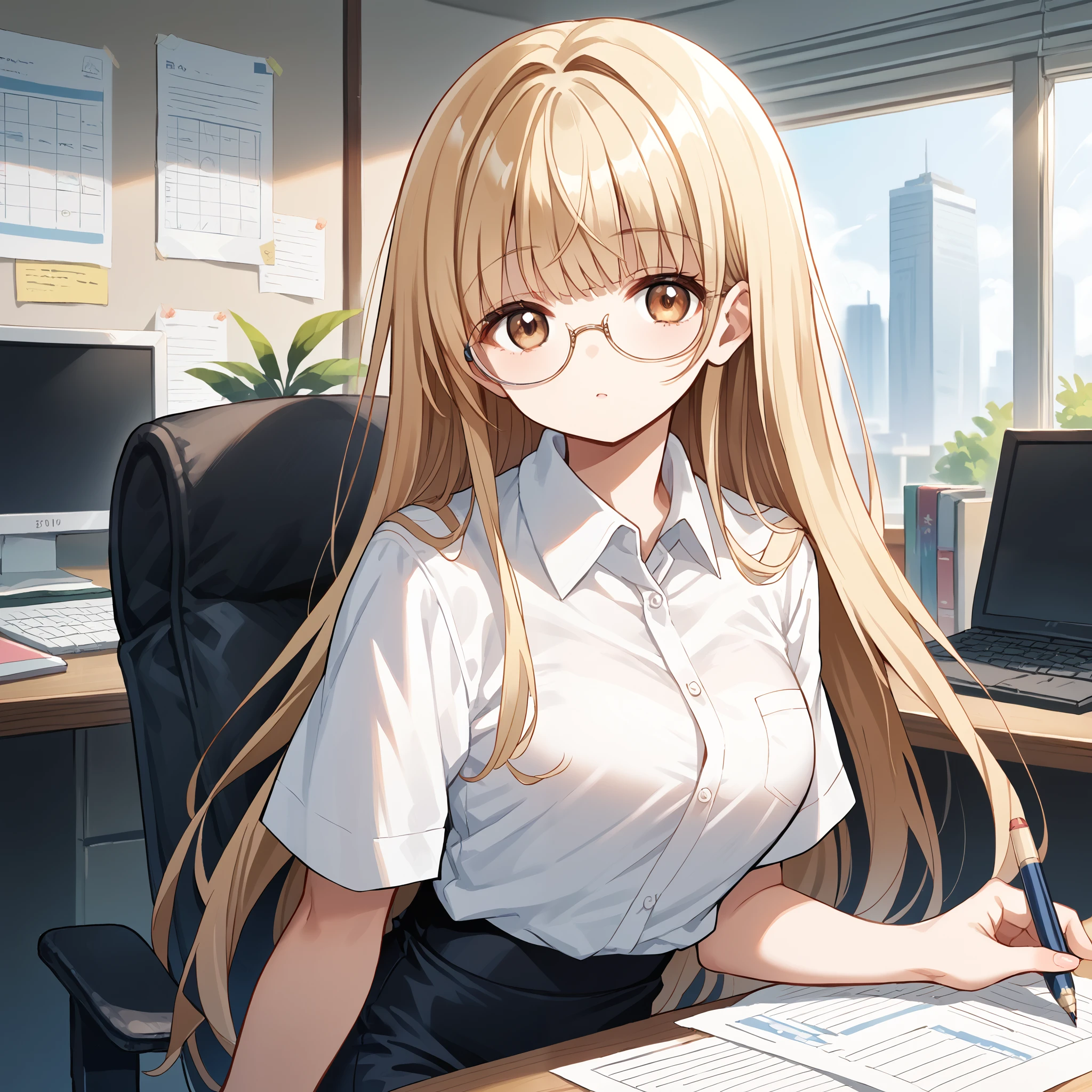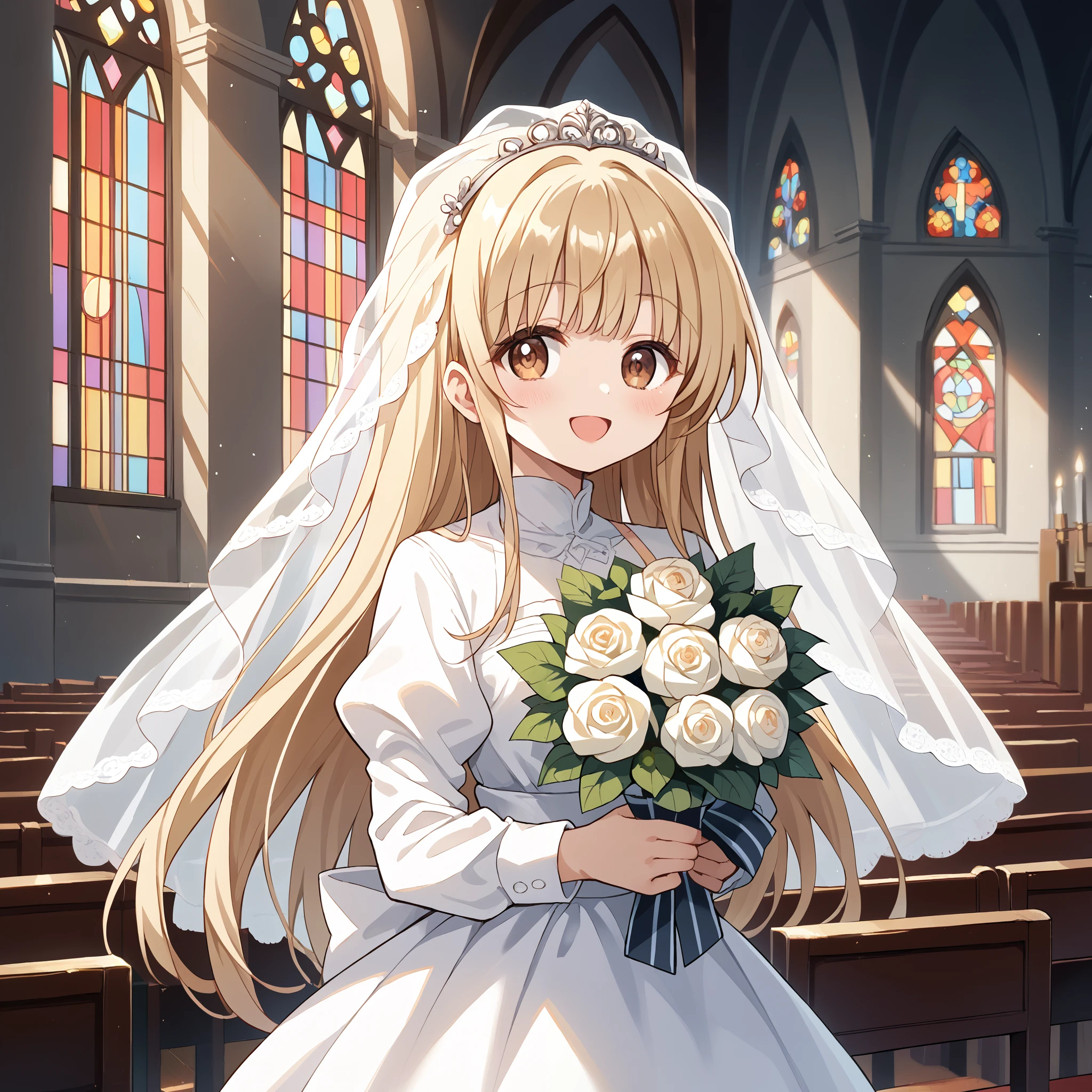 School Uniform : shiina mahiru, brown eyes, long hair, blonde hair, school uniform, black jacket, blazer, long sleeves, red bow, white shirt, collared shirt, grey skirt, plaid skirt, brown pantyhose,Description