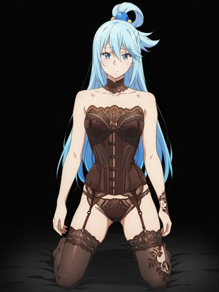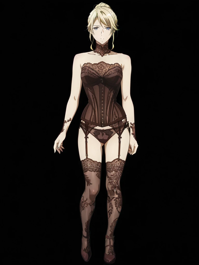beaded lace details, brown lace corset, brown satin corset dress, brown satin corset dress L11, corset boning visible, dark chocolate tones, detailed embroidery, elegant posed, front view, full body henna designs, gothic couture, halter neck lace, intricate floral lace pattern, lace high neck collar, lace overlay, luxurious lingerie style, mehndi arm and leg tattoos, nude illusion stocking, sensual fragile aesthetic, sheer lace bodysuit,