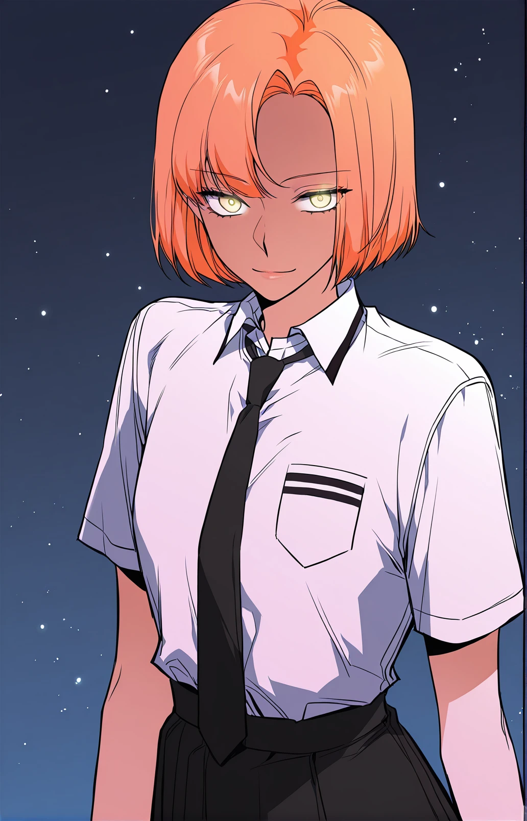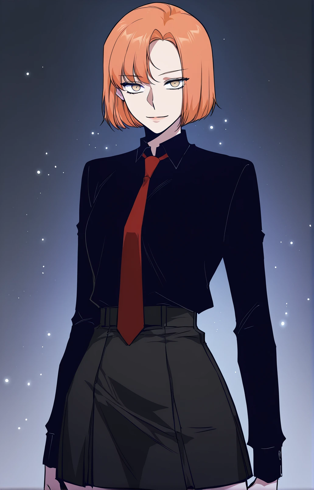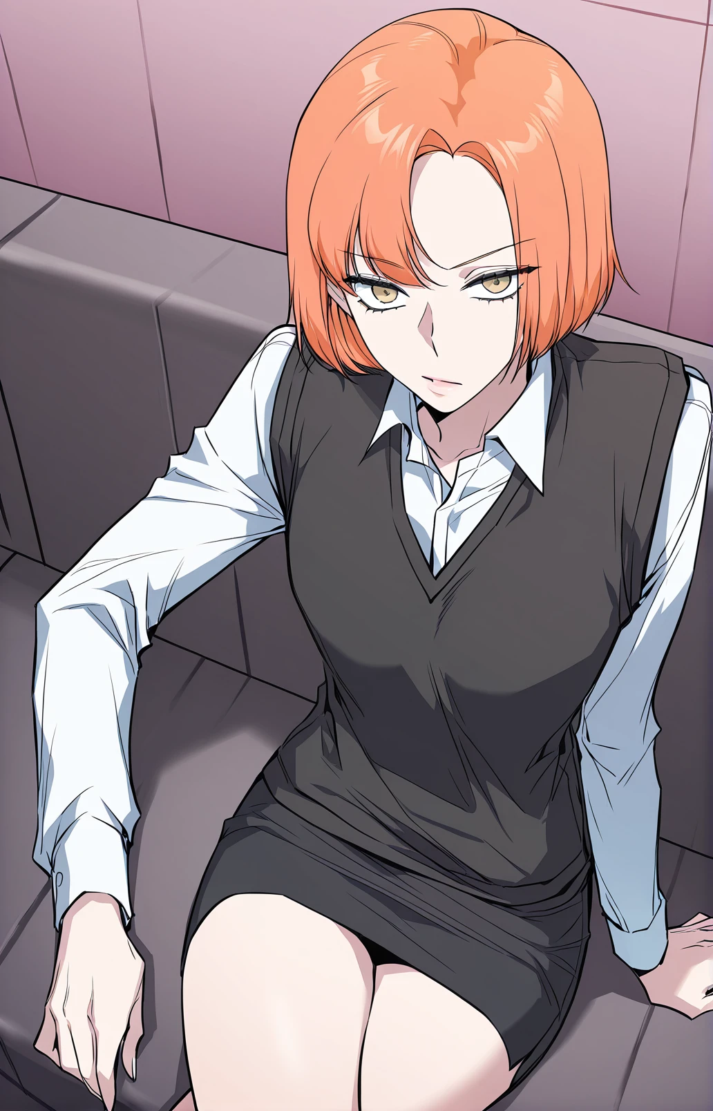 Leejiwoo, 1girl, solo, amber eyes, orange hair, short hair, side bangs, asymmetrical bangs,