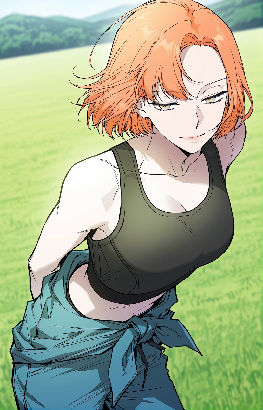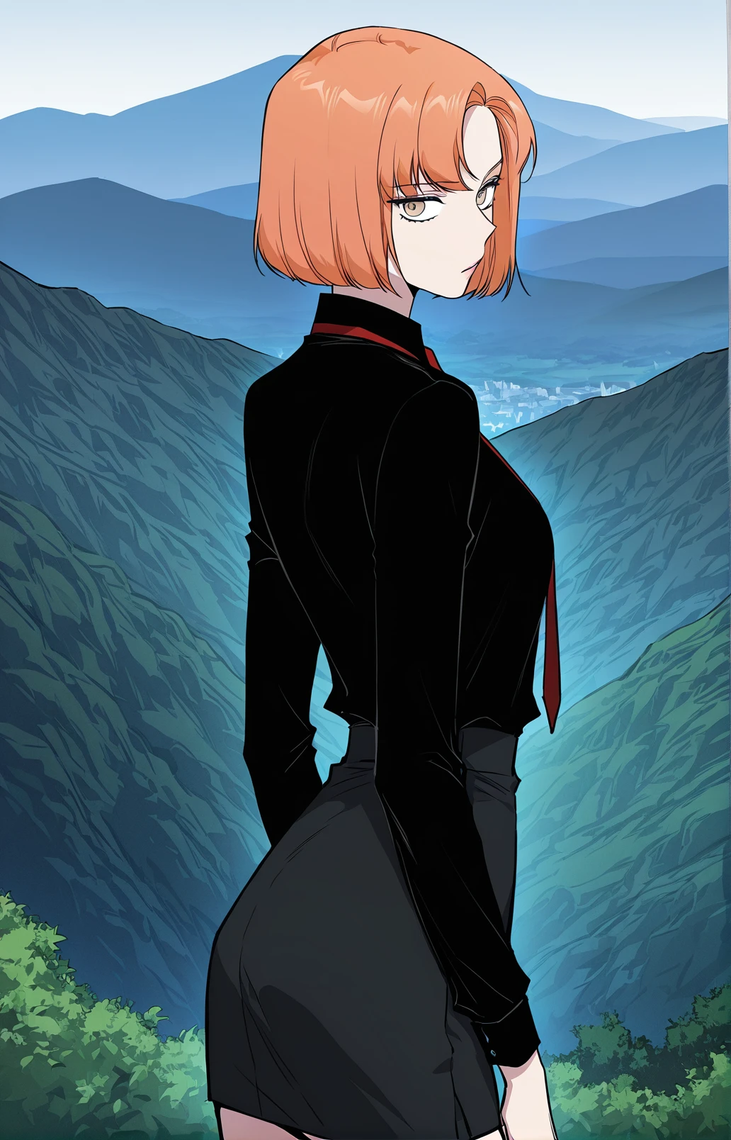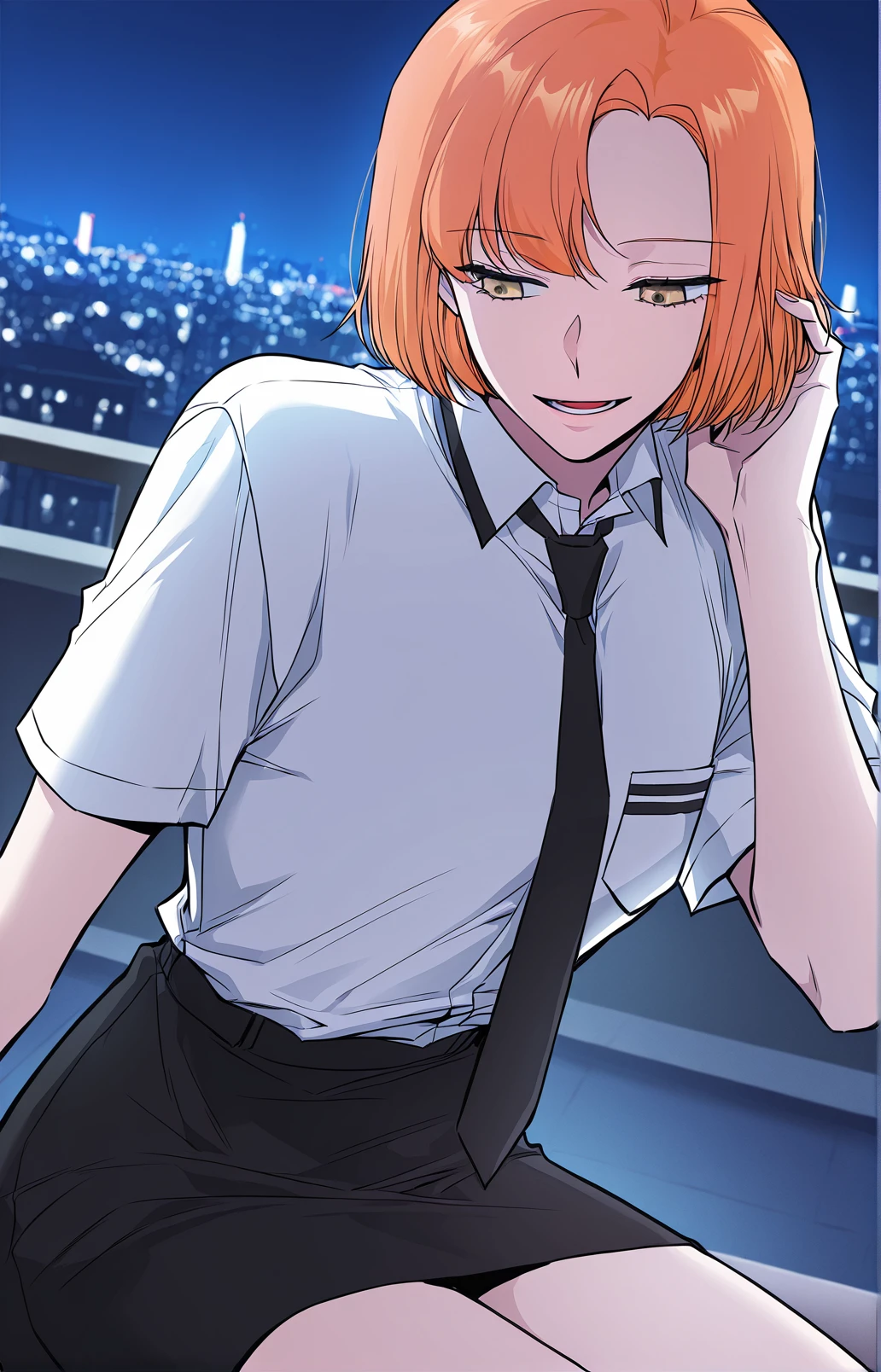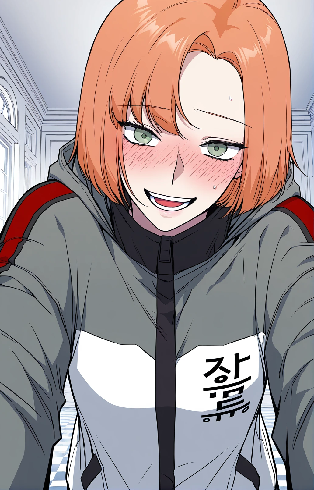 Leejiwoo, 1girl, solo, amber eyes, orange hair, short hair, side bangs, asymmetrical bangs,