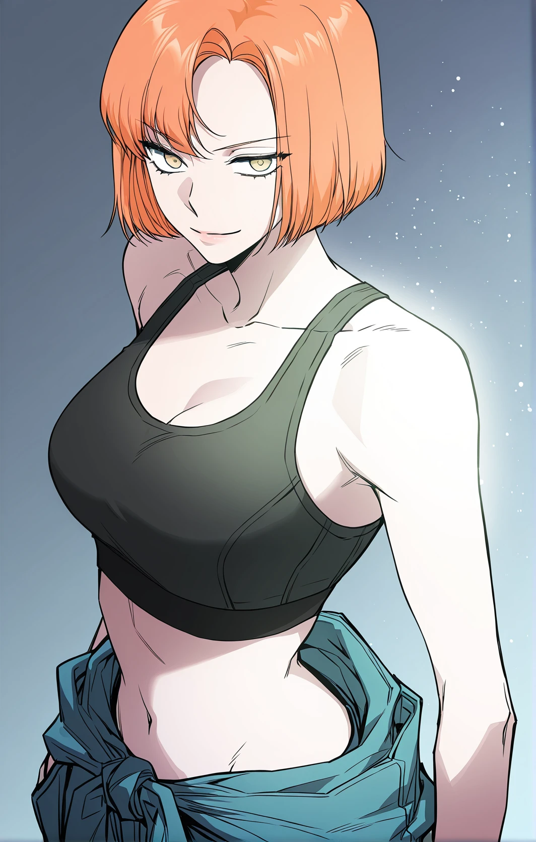 Leejiwoo_outfit5, black sports bra, cleavage, midriff, tied jacket waist, blue pants, loose pants, tracksuit pants,