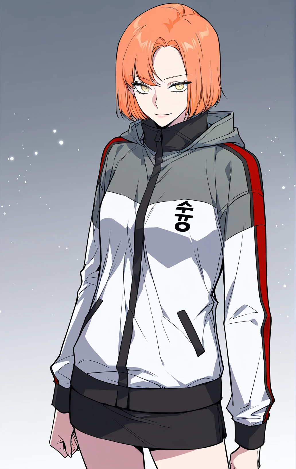 Leejiwoo_outfit2, gray and white jacket, hooded jacket, long sleeves, black cuff, front zipper, black center placket, red sleeve stripes, black skirt, short skirt,