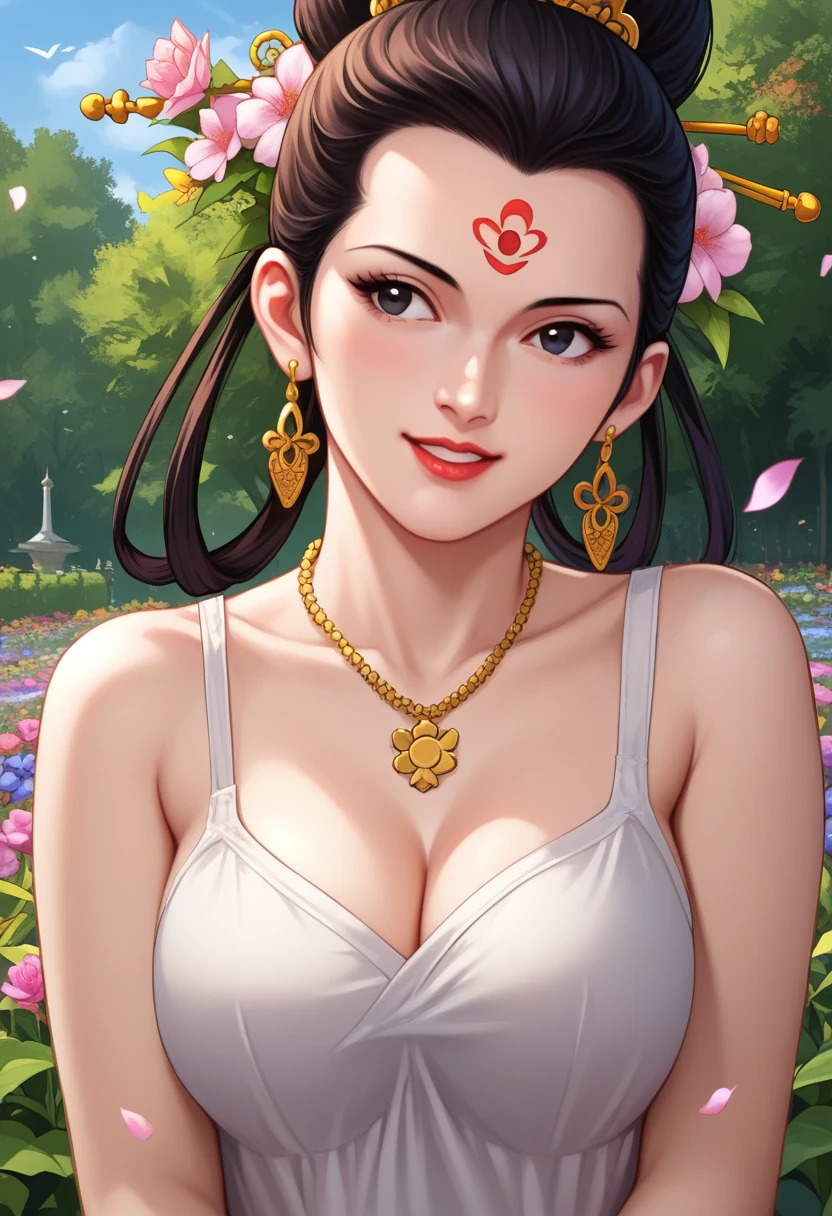 shiqingxuan, black hair, long hair, ((hair ornament)), ((hair rings)), ((forehead mark)), black eyes, red lips, earrings, necklace, cleavage,