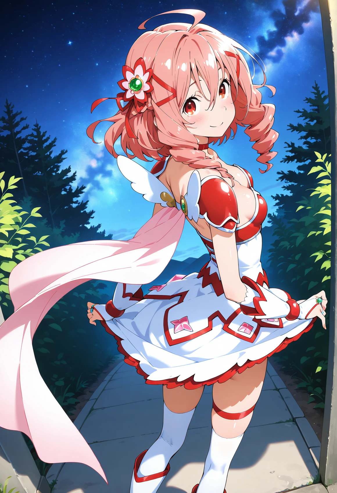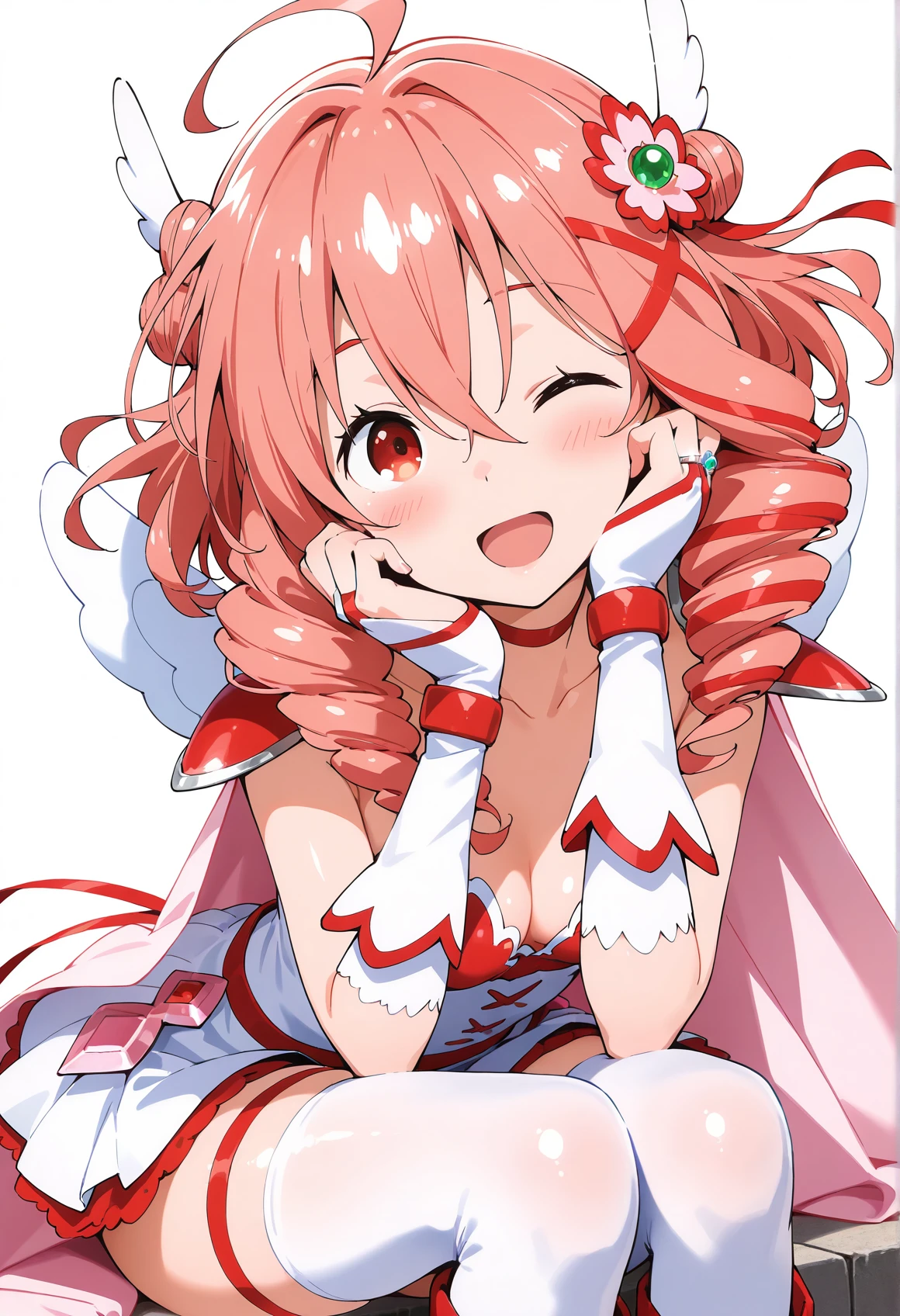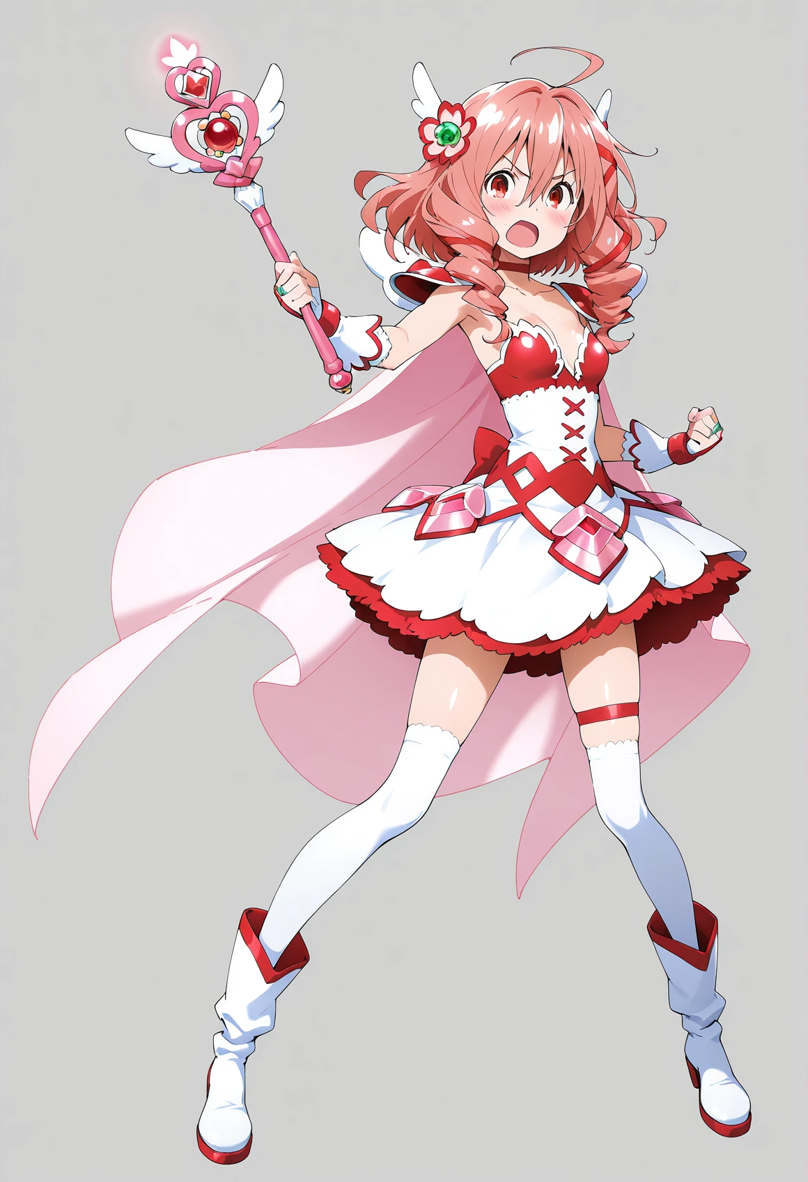 SOUSHIN,magical girl,pink hair,long hair,ahoge,twin braids,twin drills,twintails,hair flower,jewelry,hair ribbon,red ribbon,red choker,white dress,bridal gauntlets,pink cape,cleavage,collarbone,pauldrons,ring,shoulder armor,fingerless gloves,white gloves,miniskirt,thigh strap,white thighhighs,white footwear,boots,bare back,fake wings,