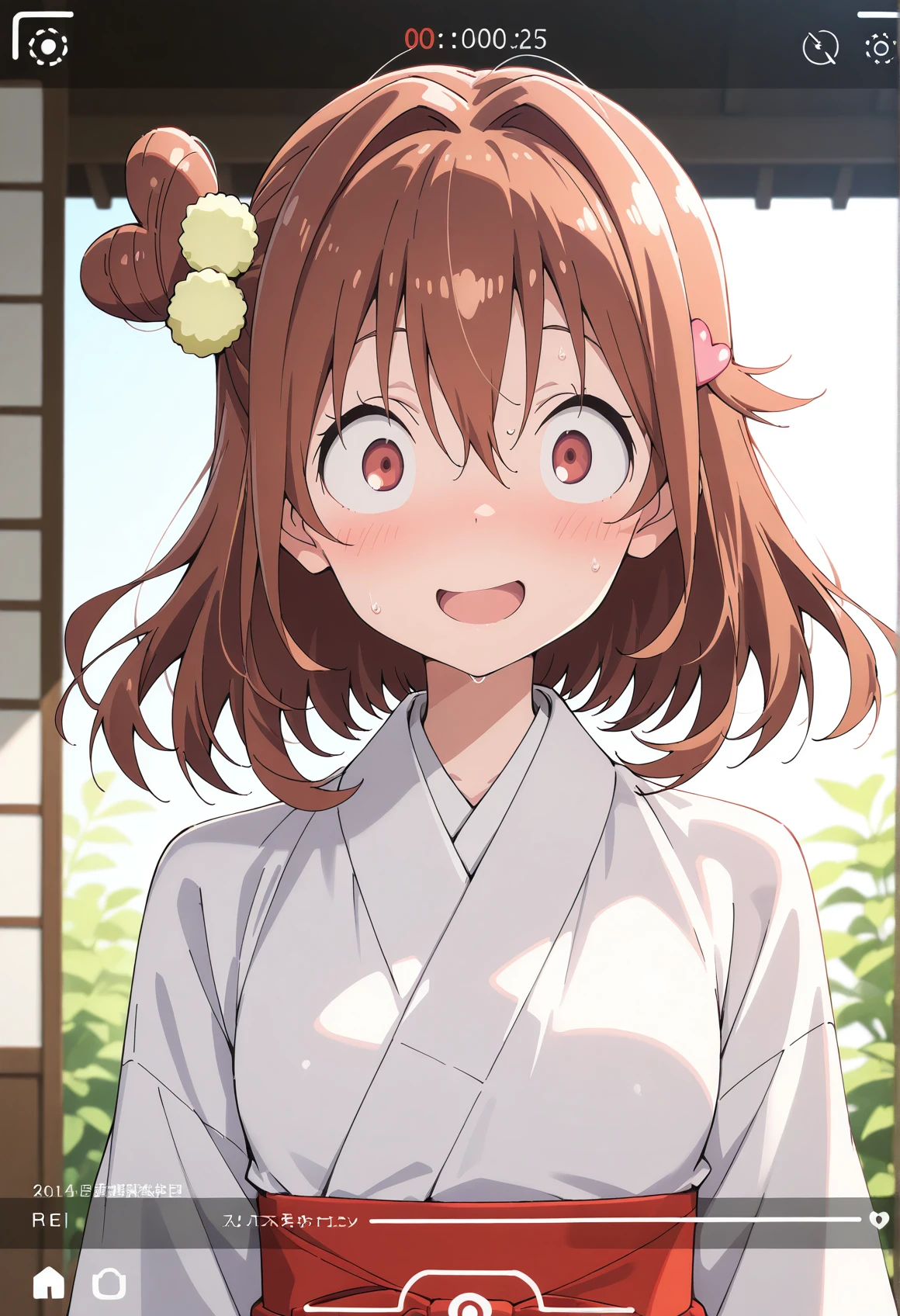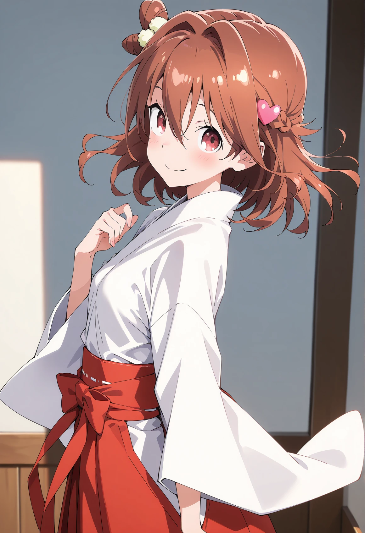 MK_DRESS,miko,japanese clothes,kimono,white kimono,brown hair,hair intakes,hakama skirt,red hakama,heart hair ornament,one side up,short hair,