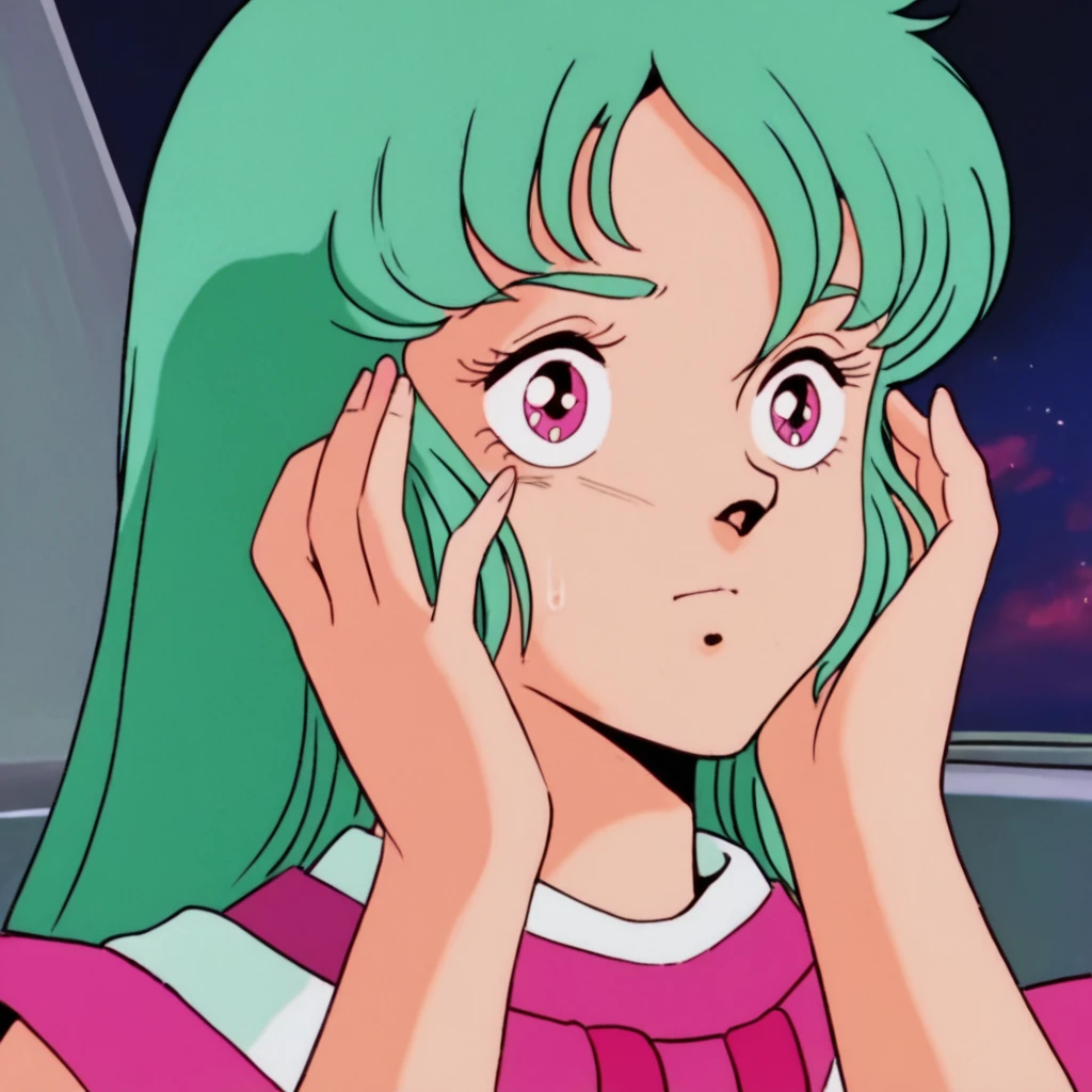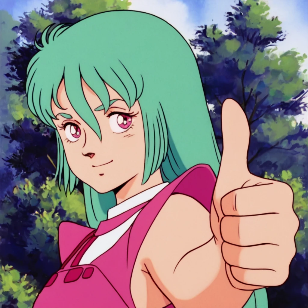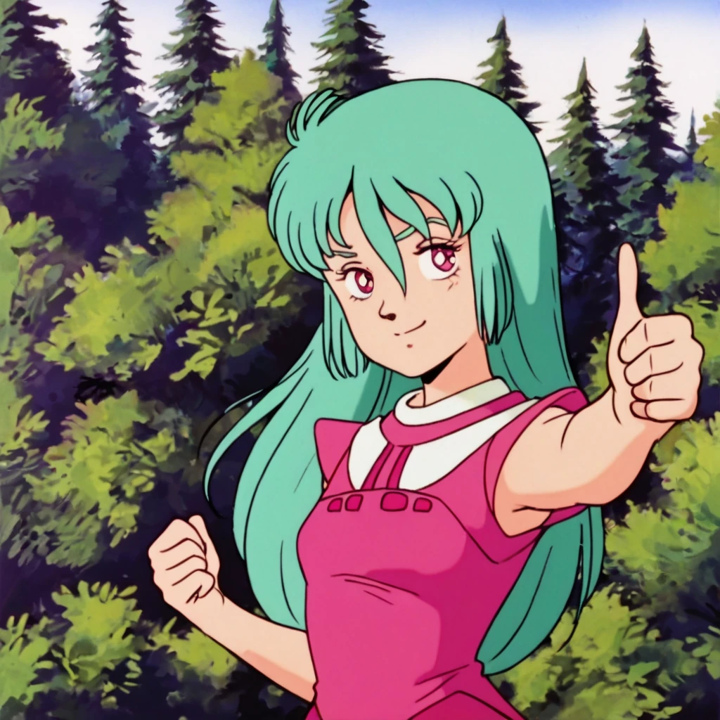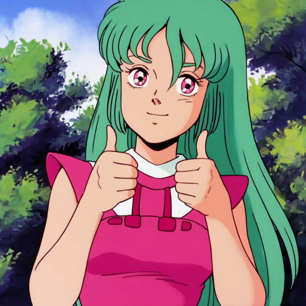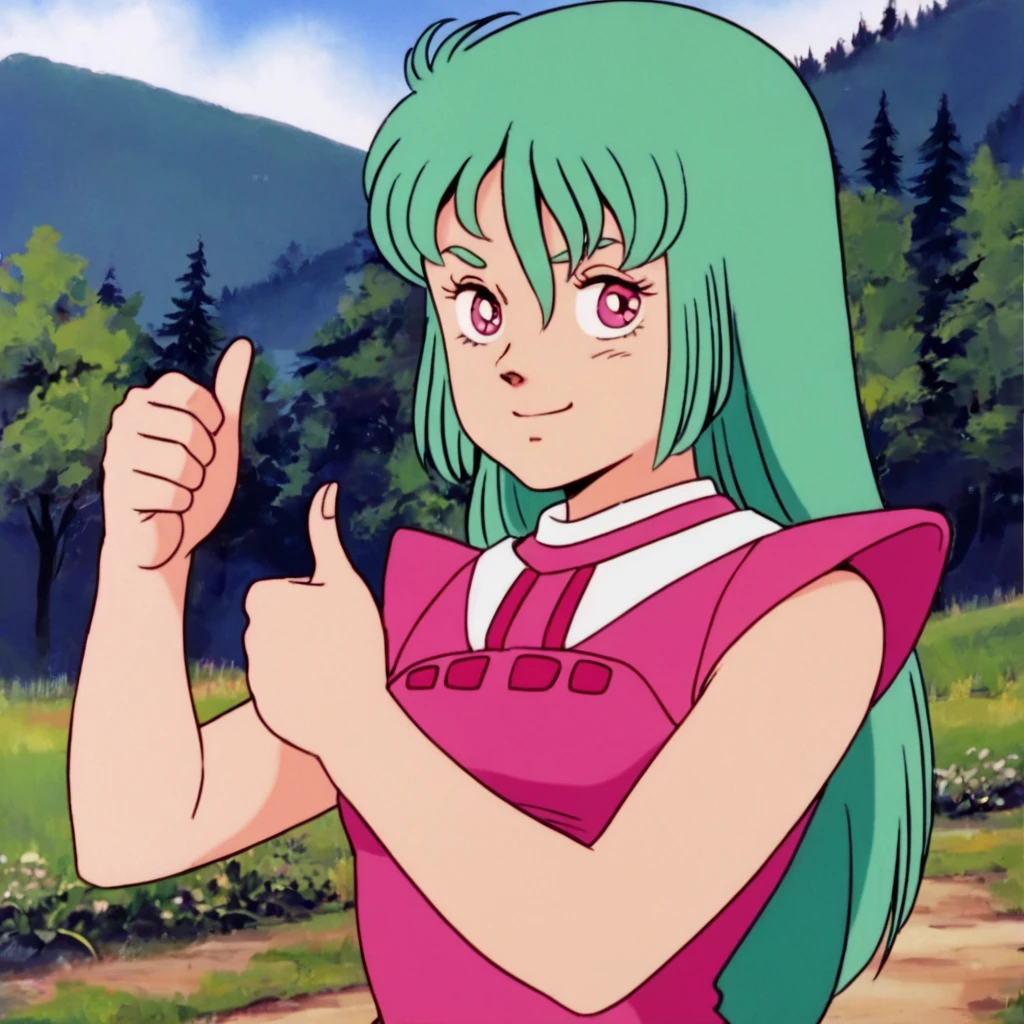 Trigger words:dunciel,1girl,solo,long hair,pink eyes,green hair,1980s (style), retro artstyle, anime coloring,