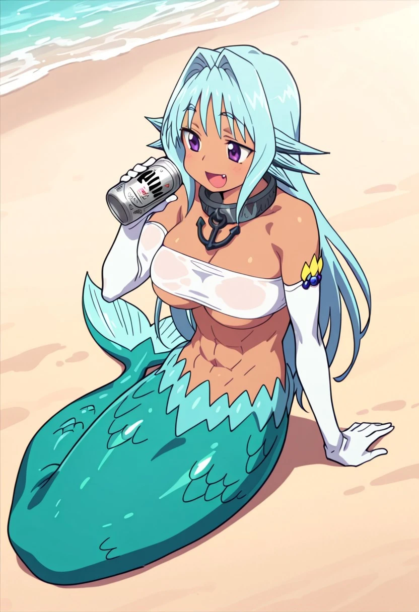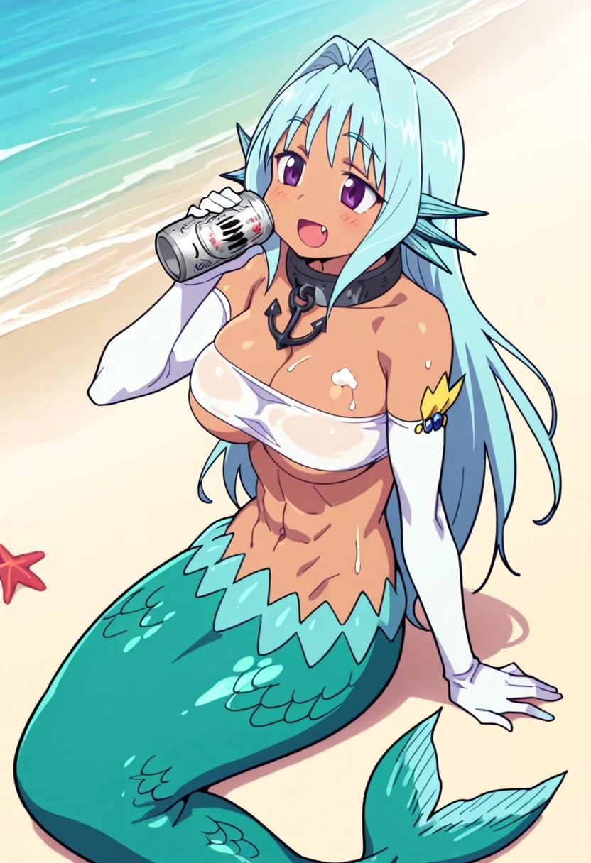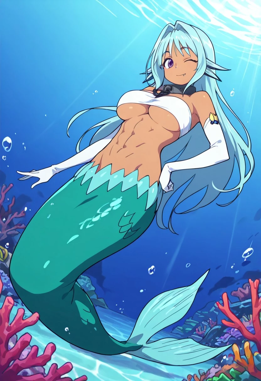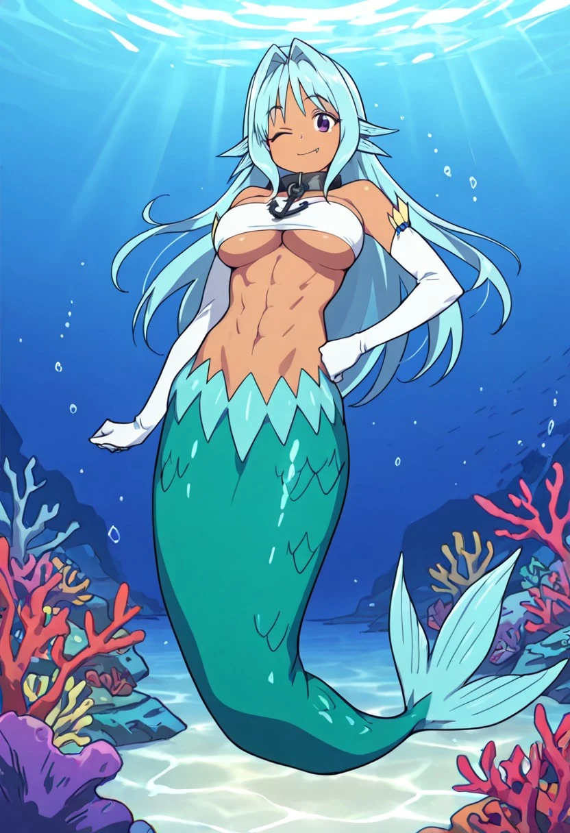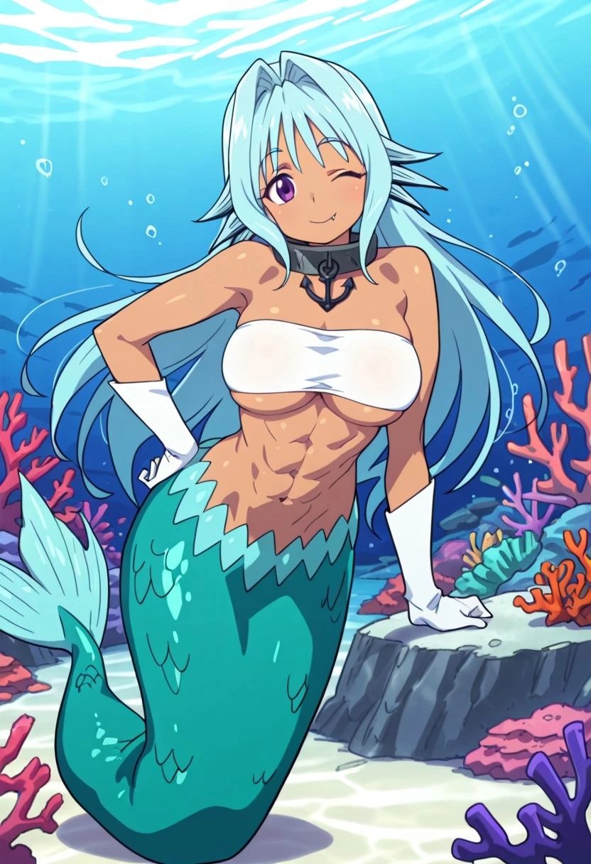 Appearance: blue hair, purple eyes, long hair, dark-skinned female, fang, large breasts, well toned, abs, tube top, underboob, bare shoulders, midriff, collar, anchor, shoulder gloves, monster girl, mermaid, mermaid tail, green tail, head fins