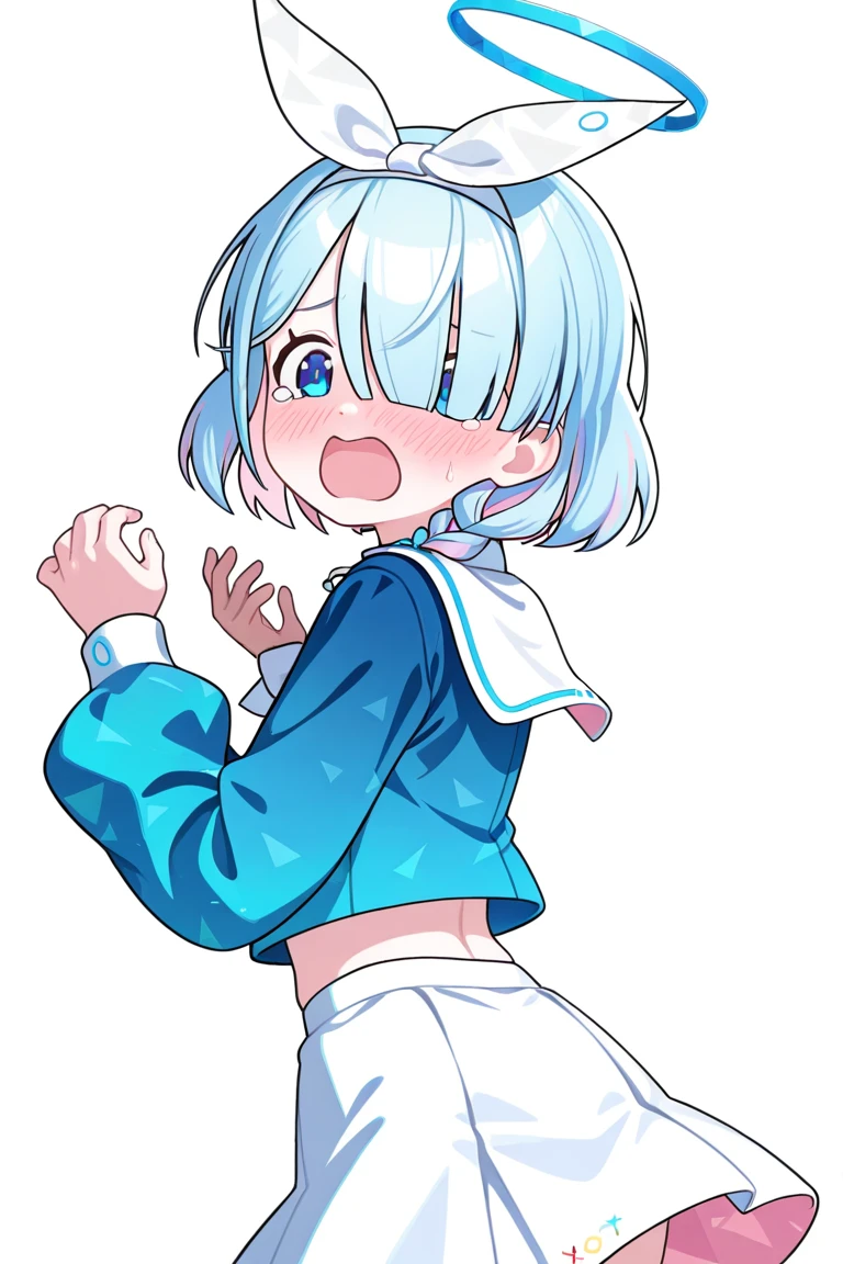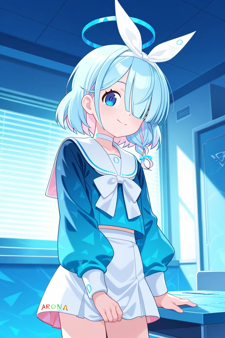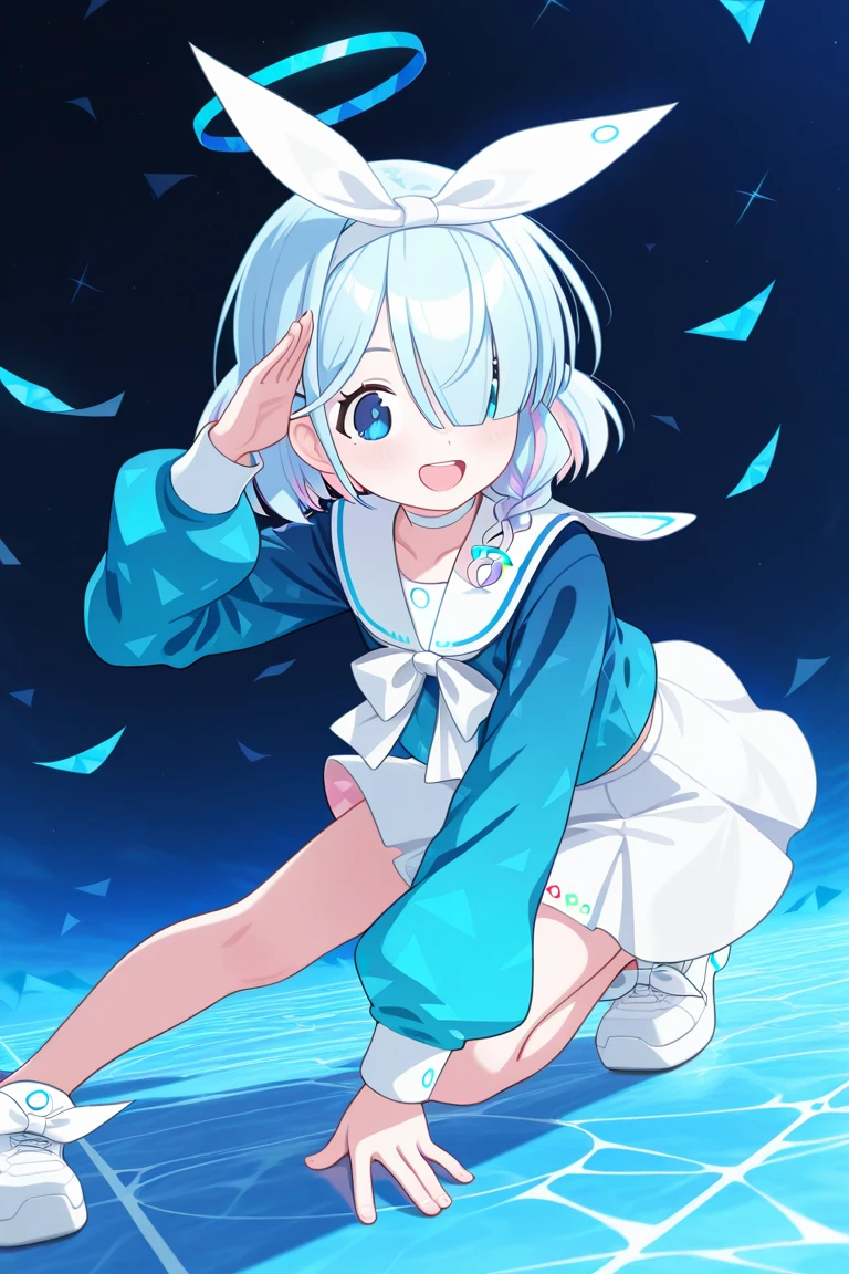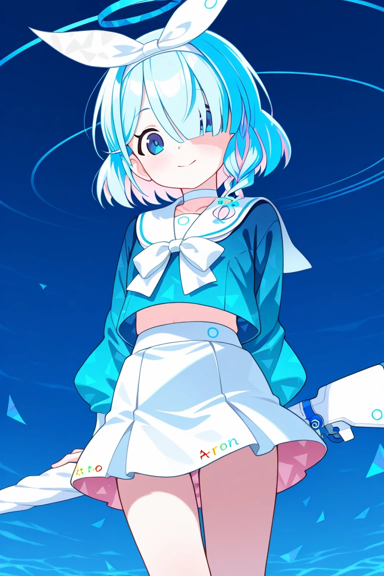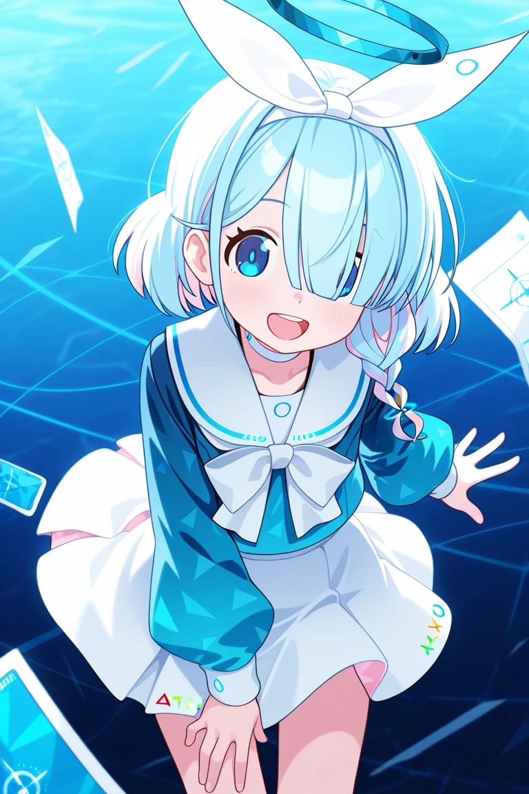Blue Archive (/Arona/),1girl,shirt cyan,halo,skirt white,hair blue,hair over one eyes,bangs hair,mechanical halo,