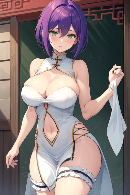 UsukamiTashaka, 1girl, solo, short hair, large breasts, white dress, navel, cleavage, hair between eyes, bare shoulders, green eyes, purple hair, sleeveless, bare arms, thigh strap, chinese clothes, cleavage cutout, pelvic curtain, side slit, center opening, bridal garter, navel cutout