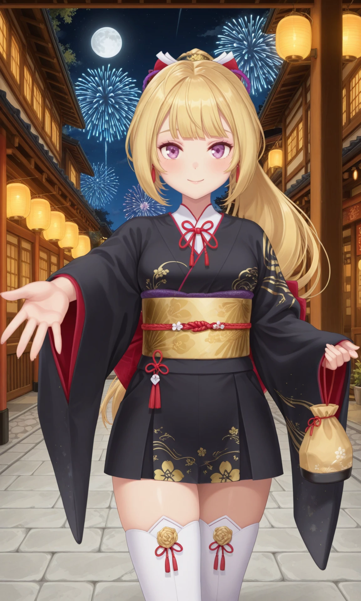 rion8th, long hair, ponytail, hair bow, red ribbon, japanese clothes, black kimono, obi, white thighhighsWhite Kimono :