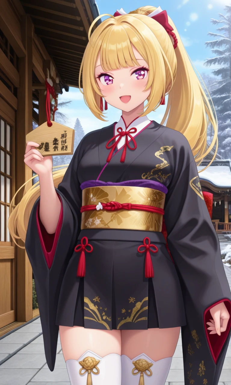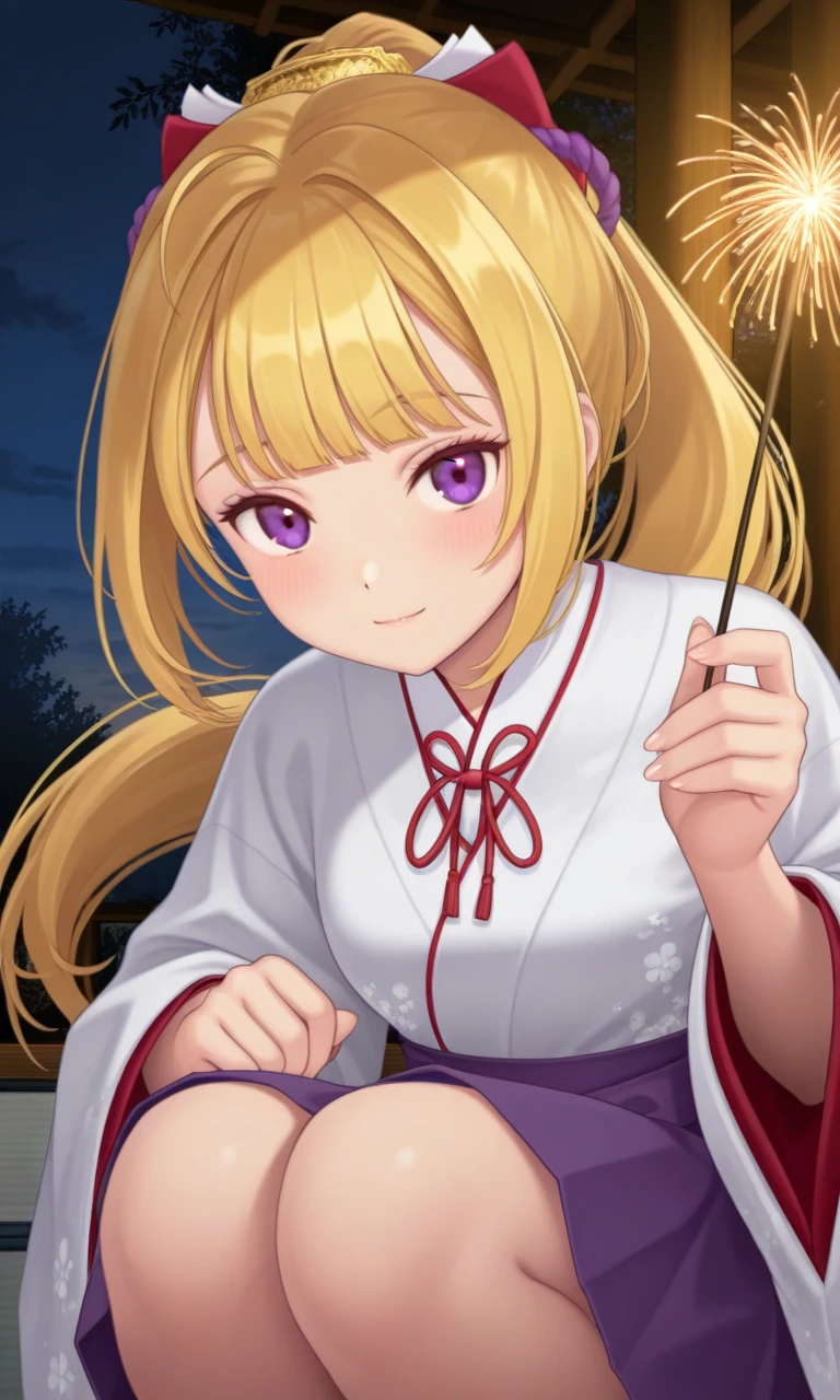 rion8th, long hair, ponytail, hair bow, red ribbon, japanese clothes, white kimono, hakama skirt, purple skirt, white thighhighs