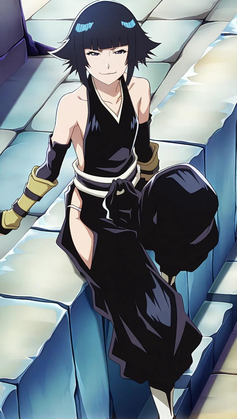 soifon, blue eyes, short hair, black hair, short hair with long locks, bangs, blunt bangs