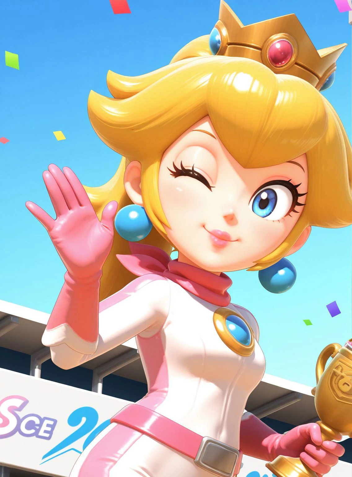 PeachAeroMKW, blonde hair, ponytail, blue eyes, pink and white bodysuit, crown, pink gloves, eyelashes, pink lips, blue earrings, pink scarf, belt, blue brooch
