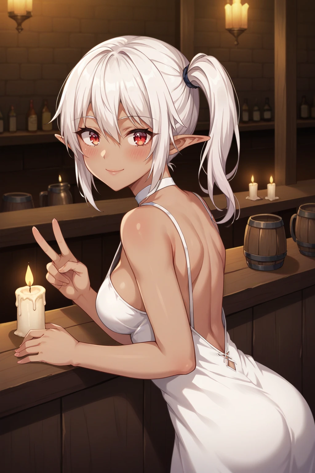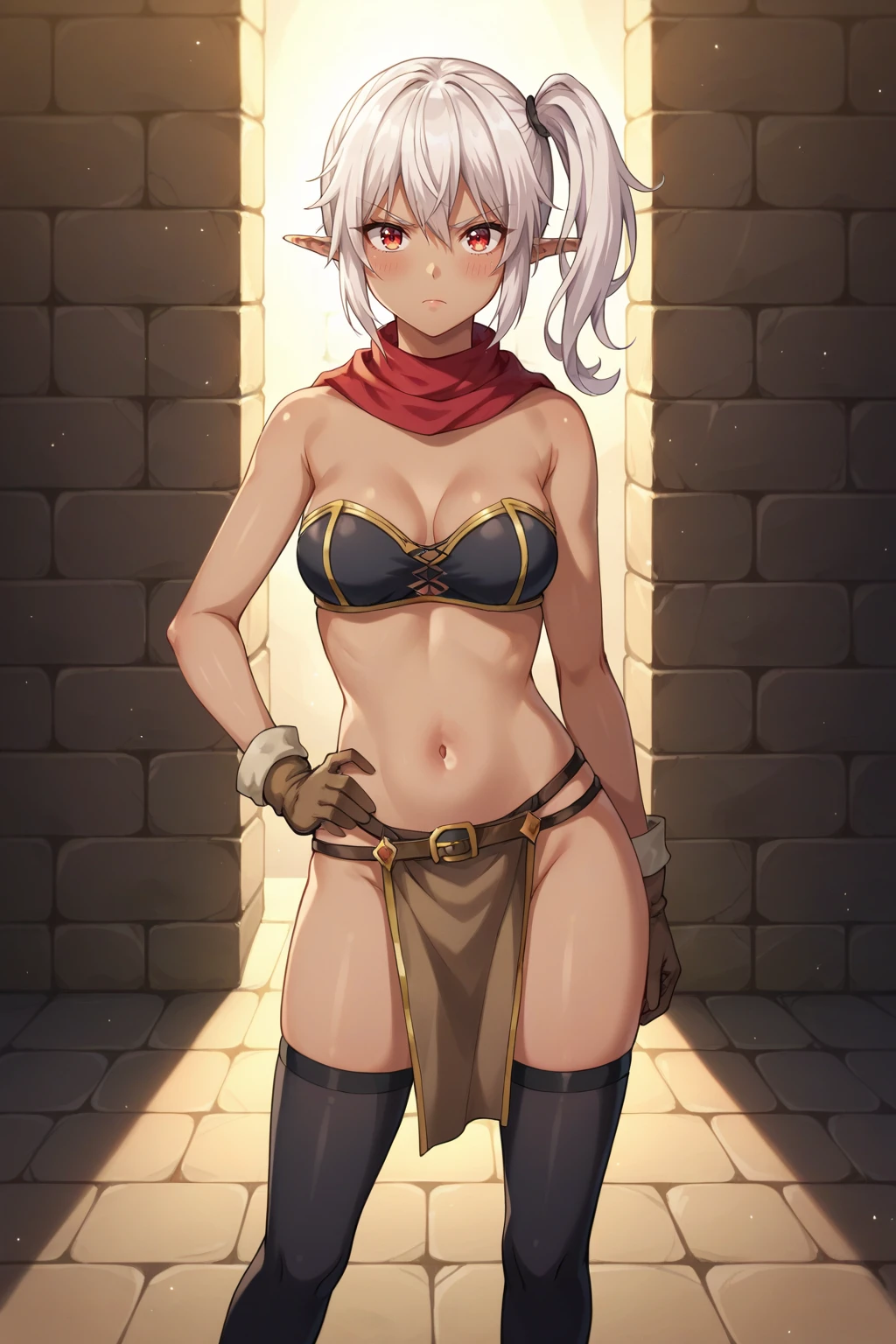 Triggers: elf, pointy ears, white hair, red eyes, dark skin, hair between eyes, side ponytail,