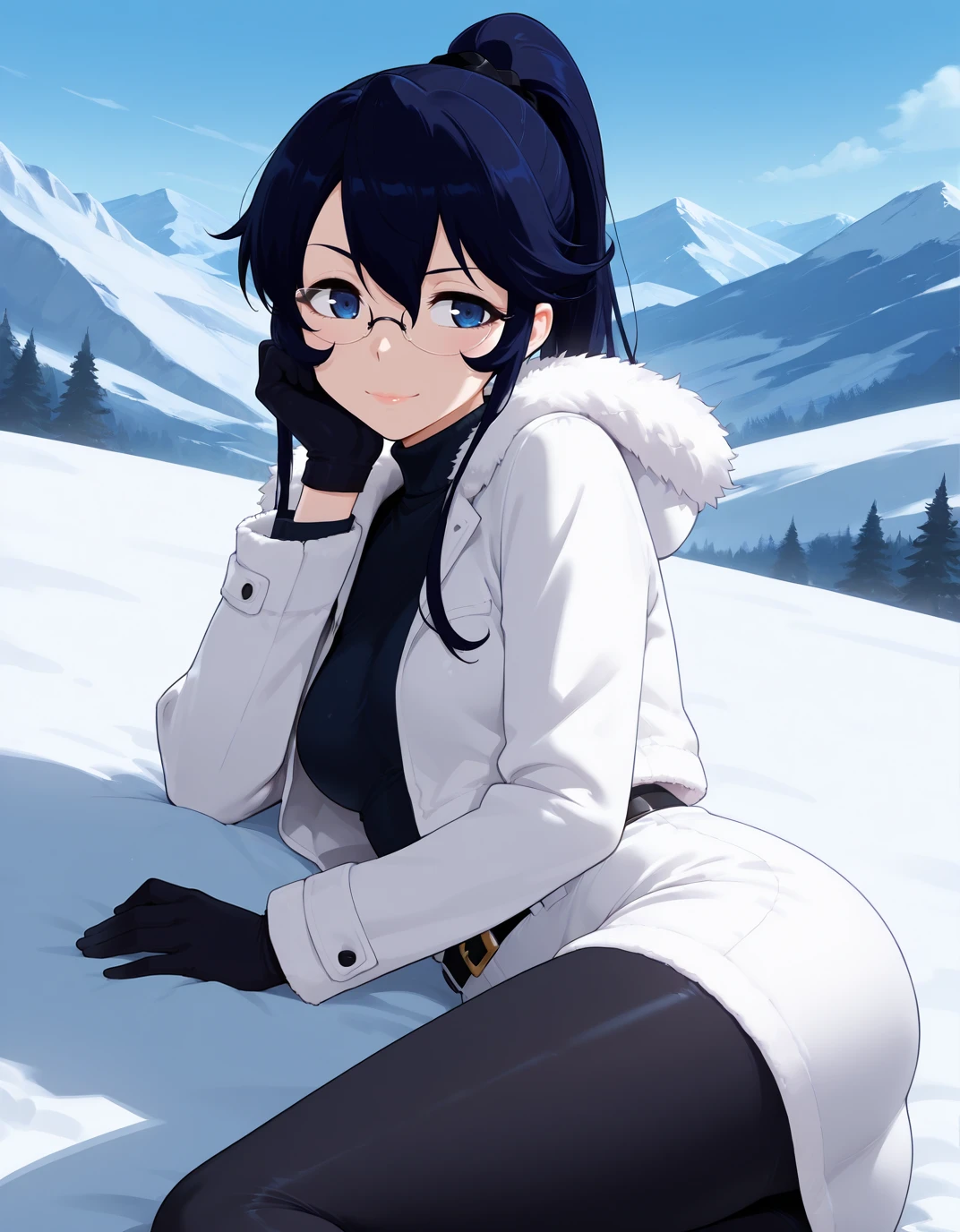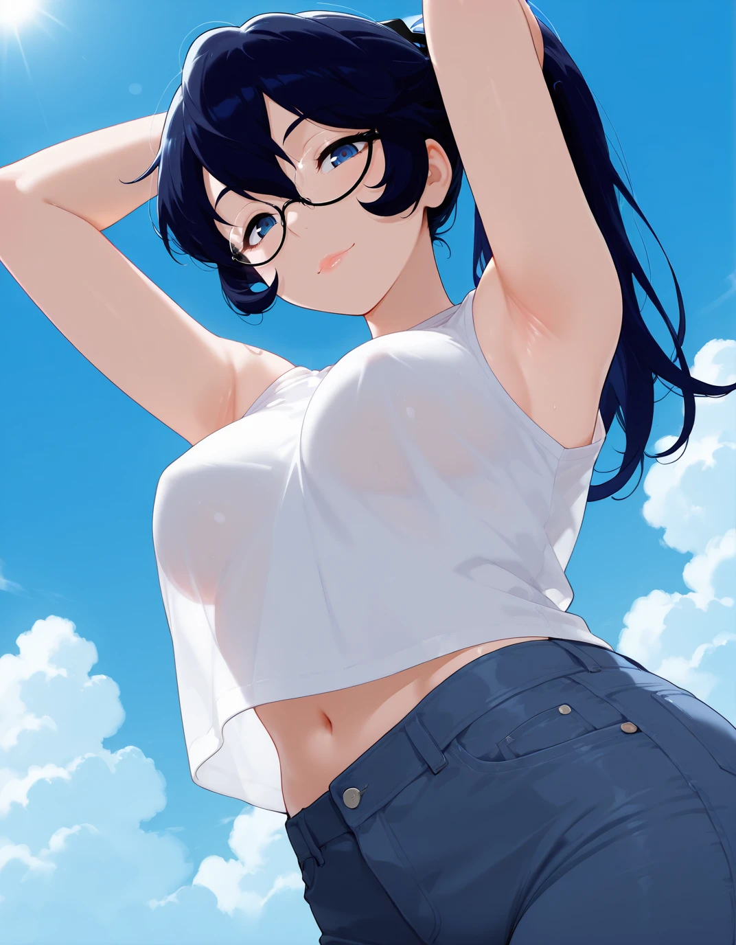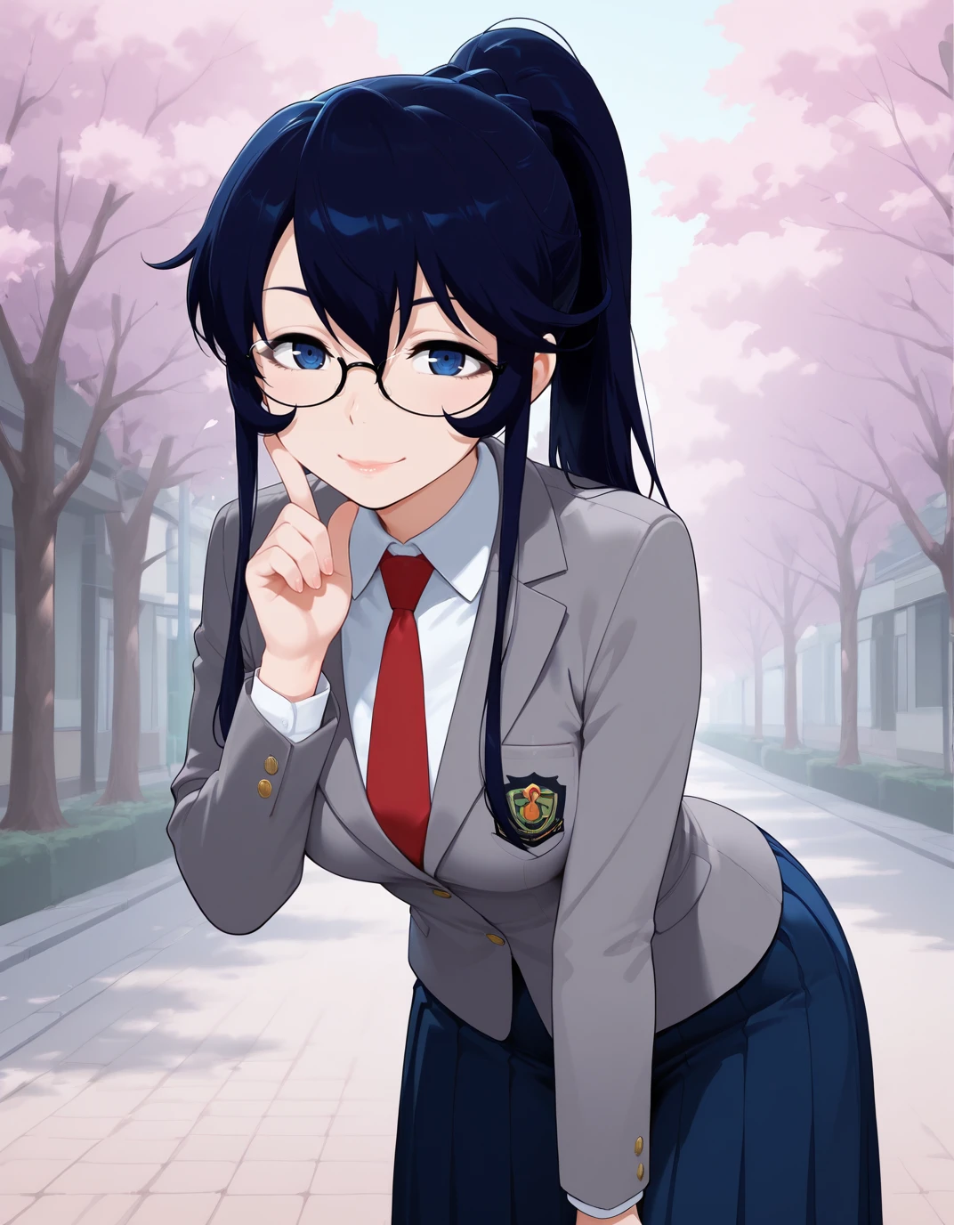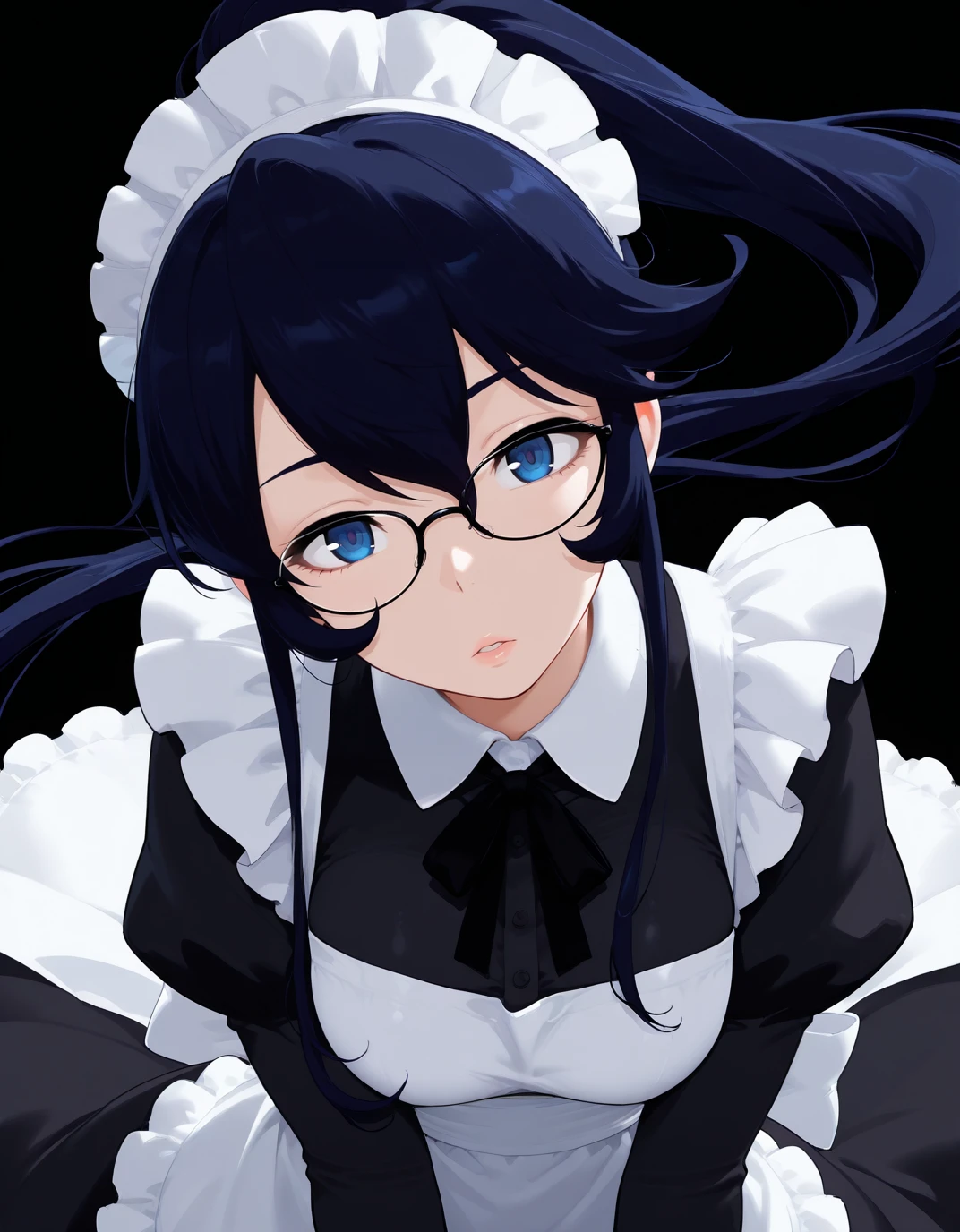 Basic trigger words: dark blue hair, ponytail, hair between eyes, dark blue eyes, glasses, thin lips, medium natural breasts