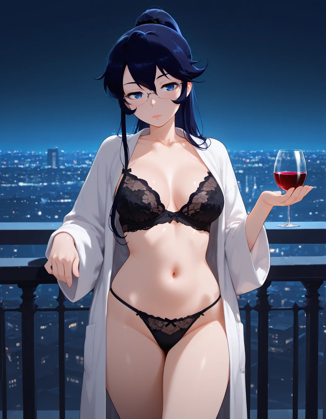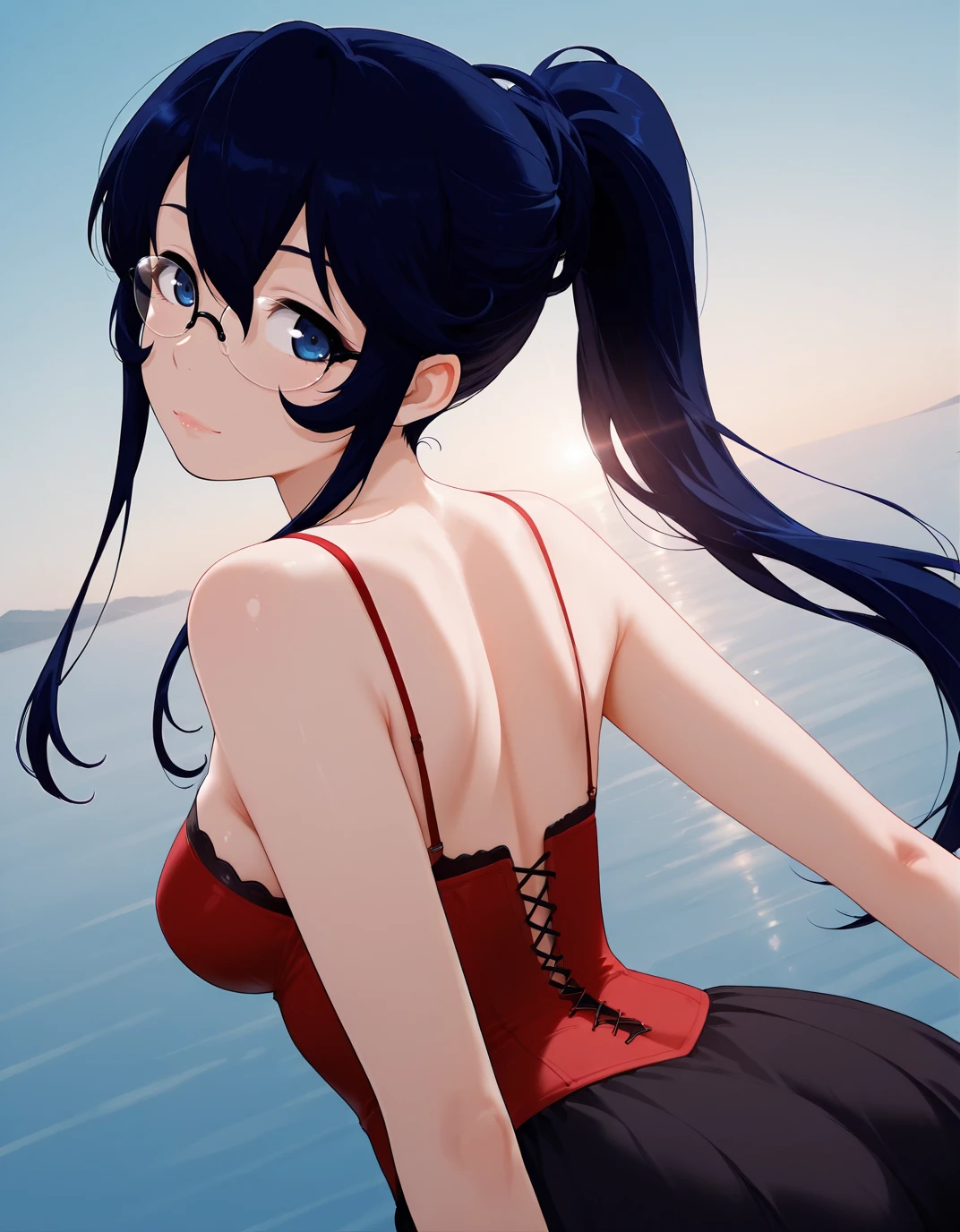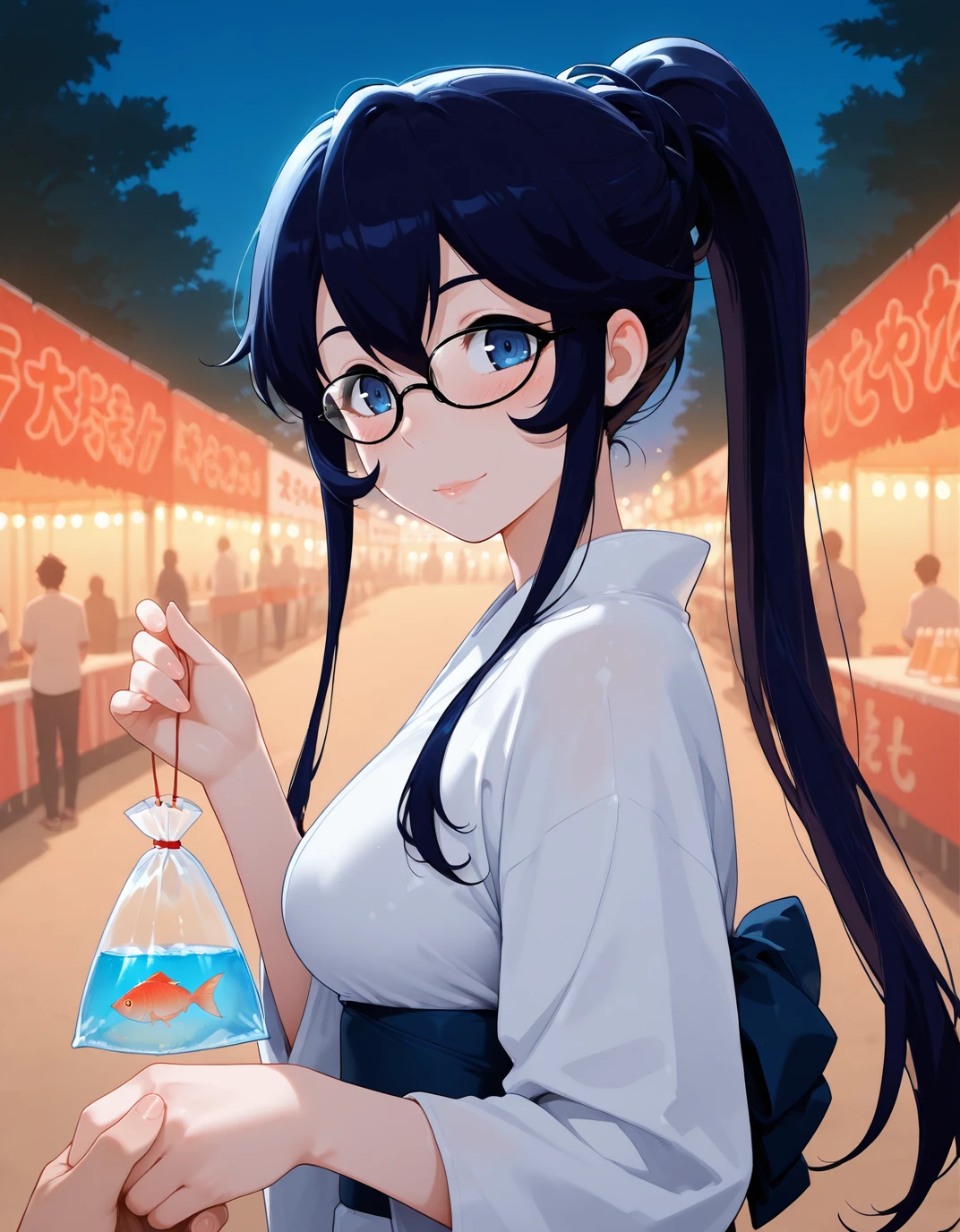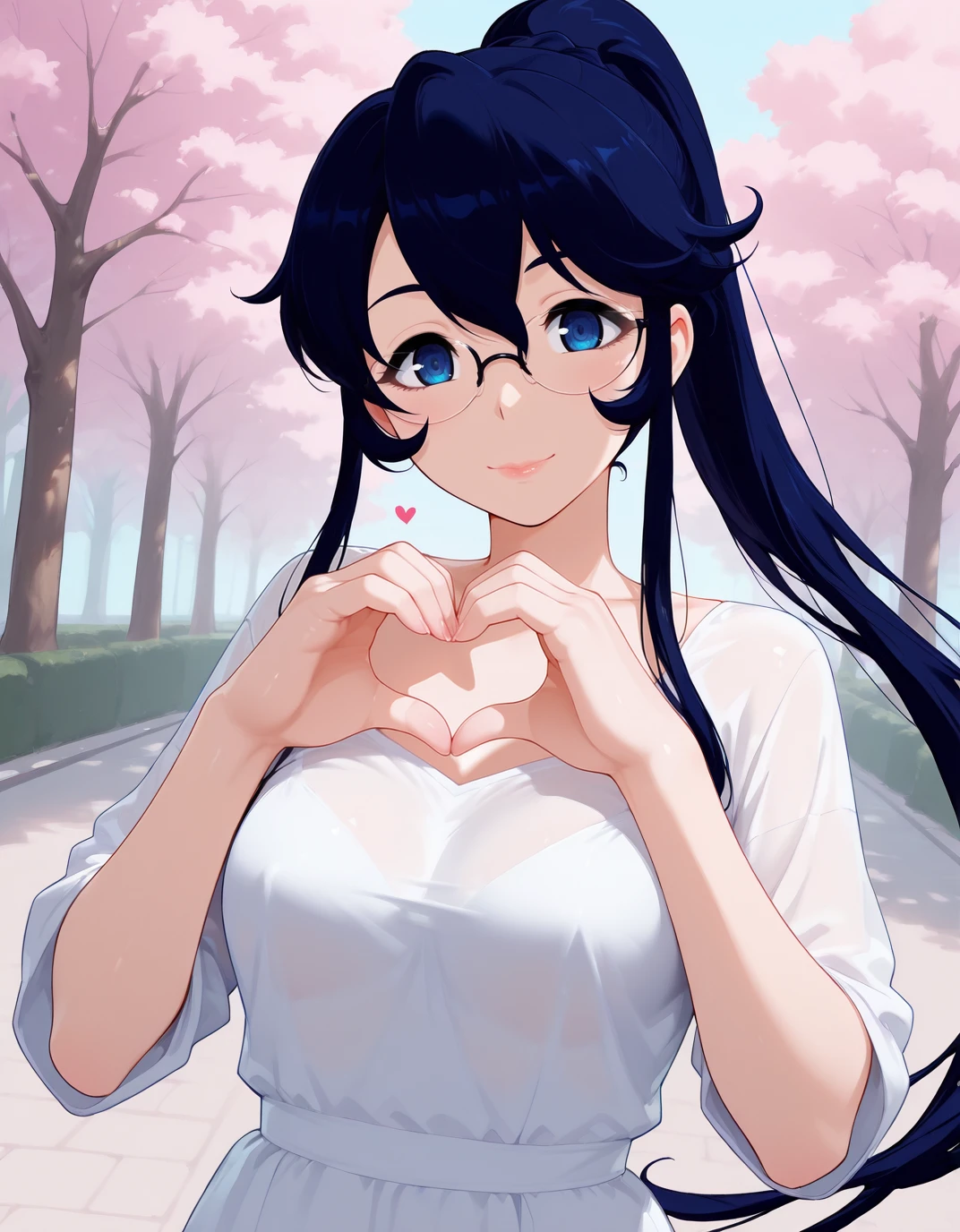 Basic trigger words: dark blue hair, ponytail, hair between eyes, dark blue eyes, glasses, thin lips, medium natural breasts