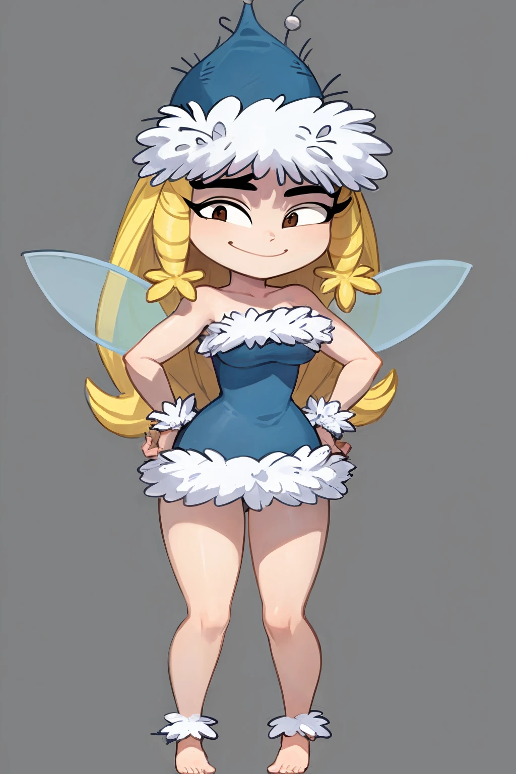Outfit prompts : hat, bare shoulders, blue dress, fur trim, fairy wings, fairy, barefoot