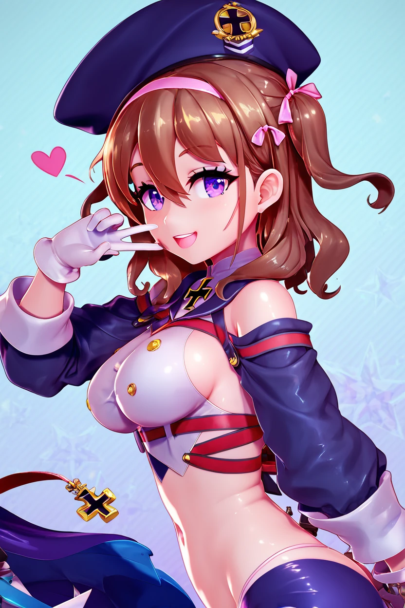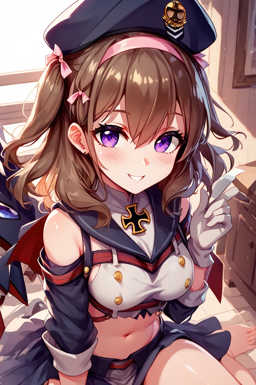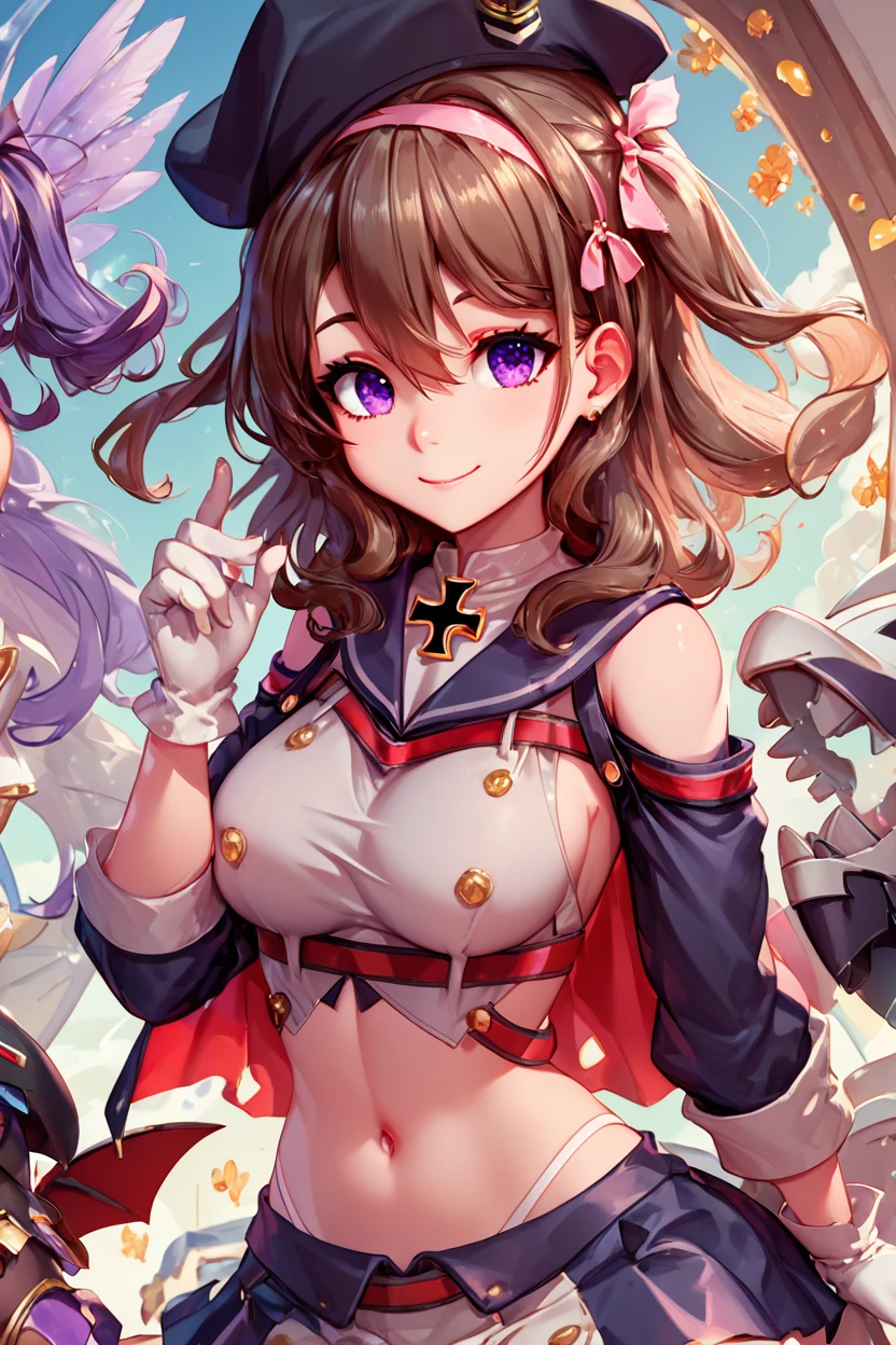 zZ35, hair between eyes, purple eyes, brown hair, hair ribbon, hairband, medium hair, pink hairband, hat, beret, long hair, gloves, white gloves, cross, medium breasts, ribbon, iron cross, midriff,