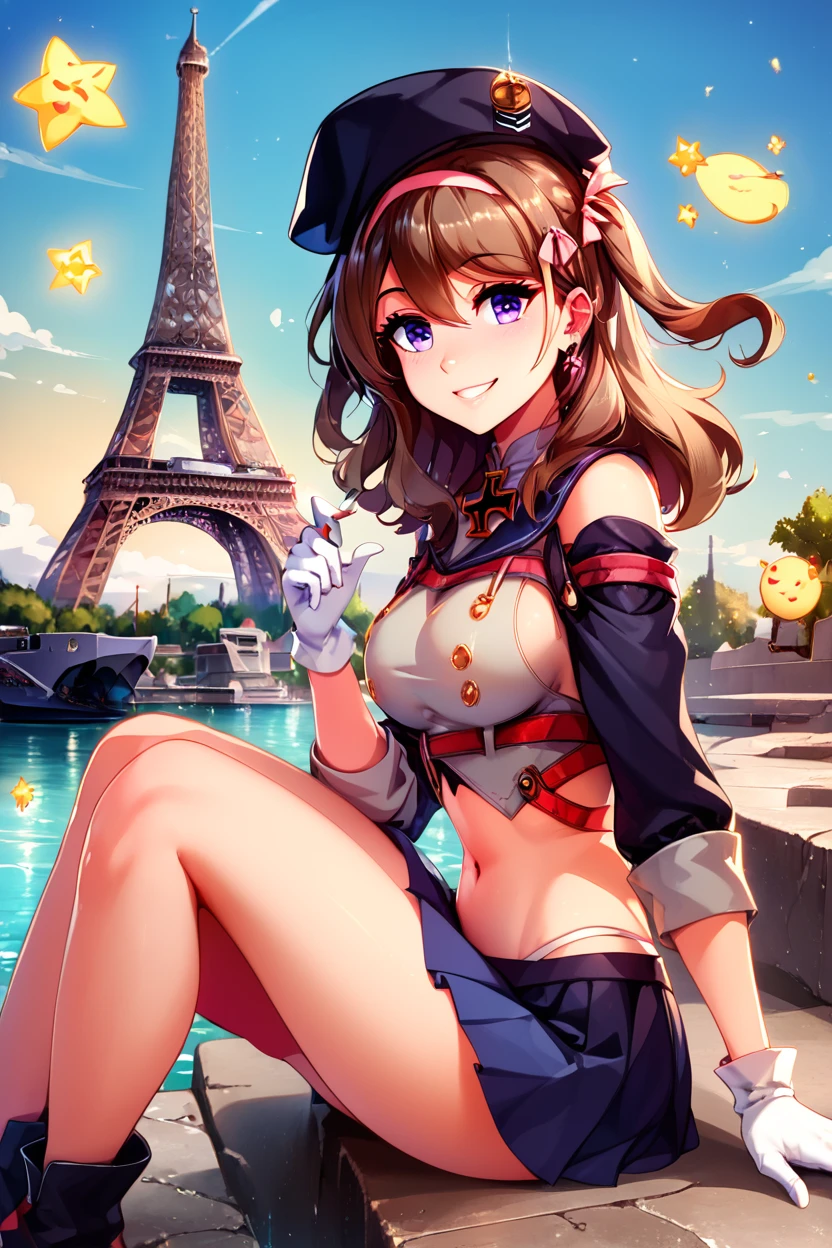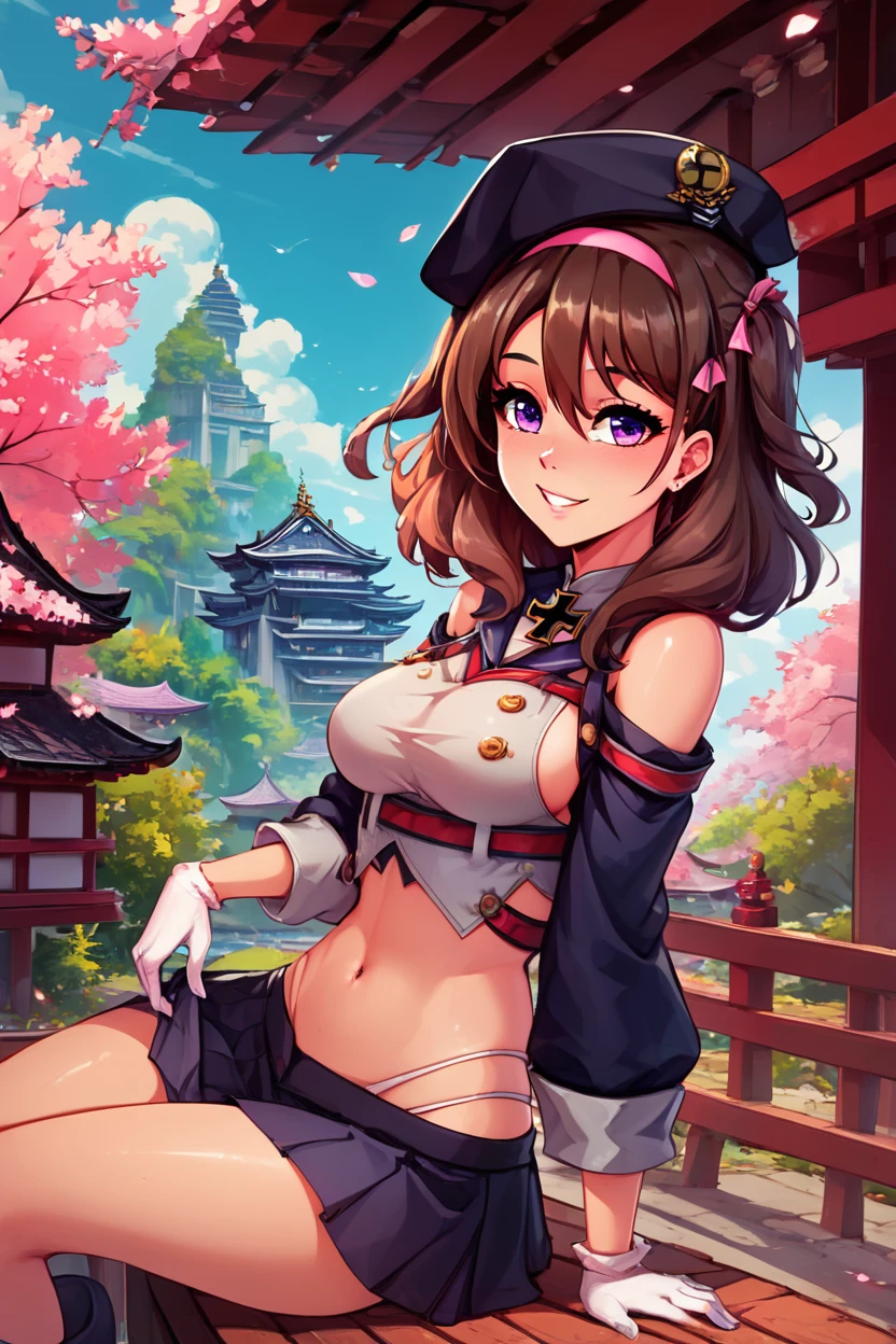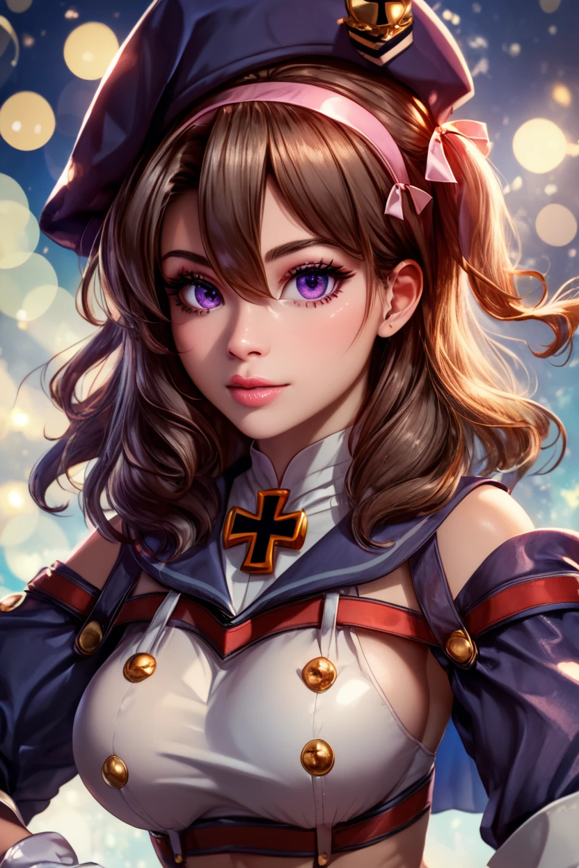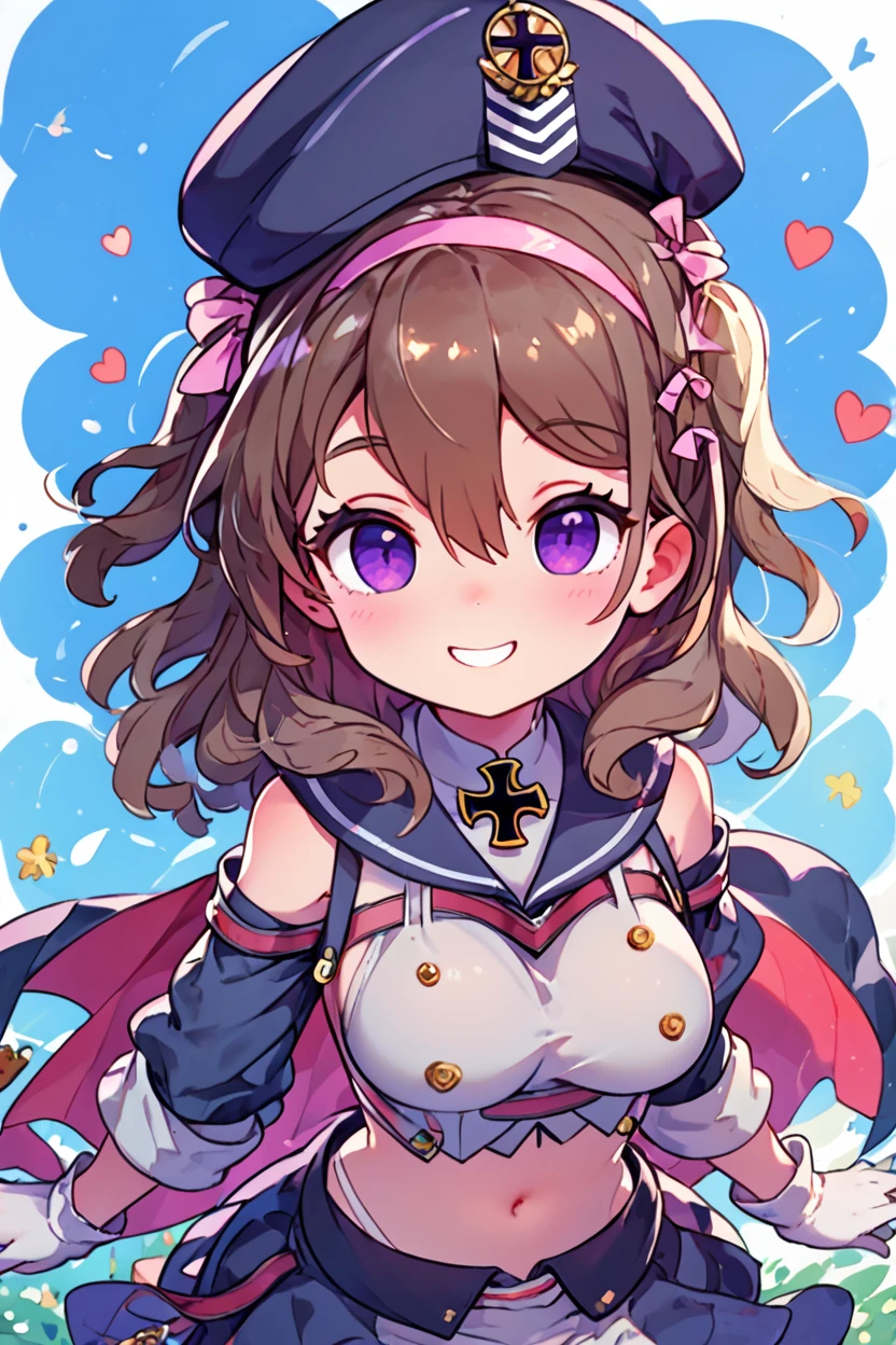 zZ35, hair between eyes, purple eyes, brown hair, hair ribbon, hairband, medium hair, pink hairband, hat, beret, long hair, gloves, white gloves, cross, medium breasts, ribbon, iron cross, midriff,