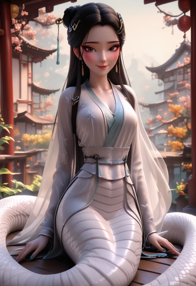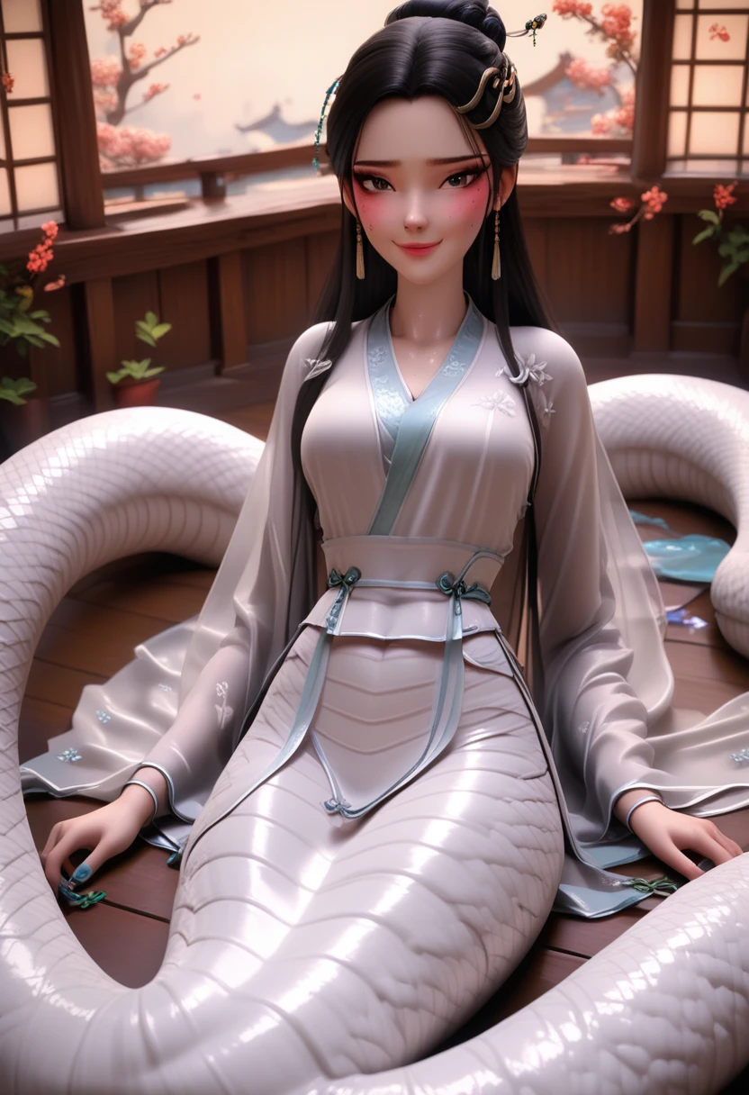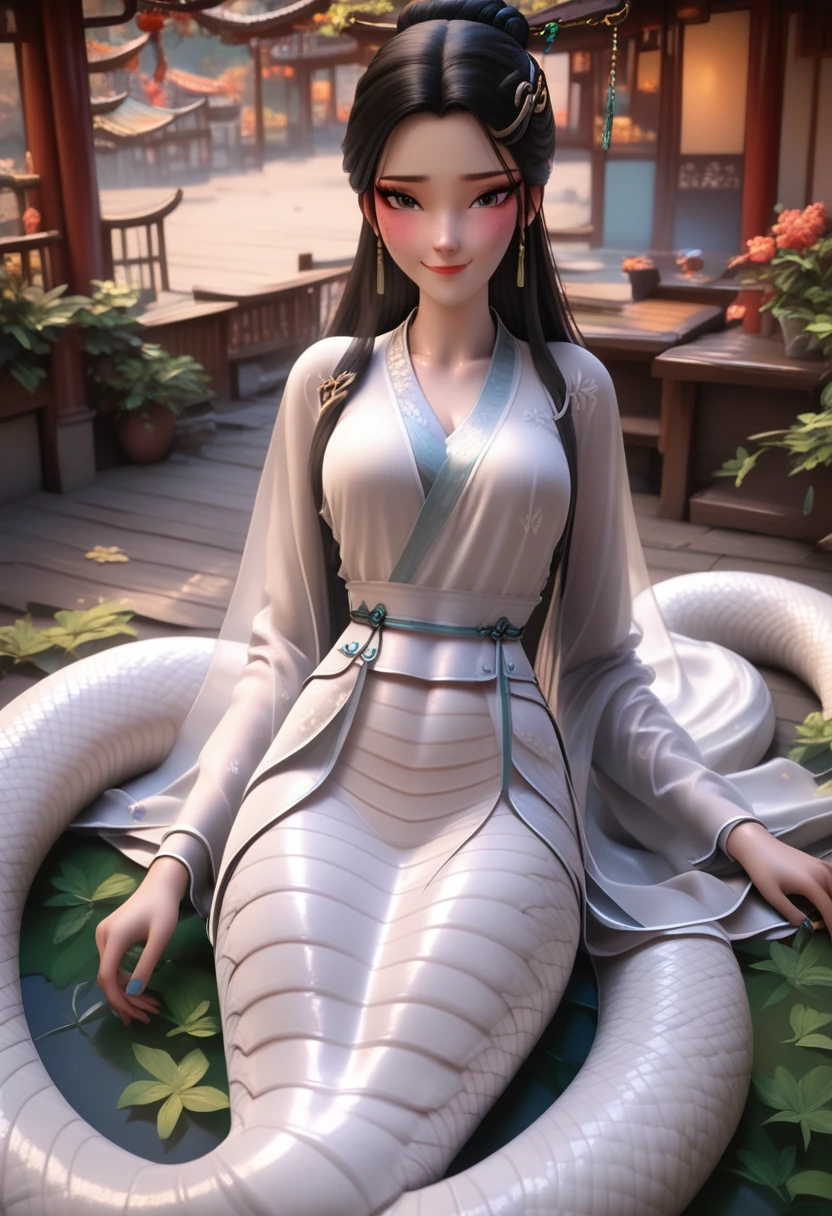 xiao bai,white chinese clothes, long hair, black hair, hair ornament, black eyes, chinese clothes, hair bun, monster girl,lamia, white lamia,