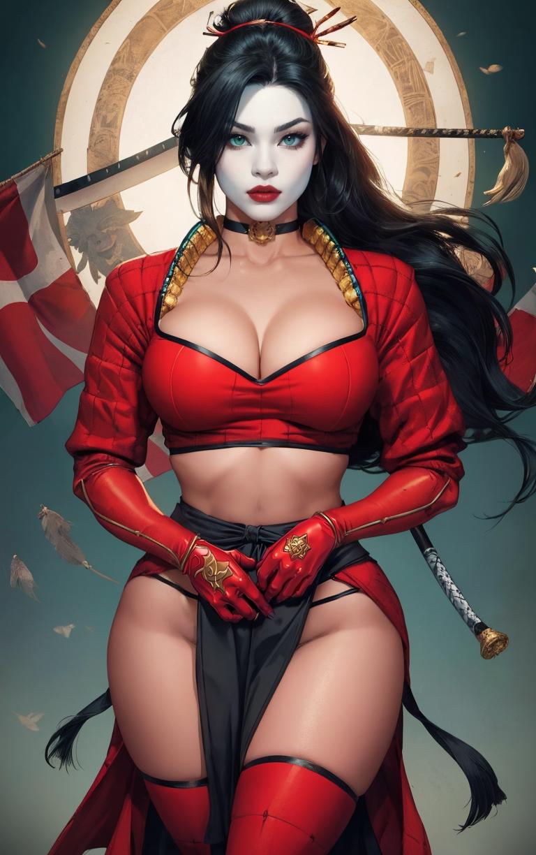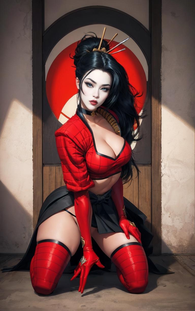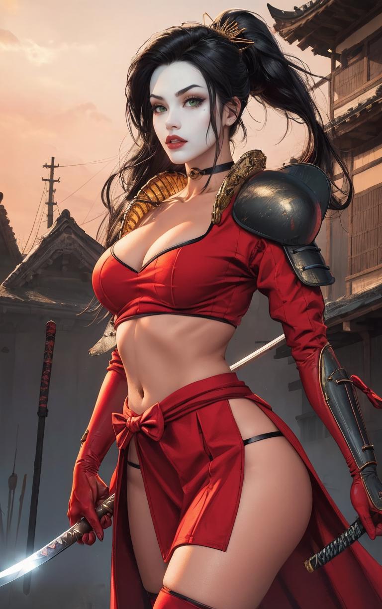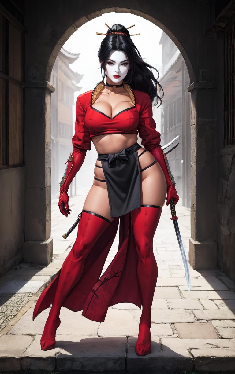 OUTFIT PROMPTSthighhighs, midriff, gloves, choker, navel, armor, crop top, bodysuit, jewelry, skirt, ninja, samurai, red thighhighs, red gloves, pelvic curtain,
