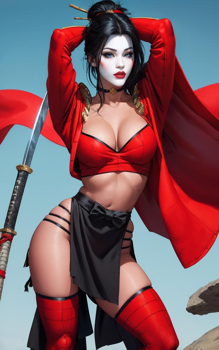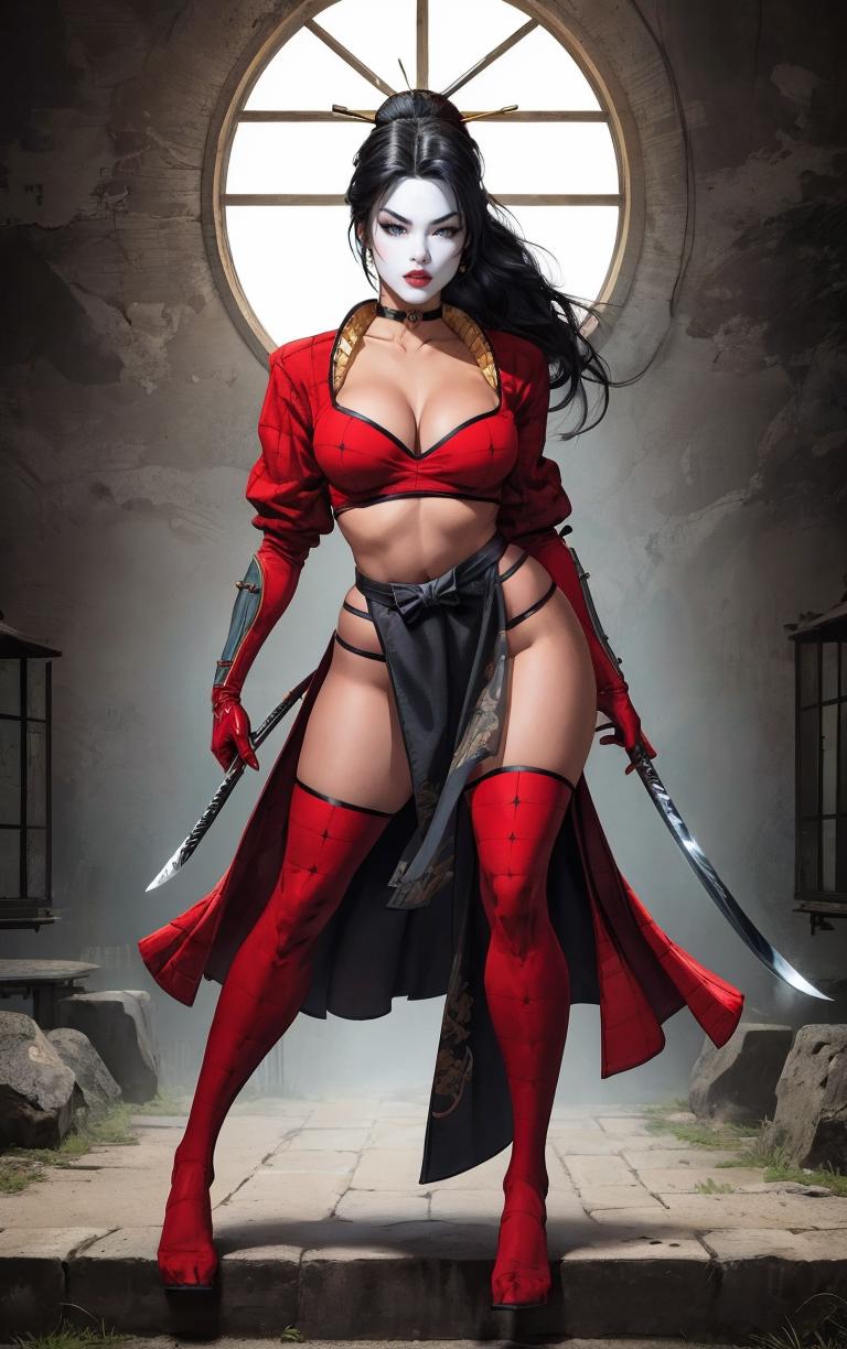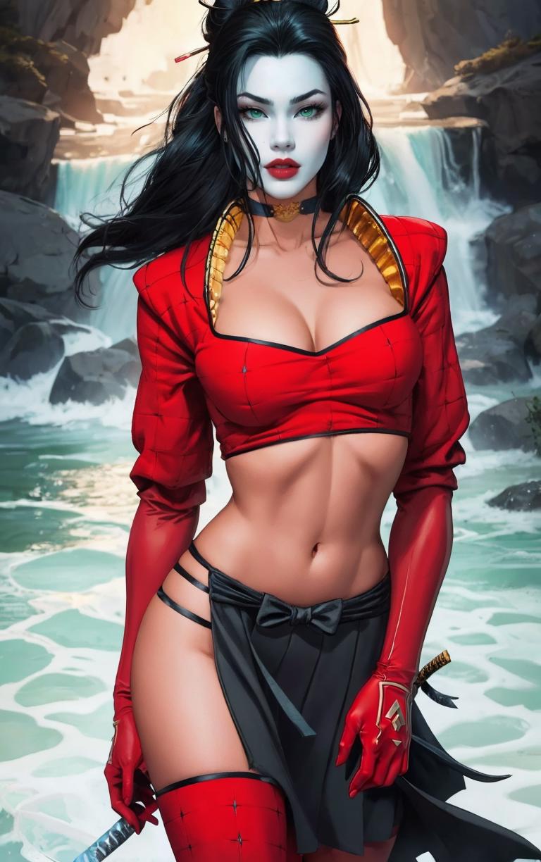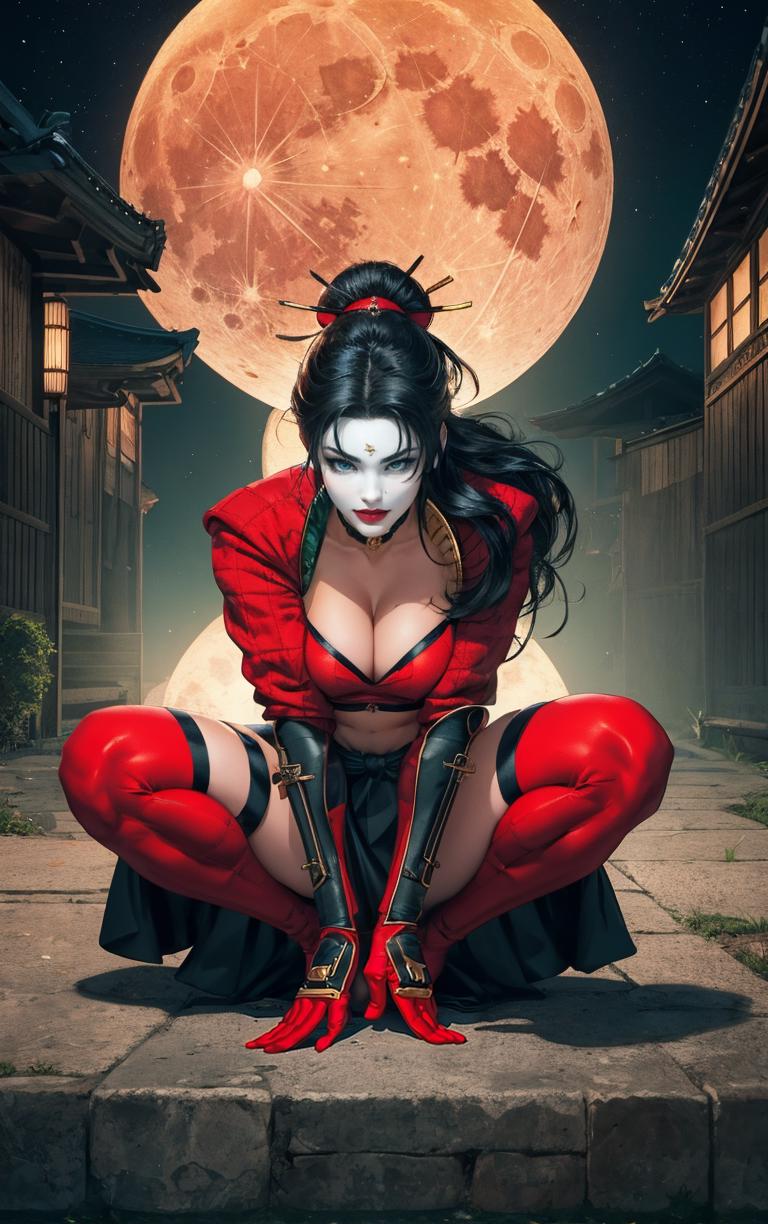 OUTFIT PROMPTSthighhighs, midriff, gloves, choker, navel, armor, crop top, bodysuit, jewelry, skirt, ninja, samurai, red thighhighs, red gloves, pelvic curtain,