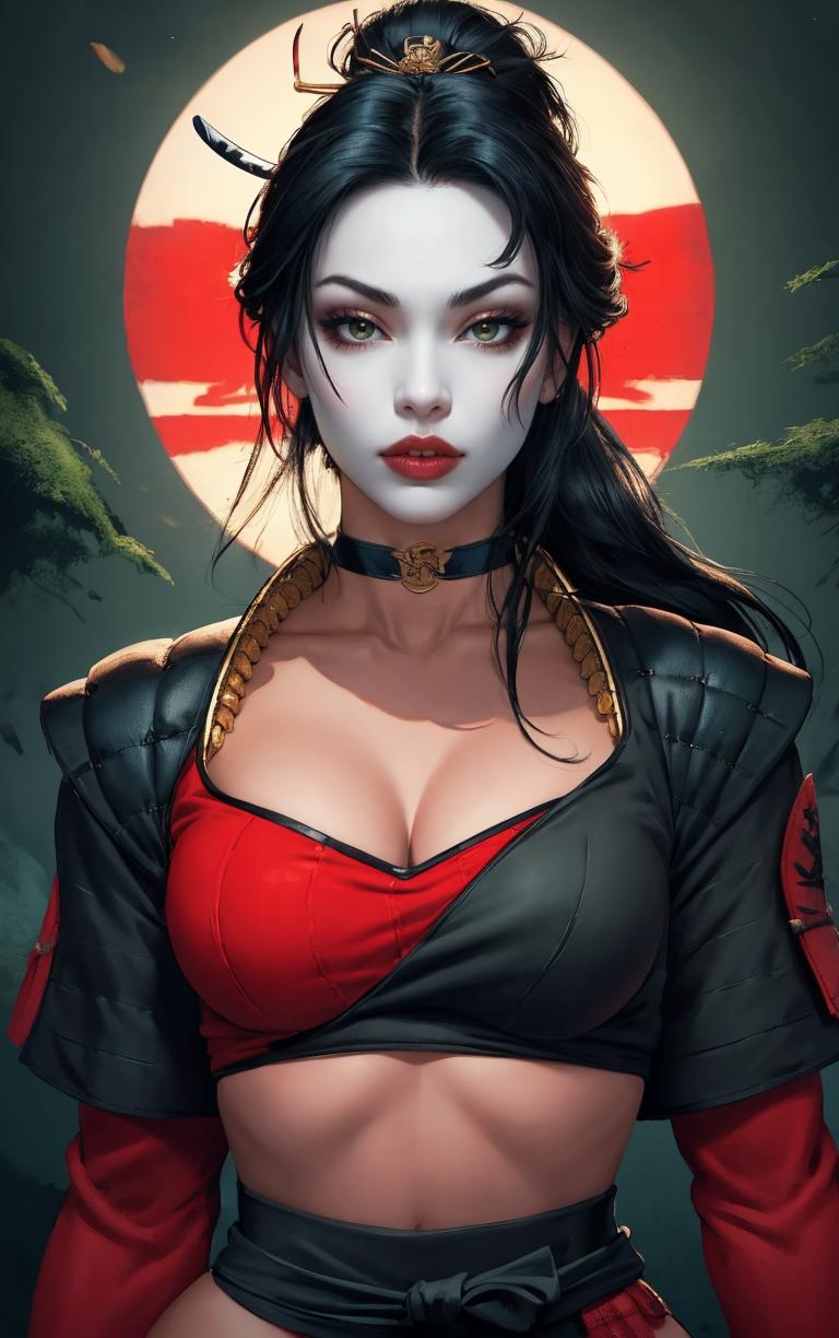 BODY PROMPTS1girl, white mask, black hair, long hair, very long hair, breasts, cleavage, lipstick, makeup, lips, green eyes, large breasts, red lips, hair ornament, hair_stick, mask, tattoo, colored skin, ponytail,