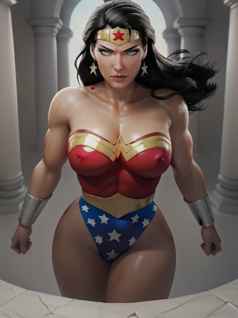 Hero Prompt: Diana, 1girl, long hair, tiara, blue eyes, leotard, star (symbol), boots, bracers, black hair,
