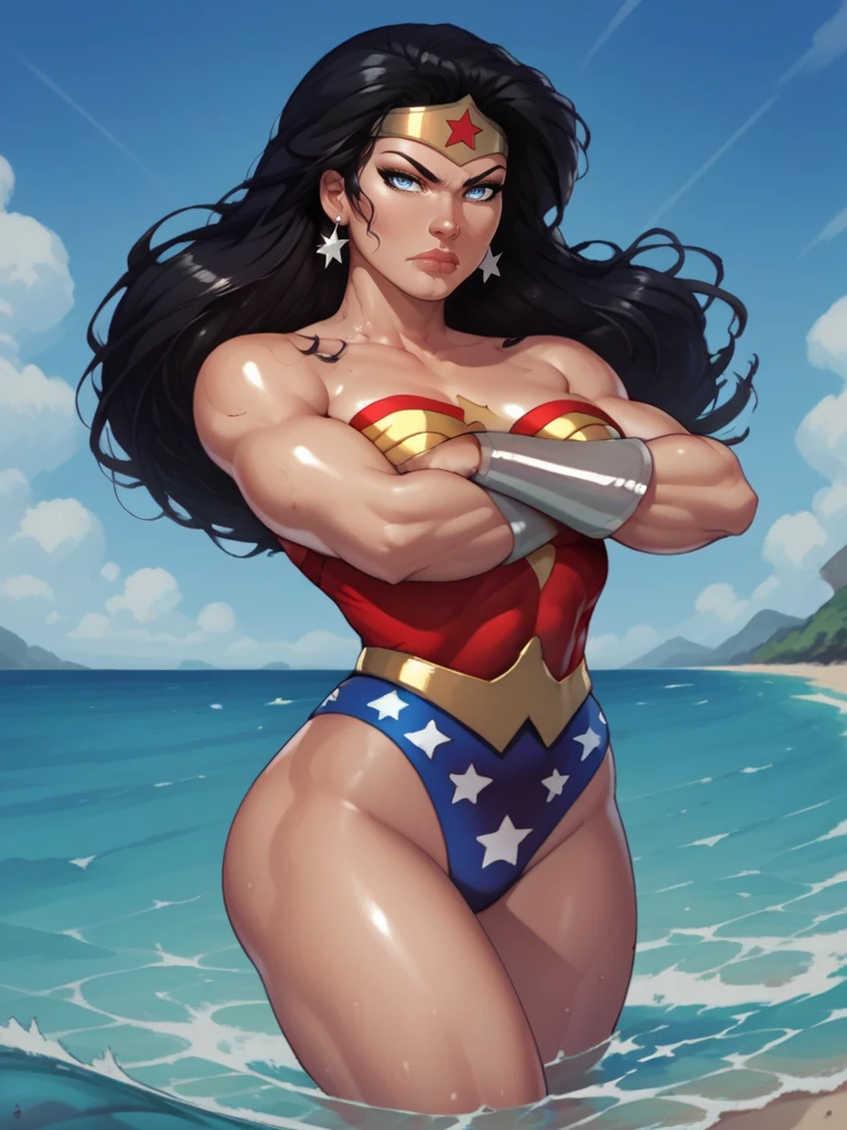 Diana, 1girl, long hair, tiara, blue eyes, leotard, star (symbol), boots, bracers, black hair,