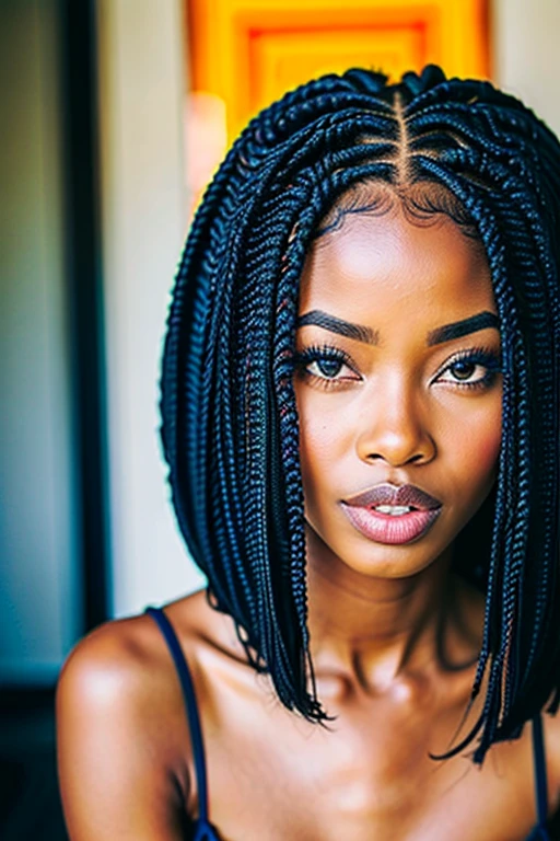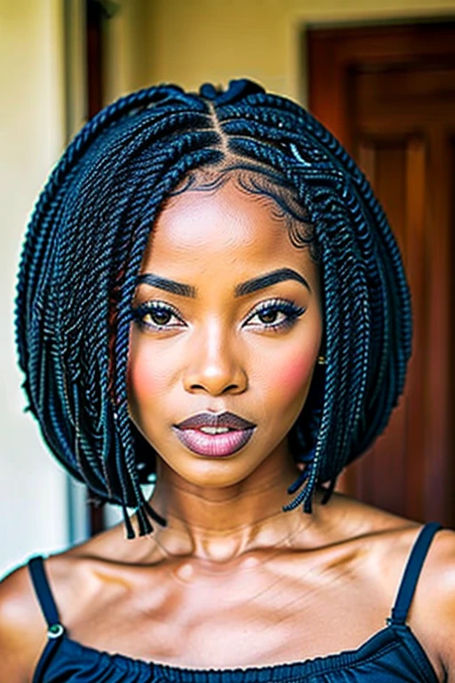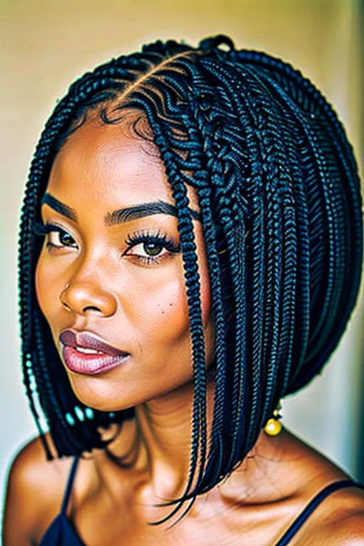 a african woman black skin , realstic , bob hairstyle braids beautifull looking to view , portrait