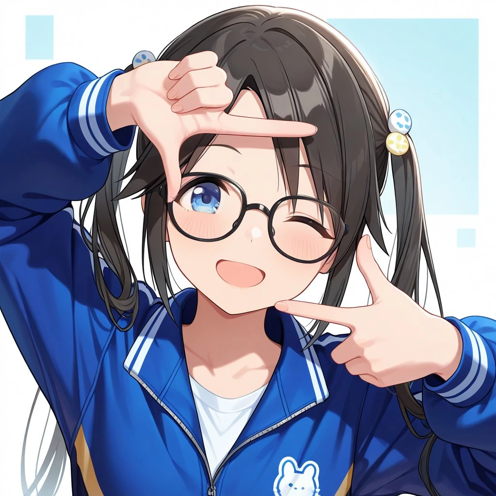 long hair, blue eyes, black hair, hair ornament,glasses,twintails,small breasts