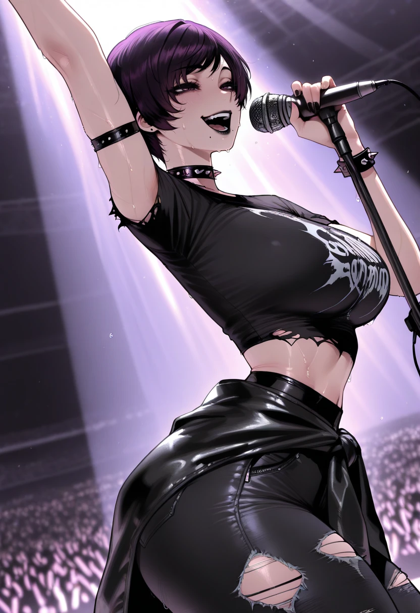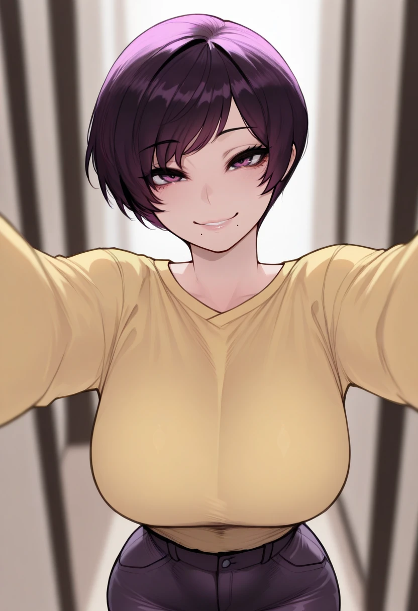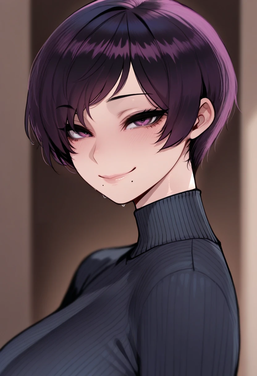 K0reM0m, short hair, pixie cut, purple hair, purple eyes, mole under mouth, swept bangs,