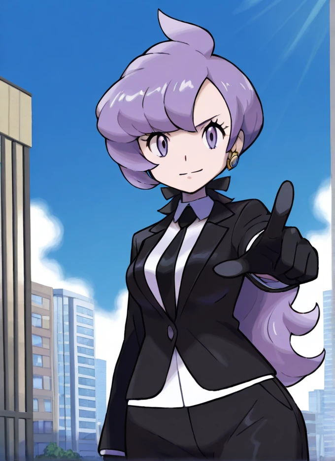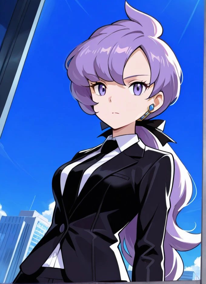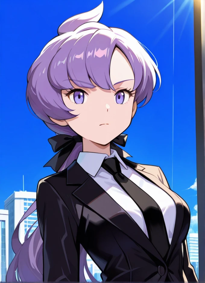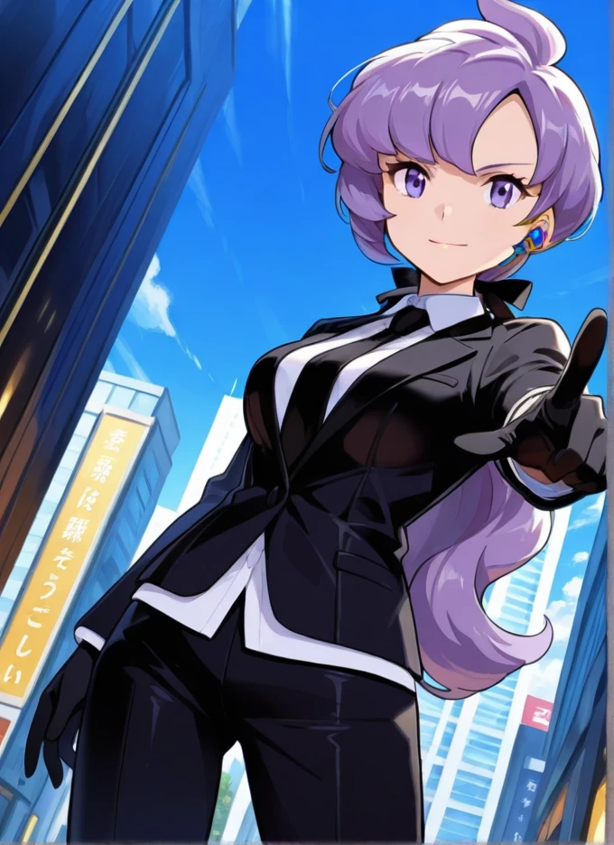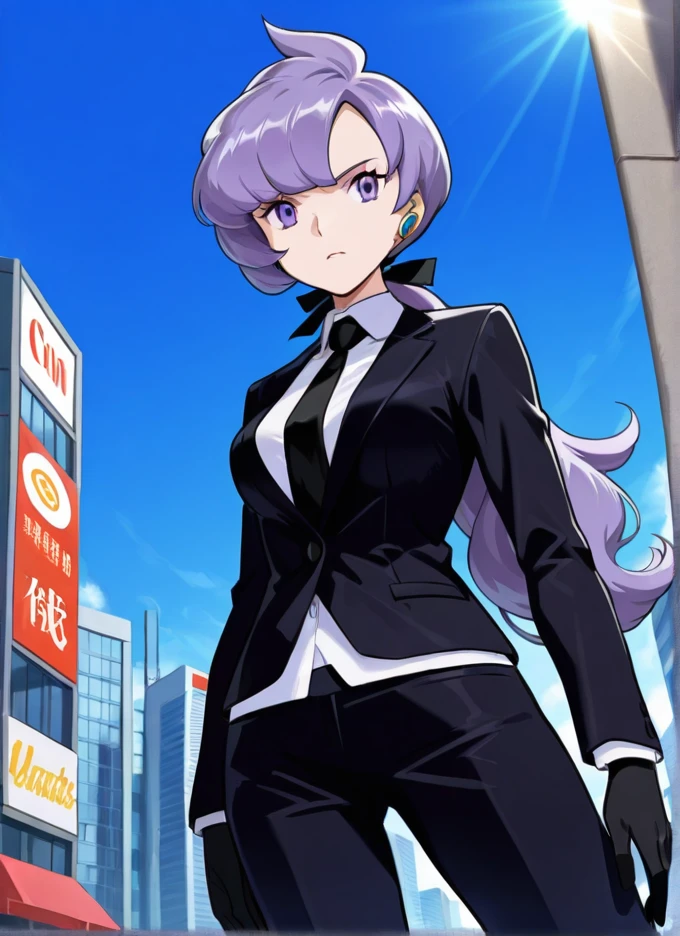 Adult: anabel, 1girl, solo, purple eyes, long hair, purple hair, long ponytail, black gloves, black jacket, ??????????????, necktie, white shirt, formal, suit, bangs, ribbon